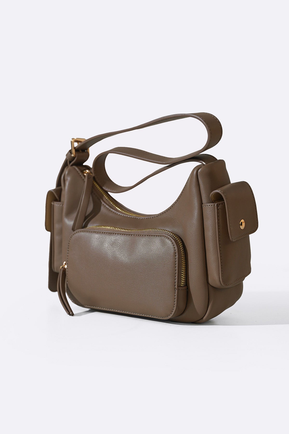 Butter soft functional shoulder bag with gold accessories, a phone pocket on the front, two mini pockets on the sides and a slip pocket on the back. The main section has a zip on top and two inner pockets to hold your belongings.
