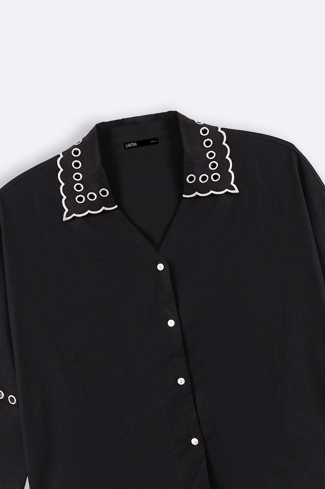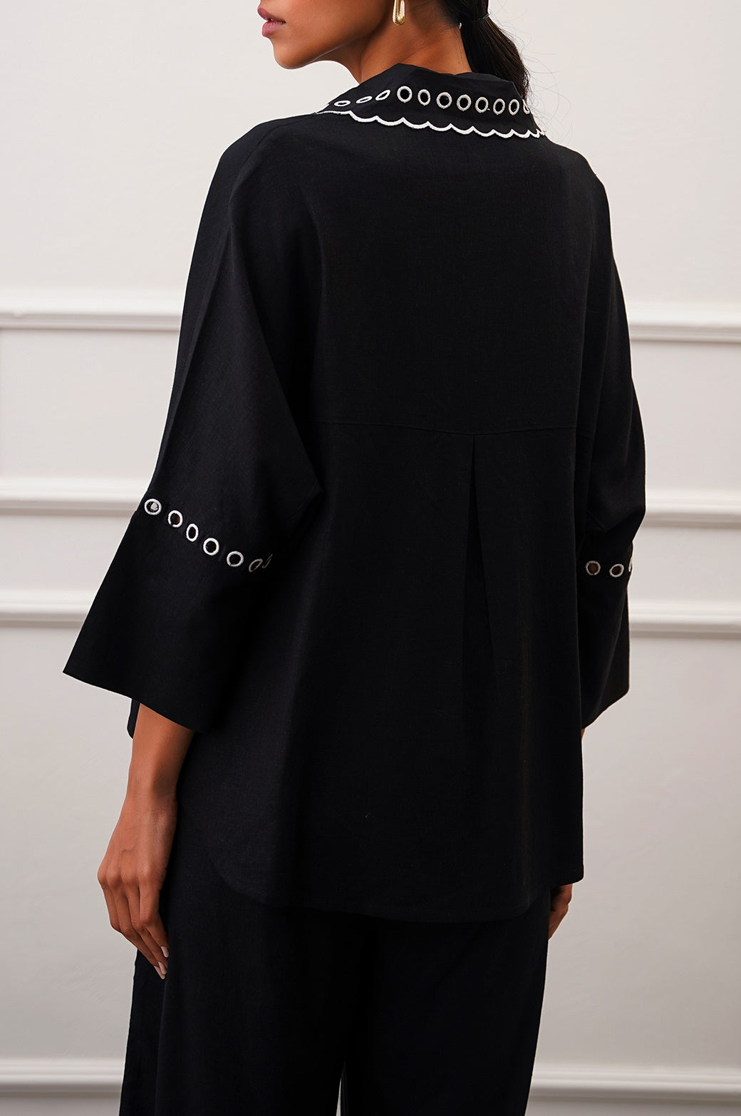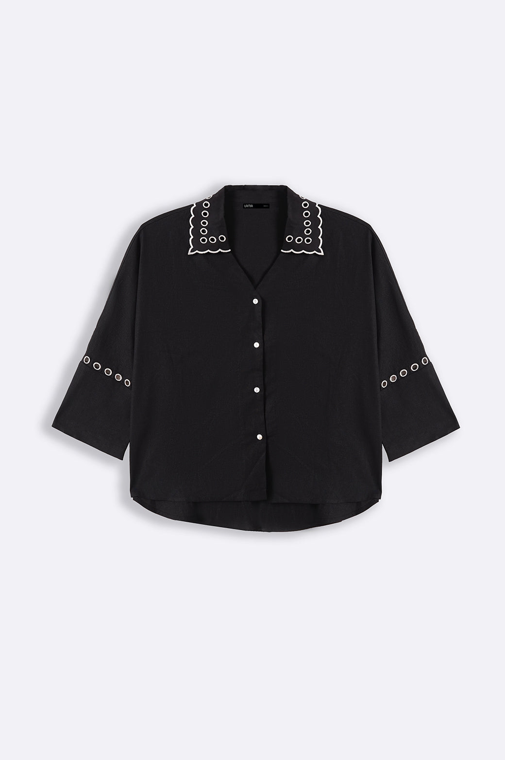 Design details: A V-neck button-down blouse featuring an eyelet-embroidered collar and three-quarter sleeves. It includes a front button closure adorned with pearl buttons, and the back is designed with a yoke and a box pleat.