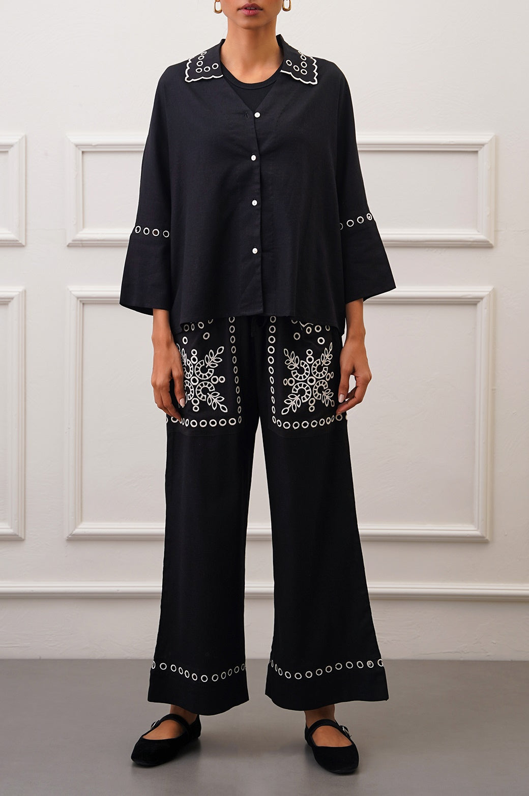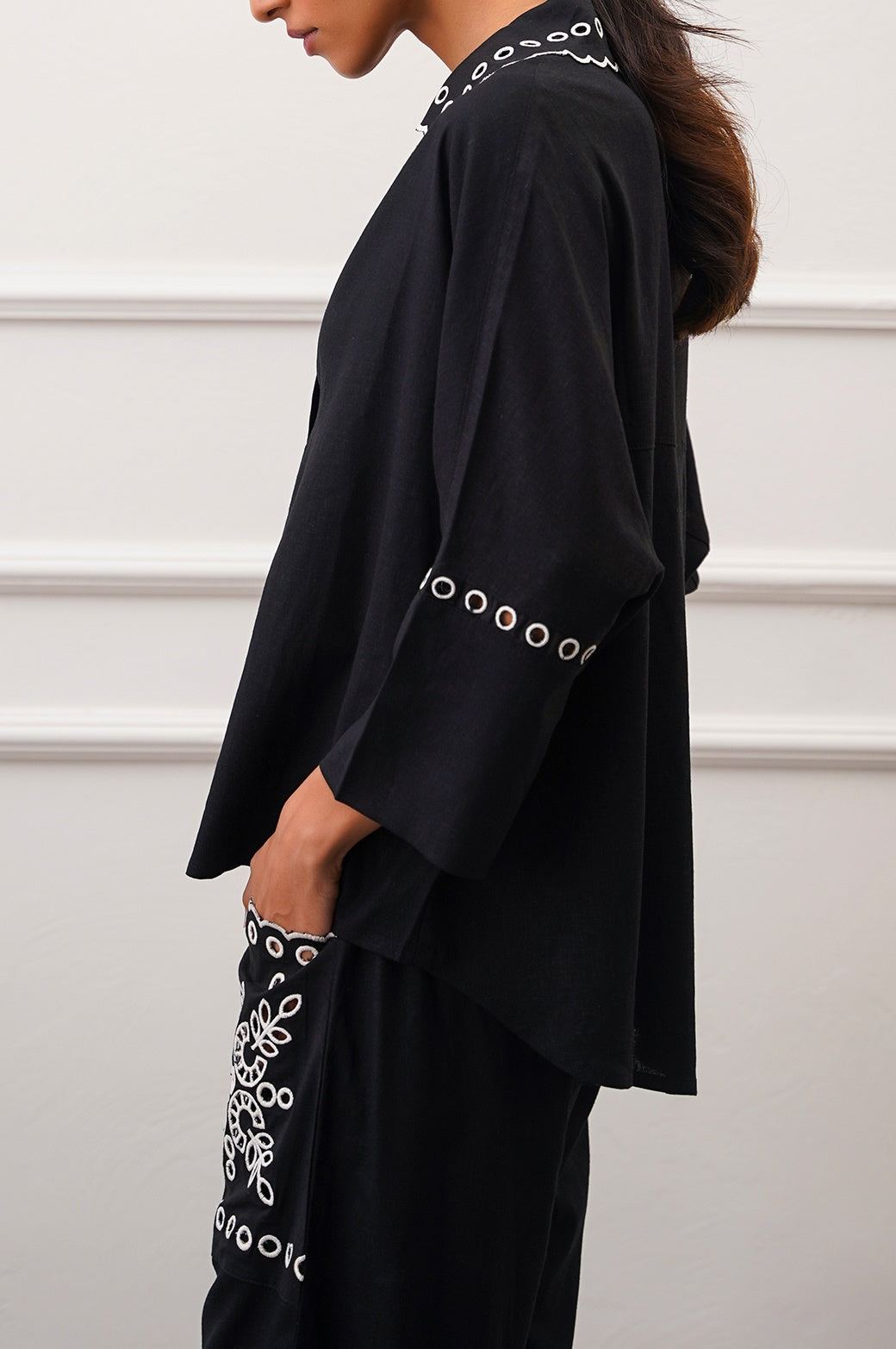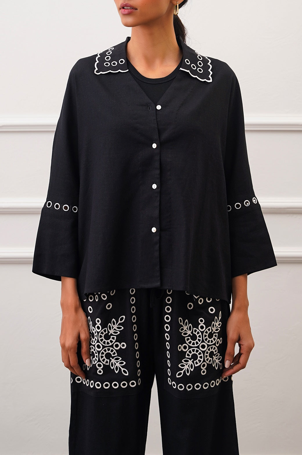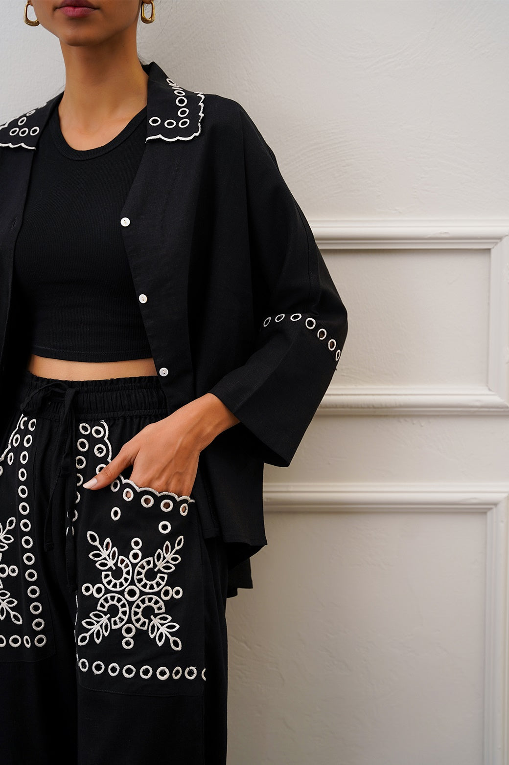 Design details: A V-neck button-down blouse featuring an eyelet-embroidered collar and three-quarter sleeves. It includes a front button closure adorned with pearl buttons, and the back is designed with a yoke and a box pleat.