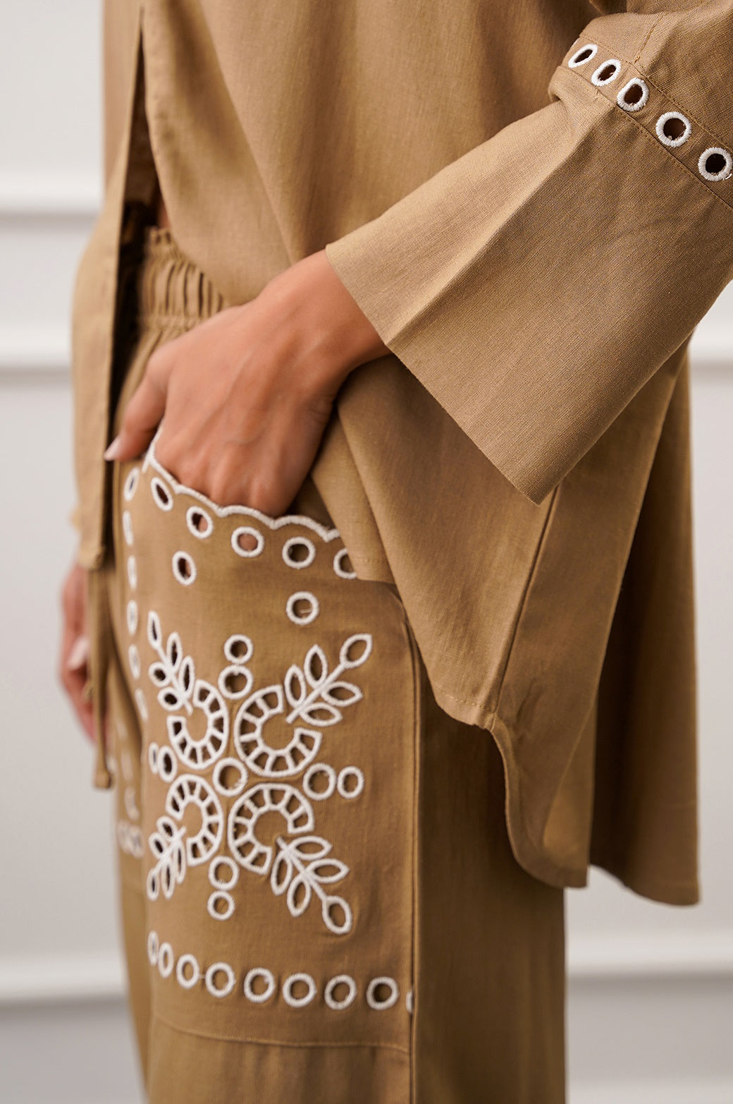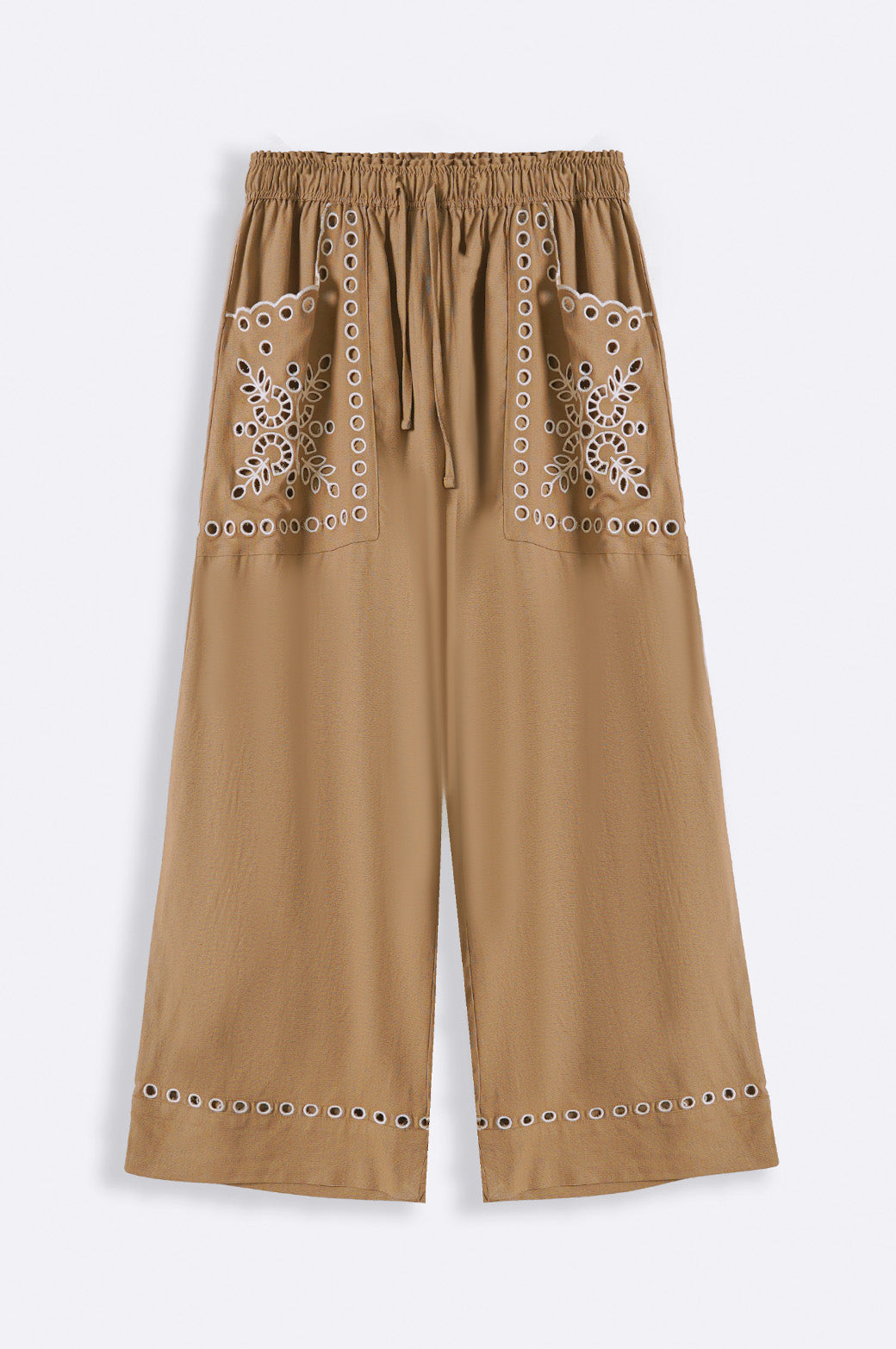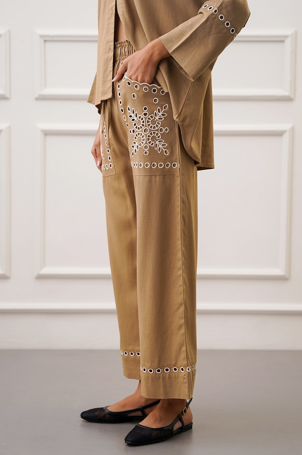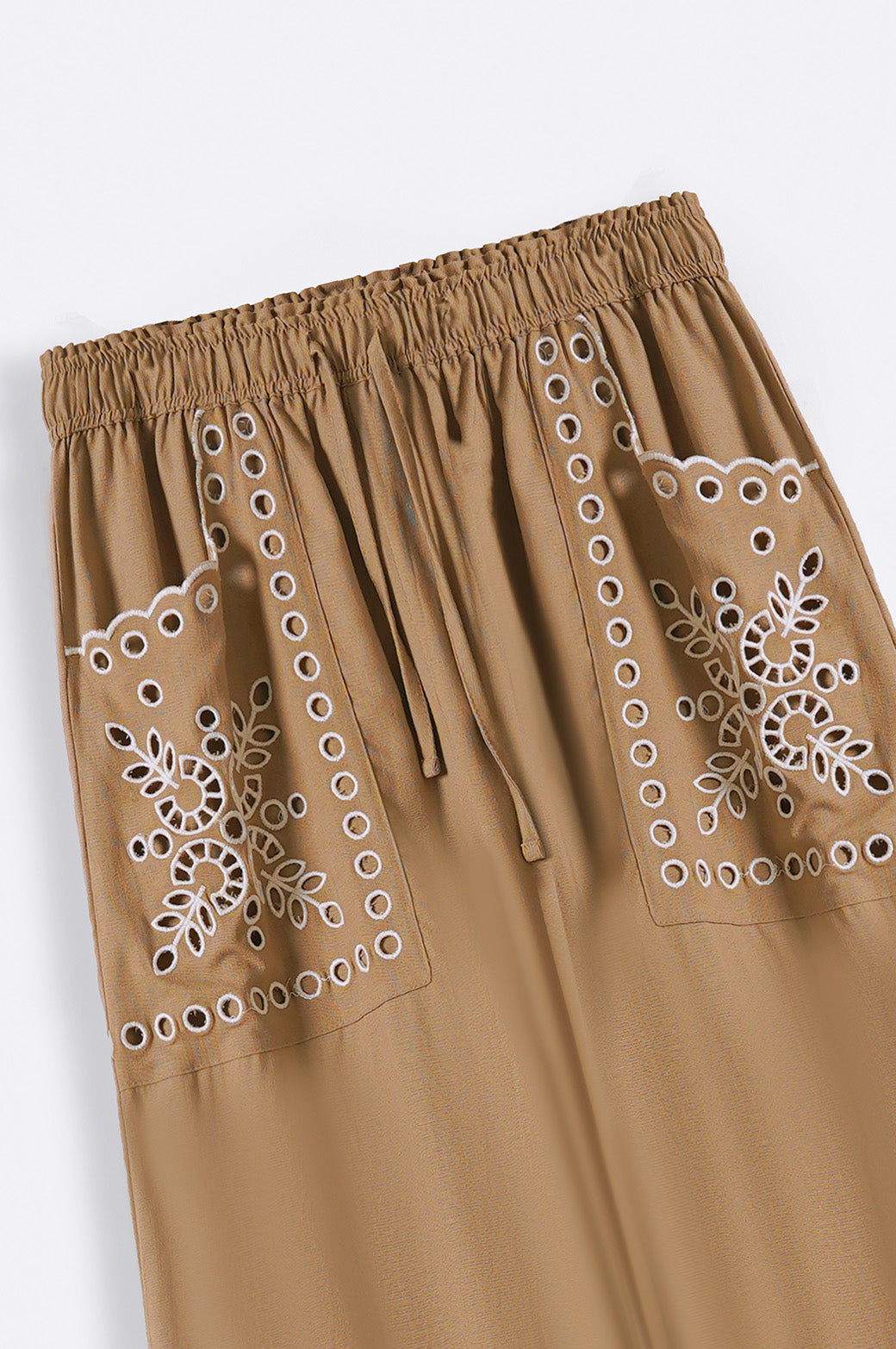 Design details: Mid-rise straight-leg trousers featuring eyelet embroidery on the pockets and hem. They come with an elasticated waistband and adjustable drawstrings.