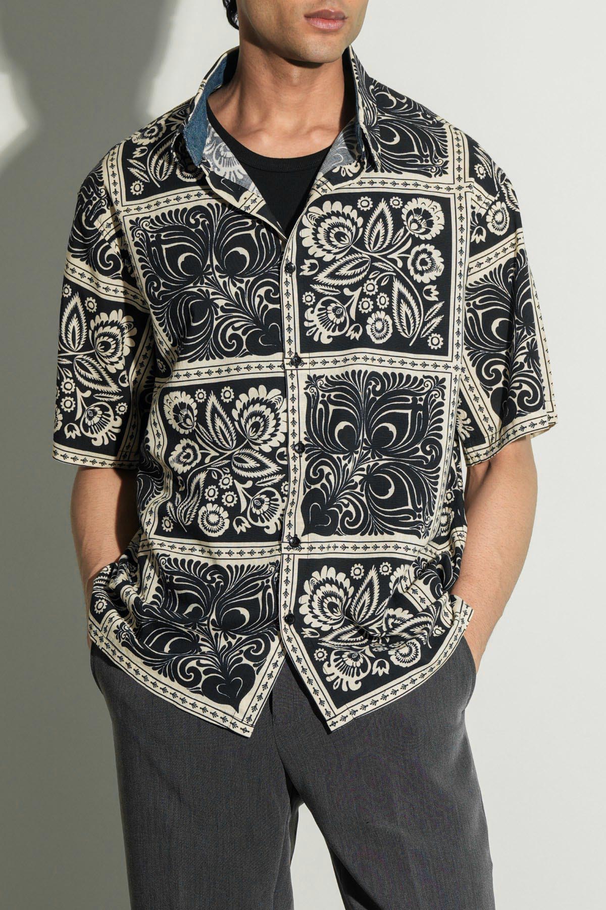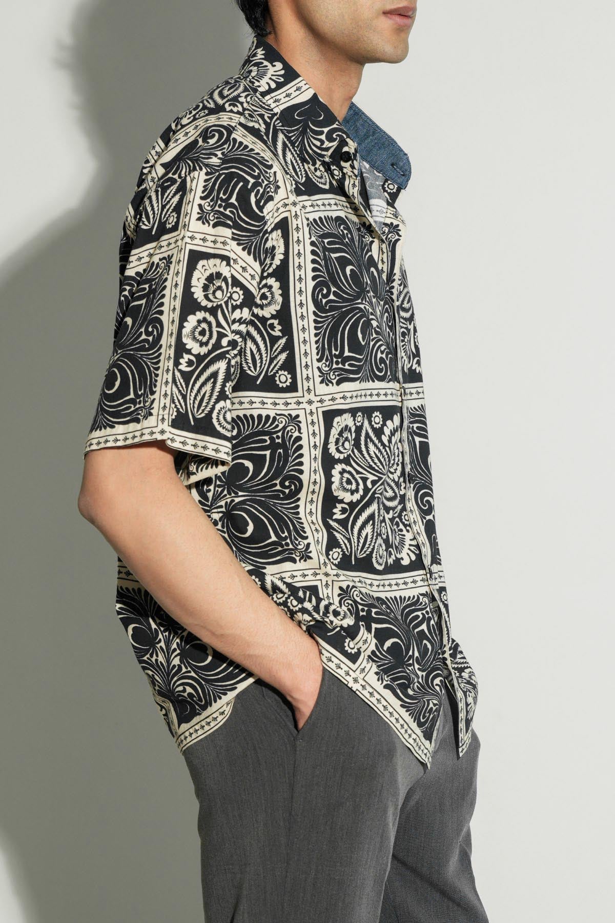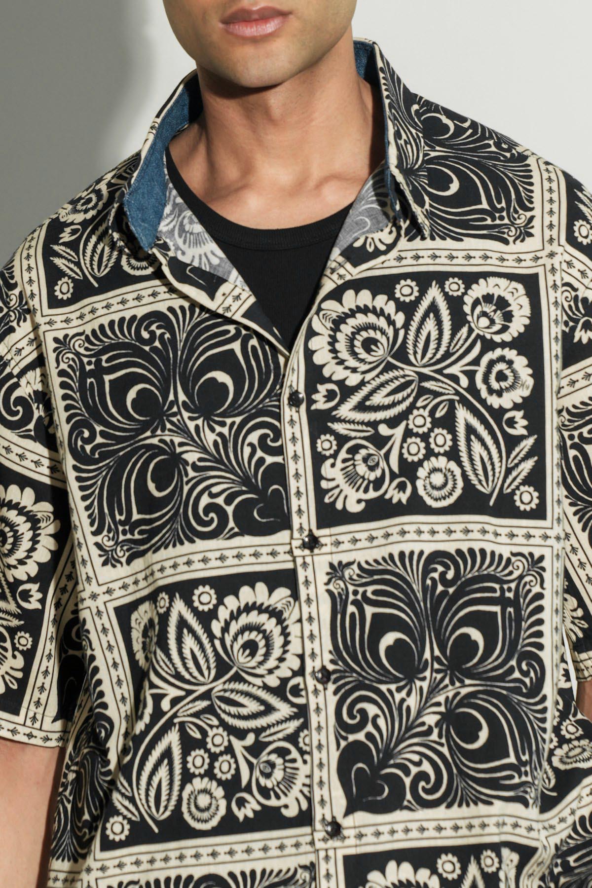 Design details: Printed half sleeves shirt with a contrast denim collar band.