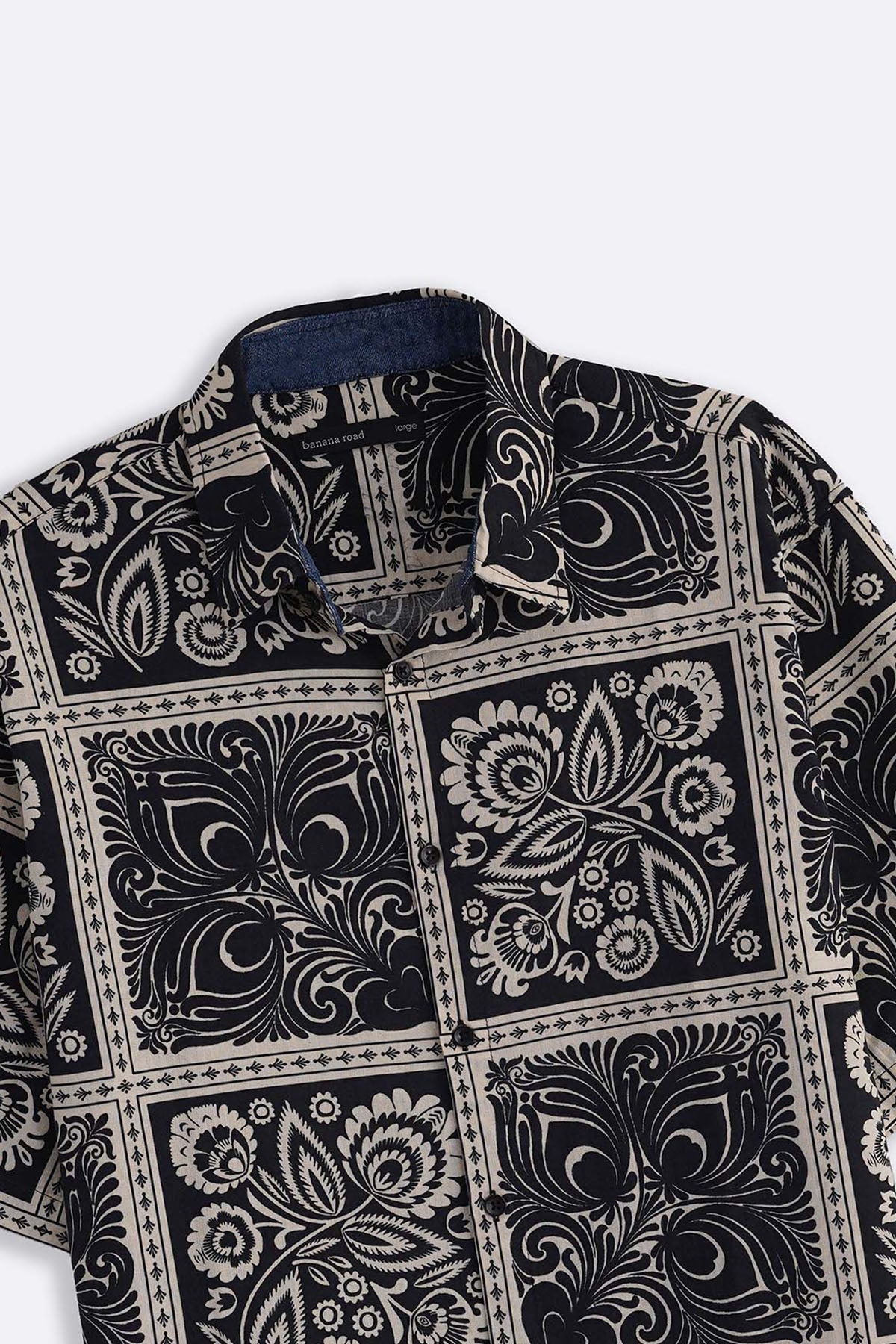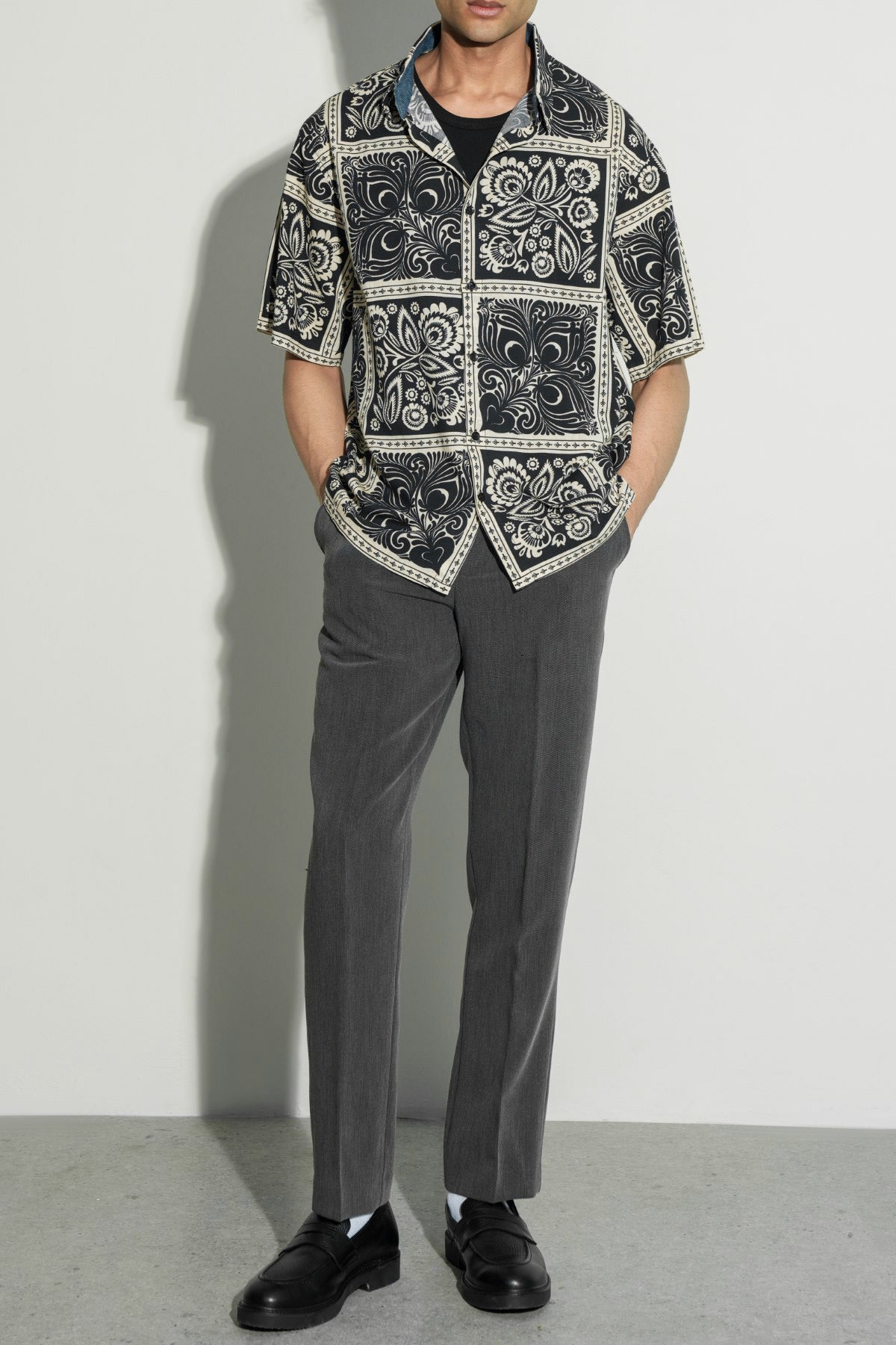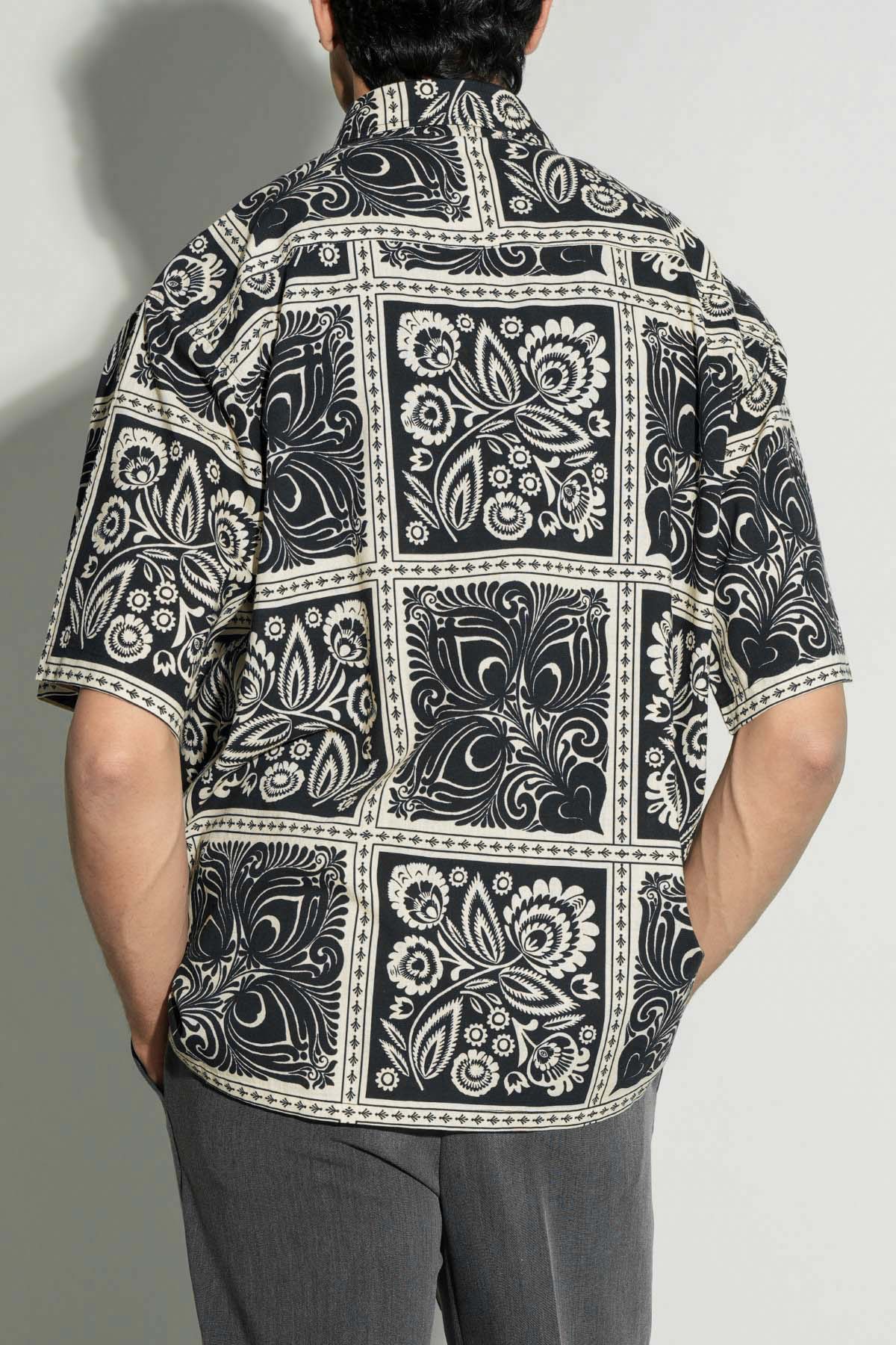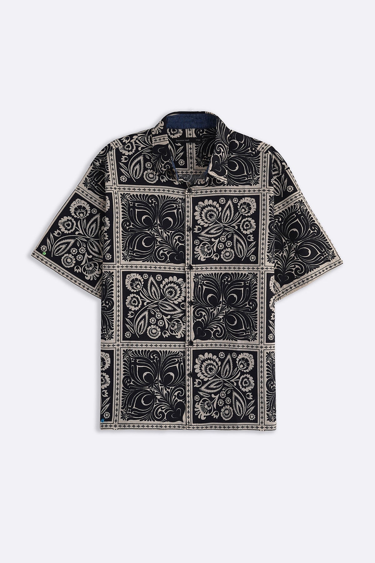 Design details: Printed half sleeves shirt with a contrast denim collar band.