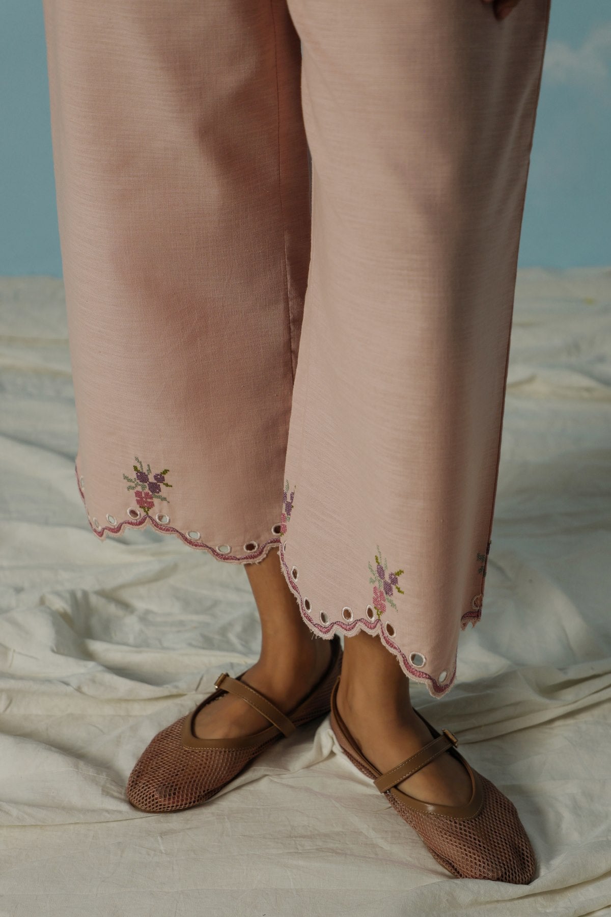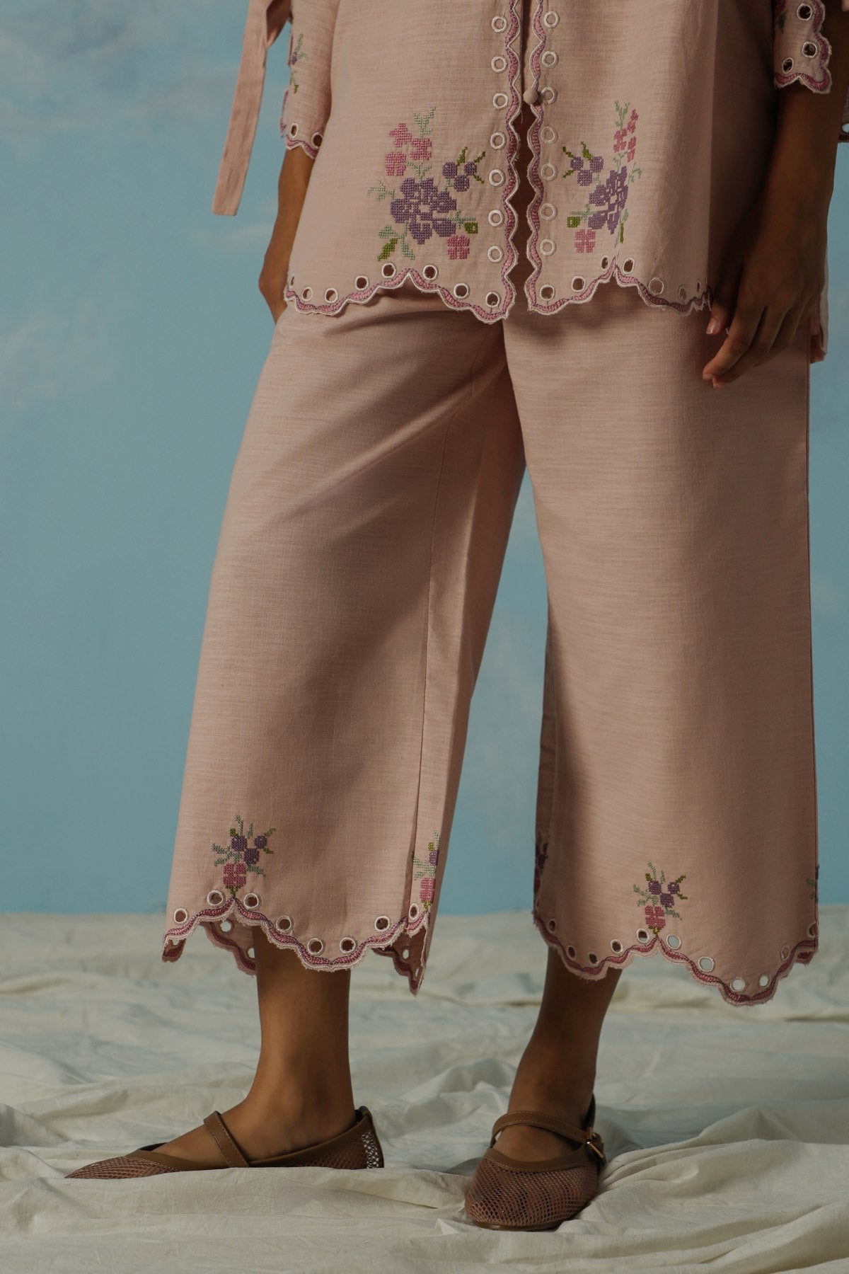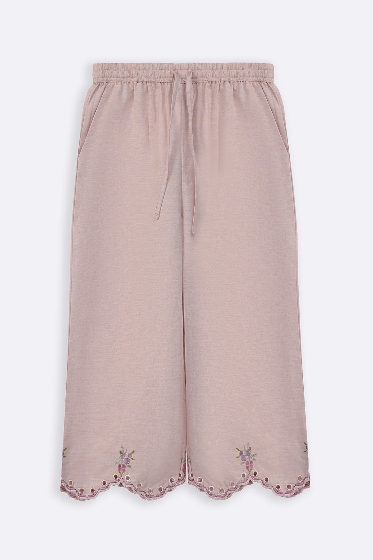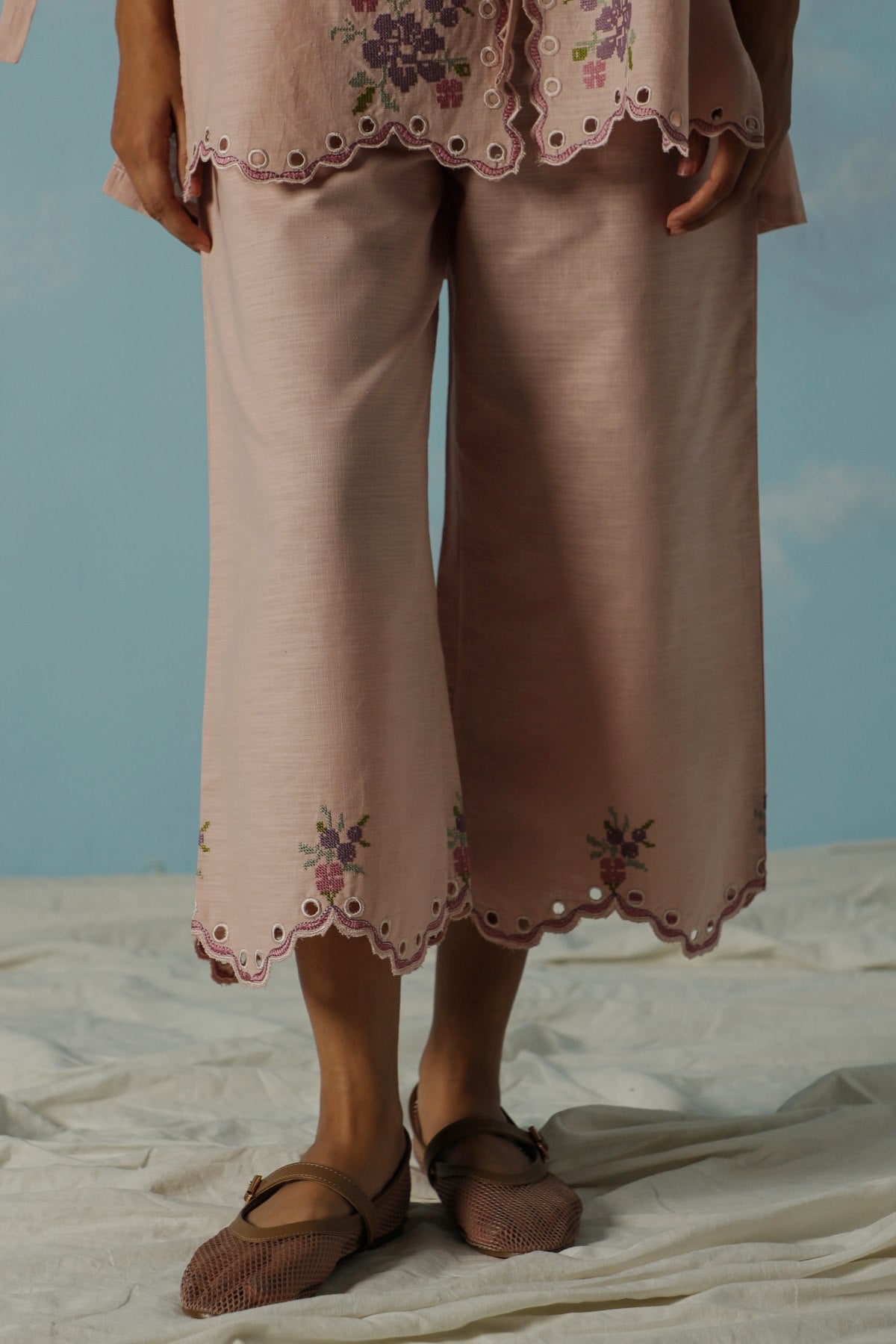 Design details: Cross stitch eyelet embroidered culotte featuring scalloped hems, front side pockets, and a fully elasticated waistband with drawstrings.