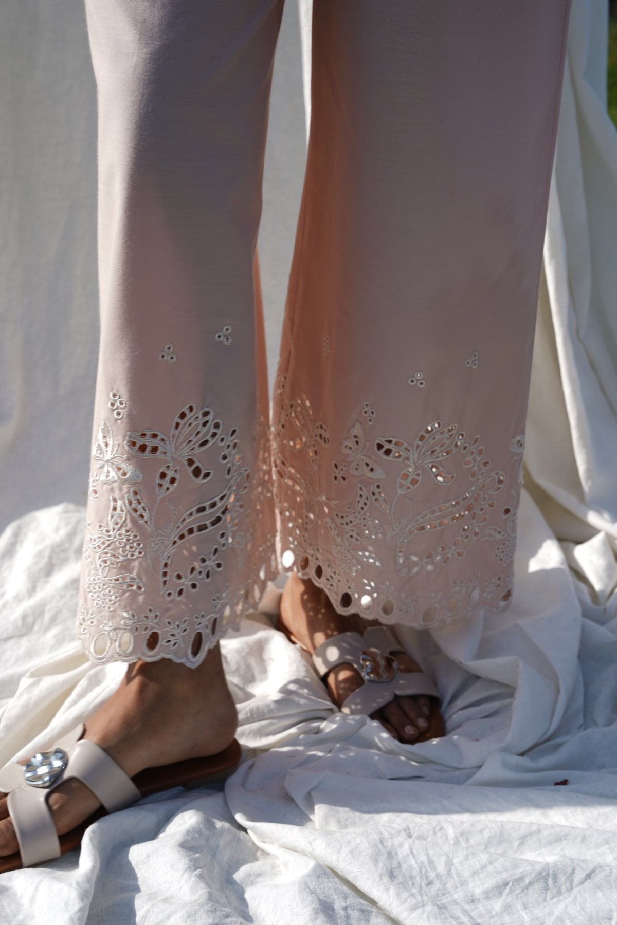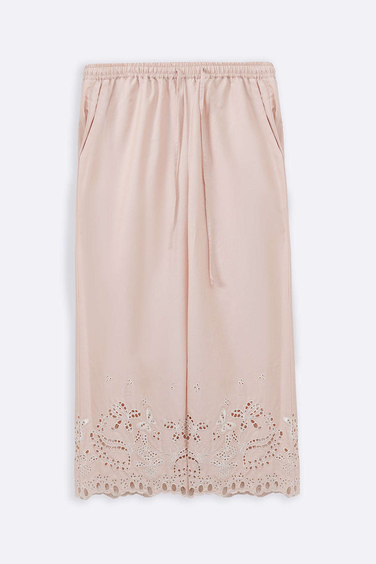 Design details: Cutwork embroidered wide leg pants with front side pockets and an all around elastciated waistband with drawstring.