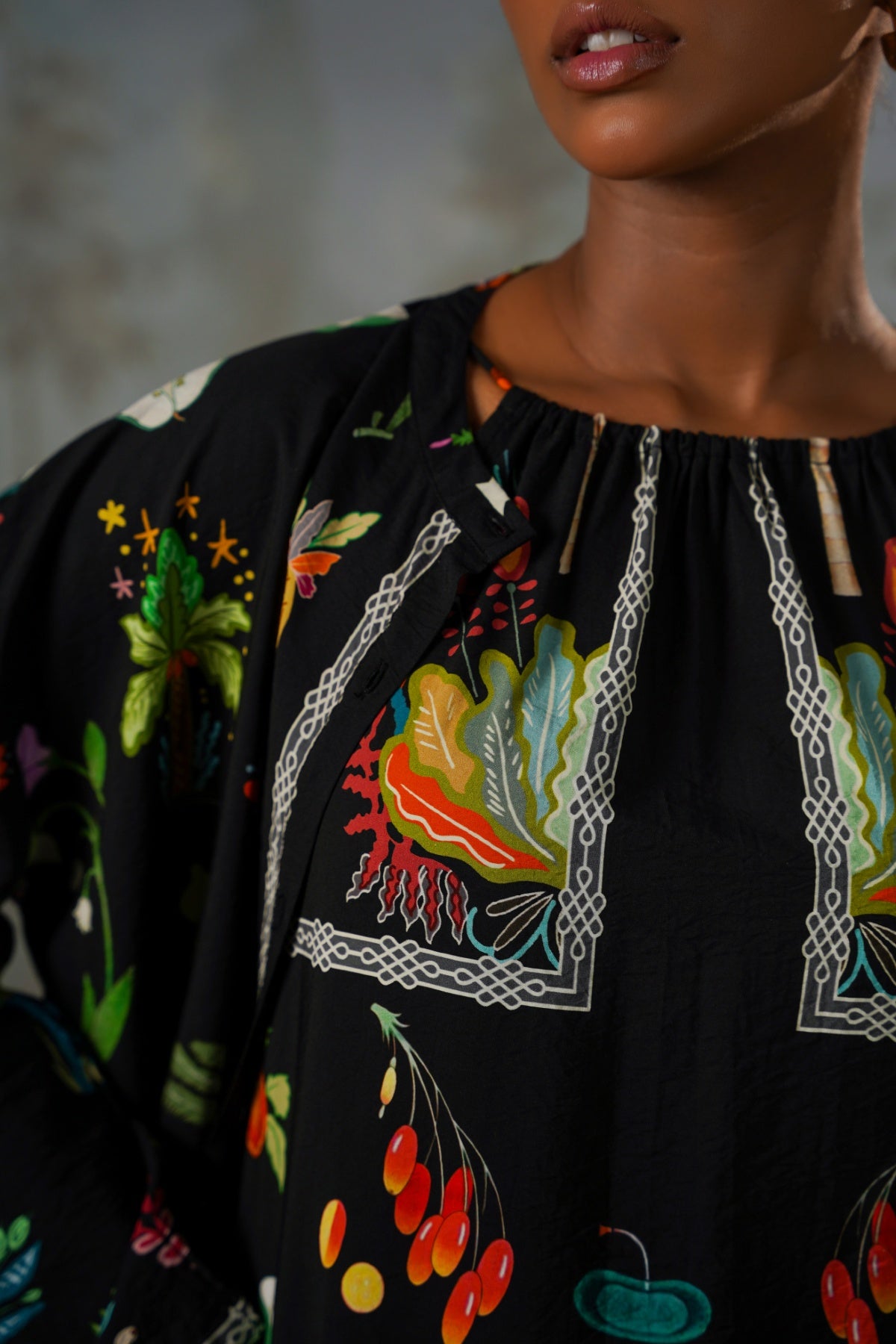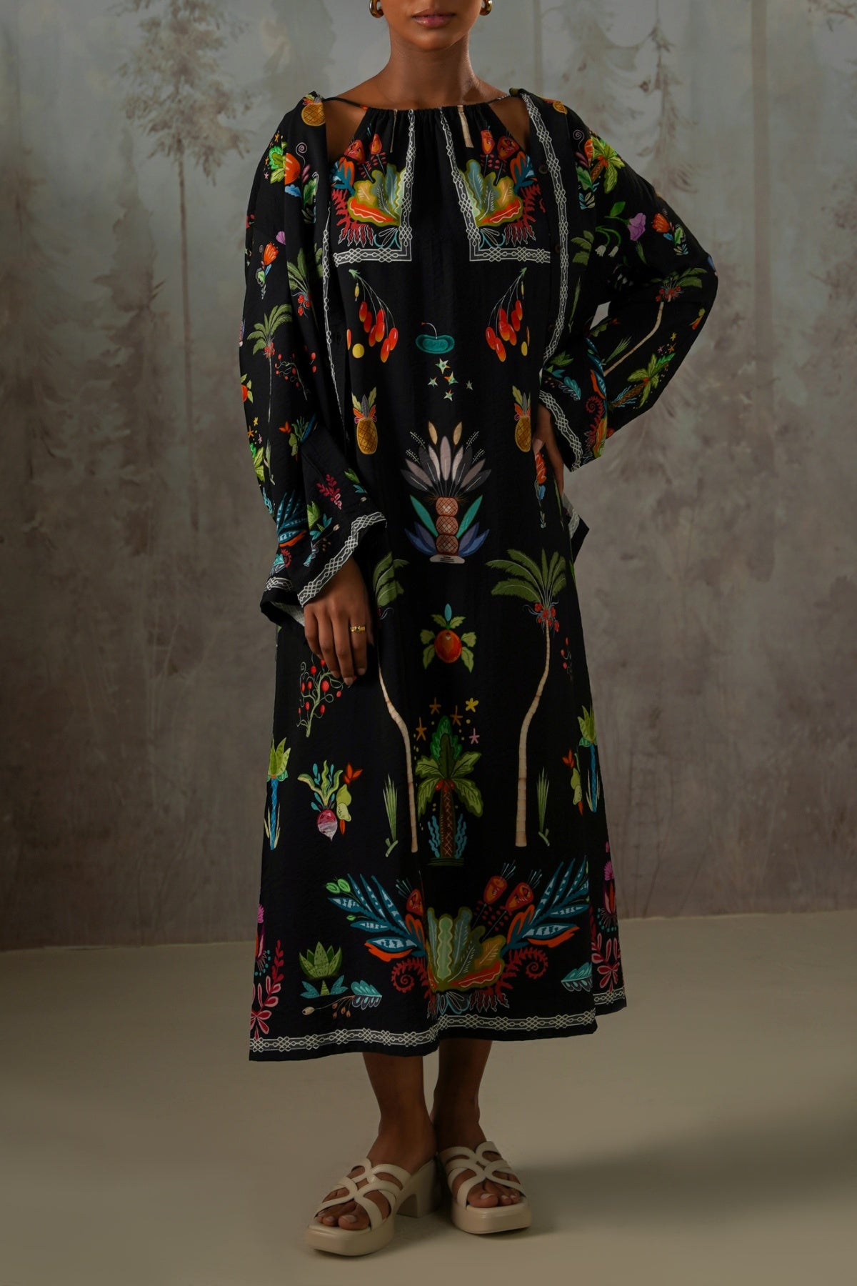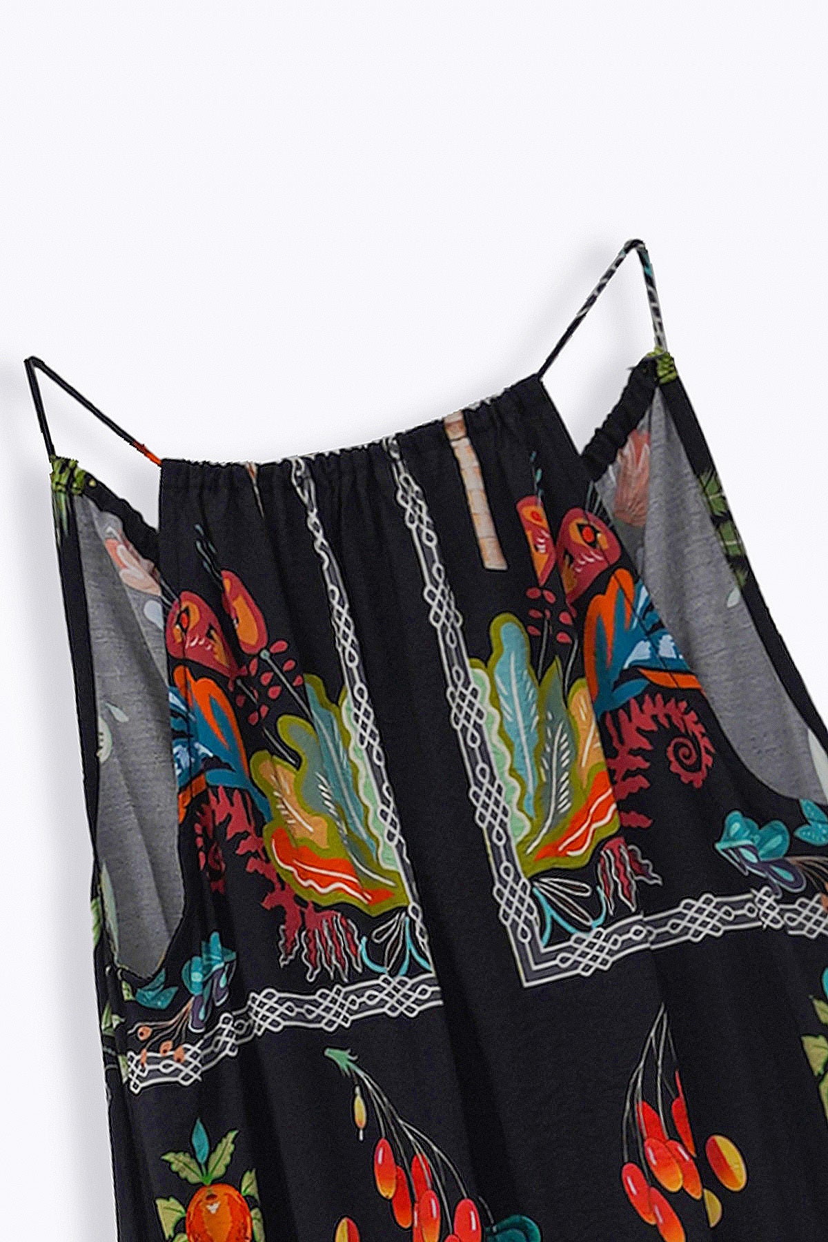 Design details: Printed maxi dress in a soft fabric blend featuring a gathered halter neckline and delicate thin beaded strap with adjustable interlacing for a customizable fit.