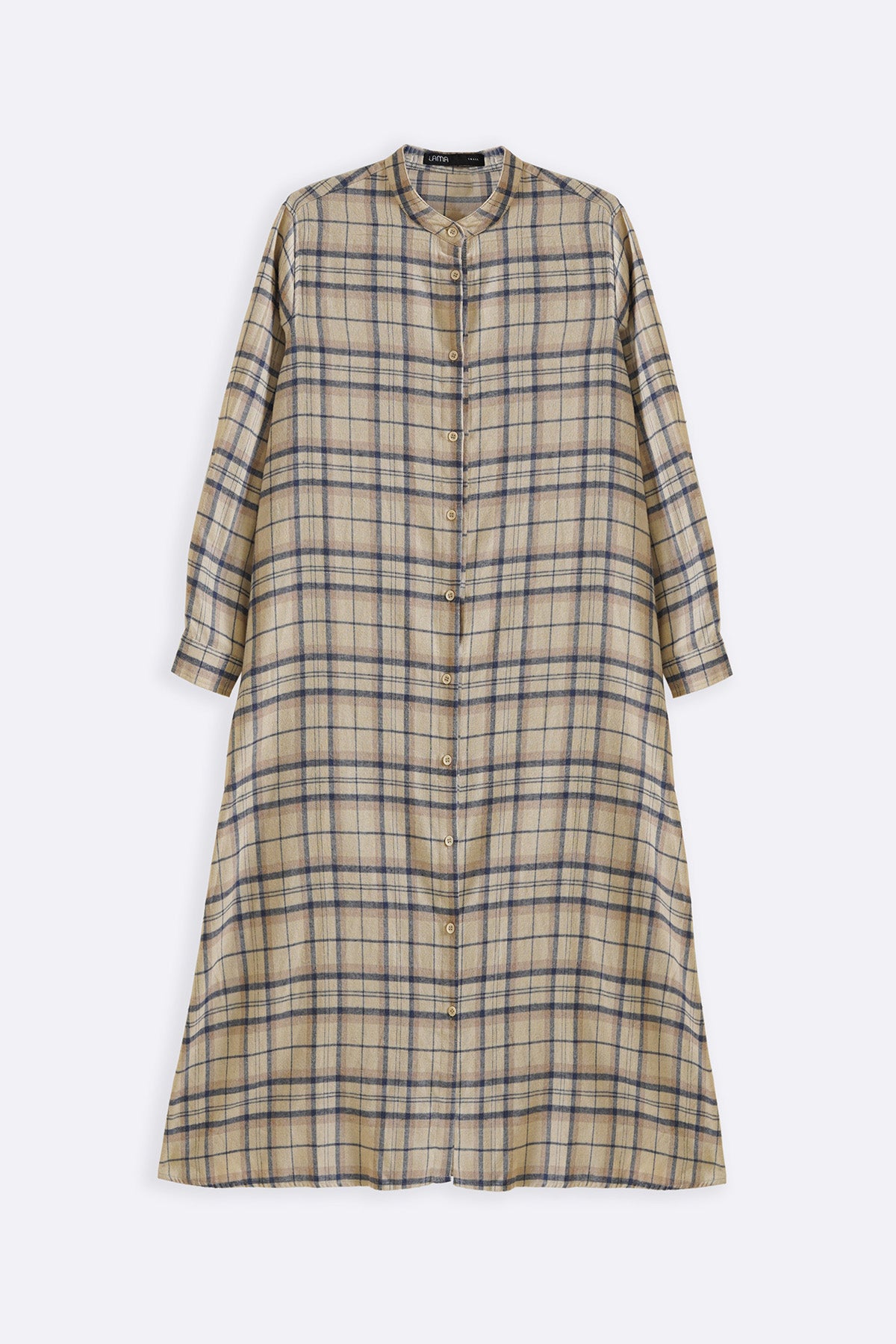 Design details: Long, soft flannel A-line dress with front button up closure and a band collar design,full cuffed sleeves, and side pockets.