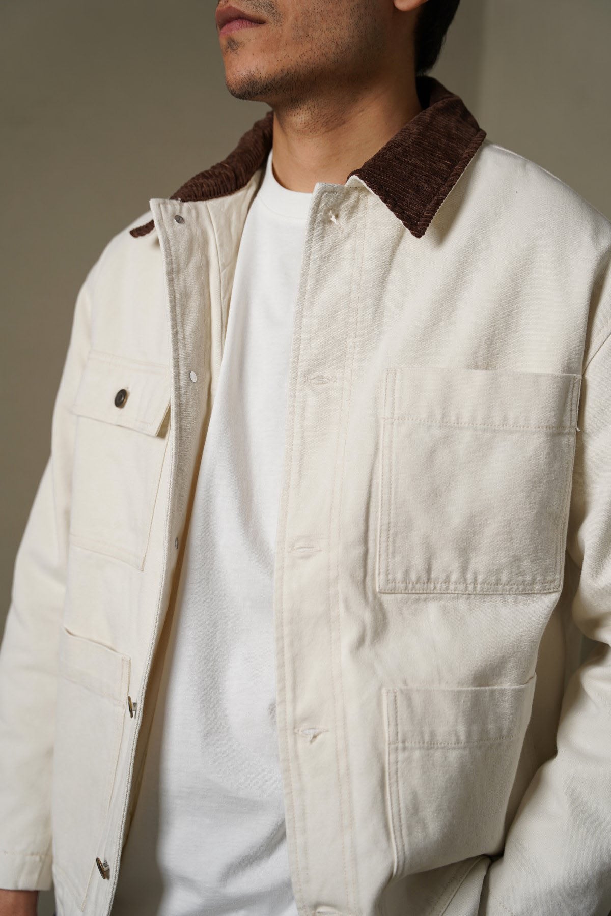 Design details: Oversized canvas jacket with contrast corduroy collar, 4 patch pockets at the front, full sleeves and front button closure.