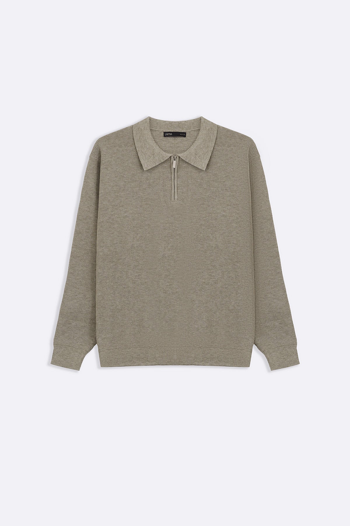 Design details: Long sleeves sweater with collar and front quarter zip.