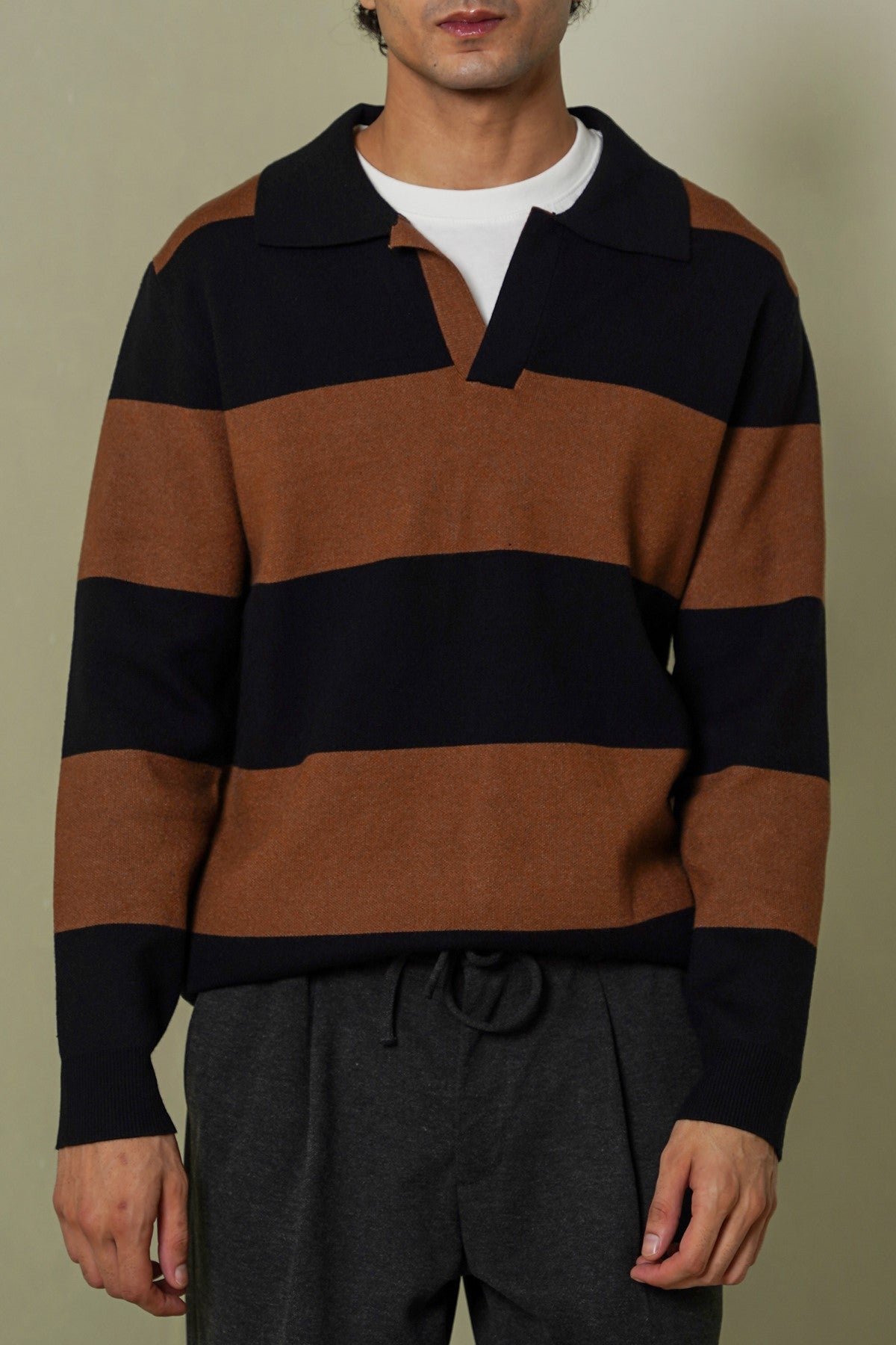 Design details: V-neck collared sweater with contrasting stripes along with long sleeves