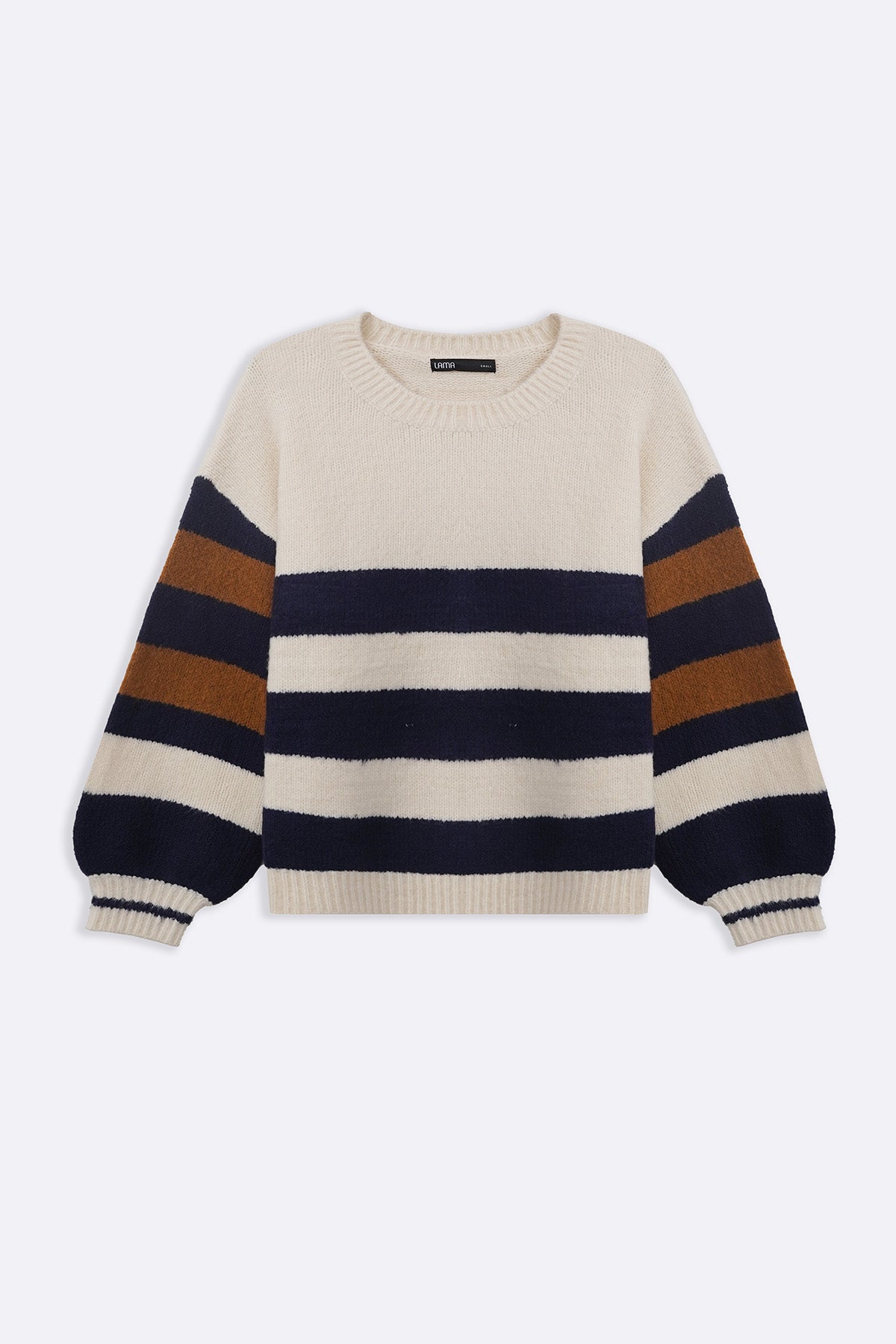 Design details: Crew neckline stripe sweater with puffed sleeves and ribbed trims.