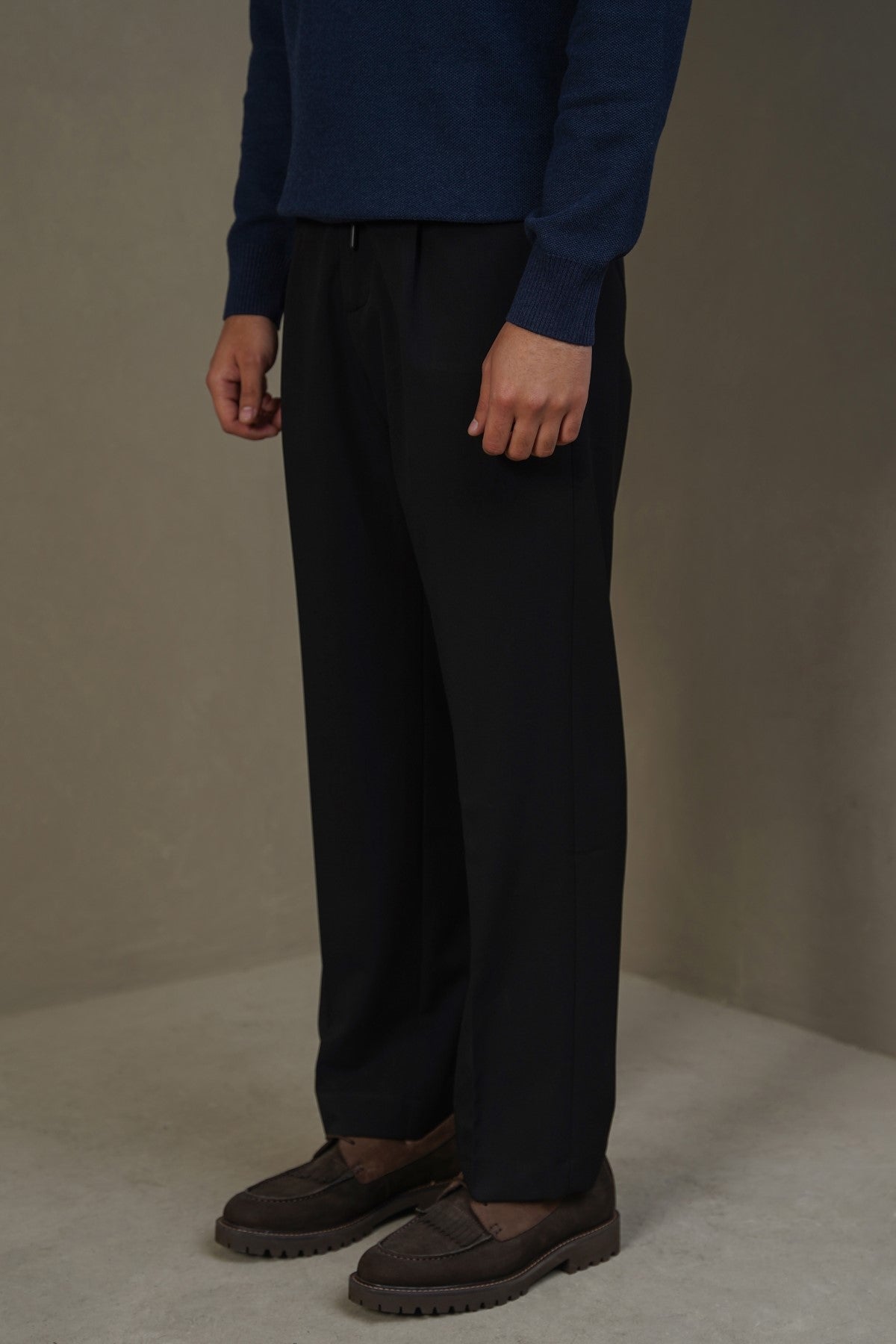 Design details: Pleated pants with an elasticated waistband and drawstring. Front cross pockets and back bone pockets.
