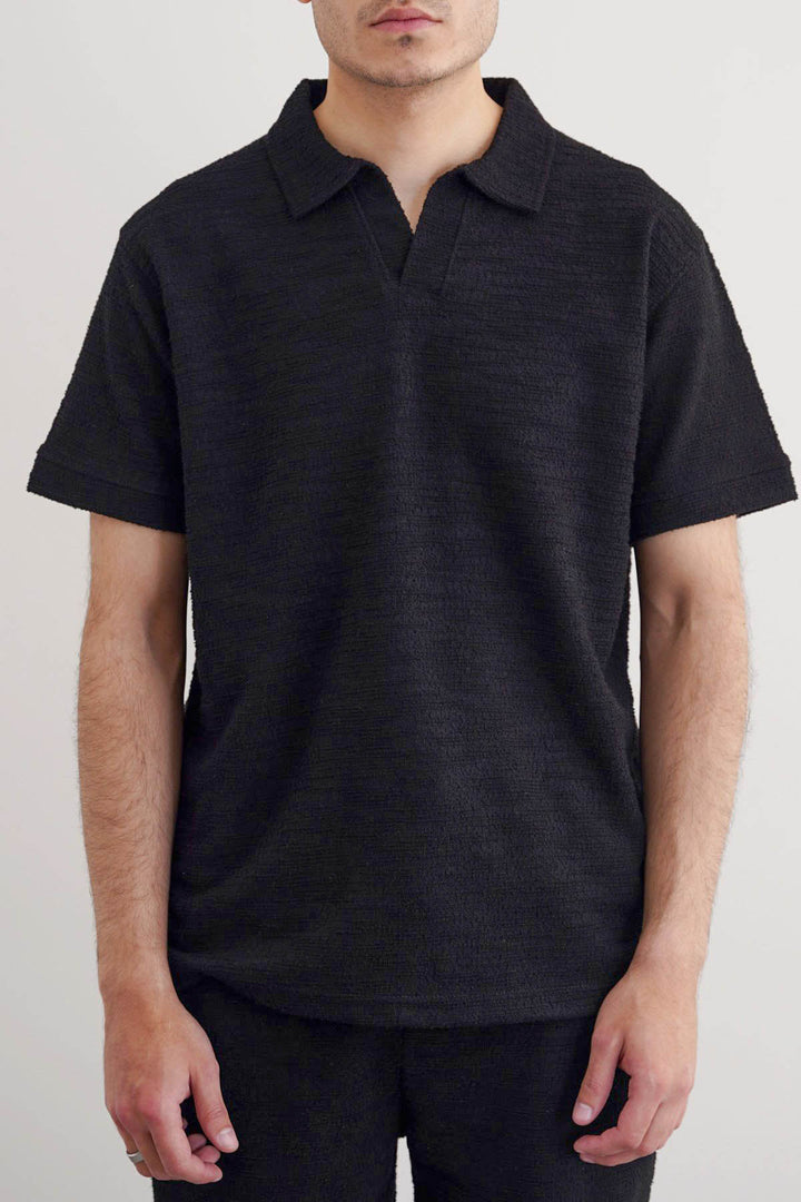Design details: Boucle knitted polo shirt with dropped shoulder, short sleeves and side slits.