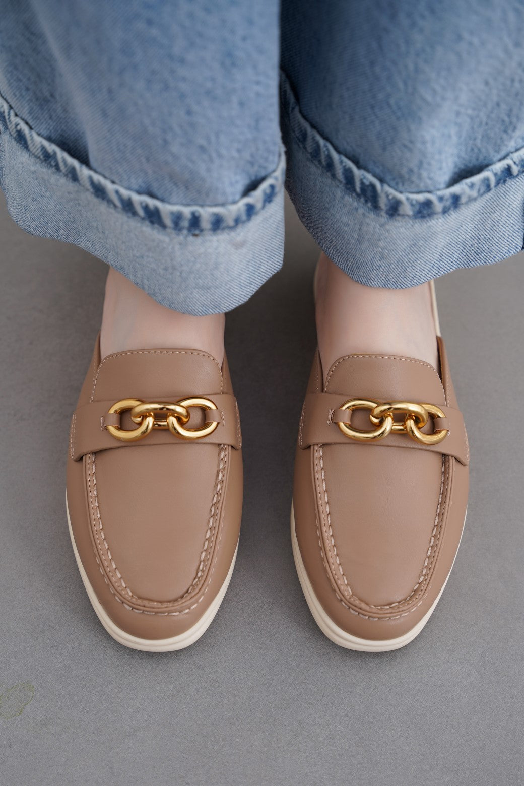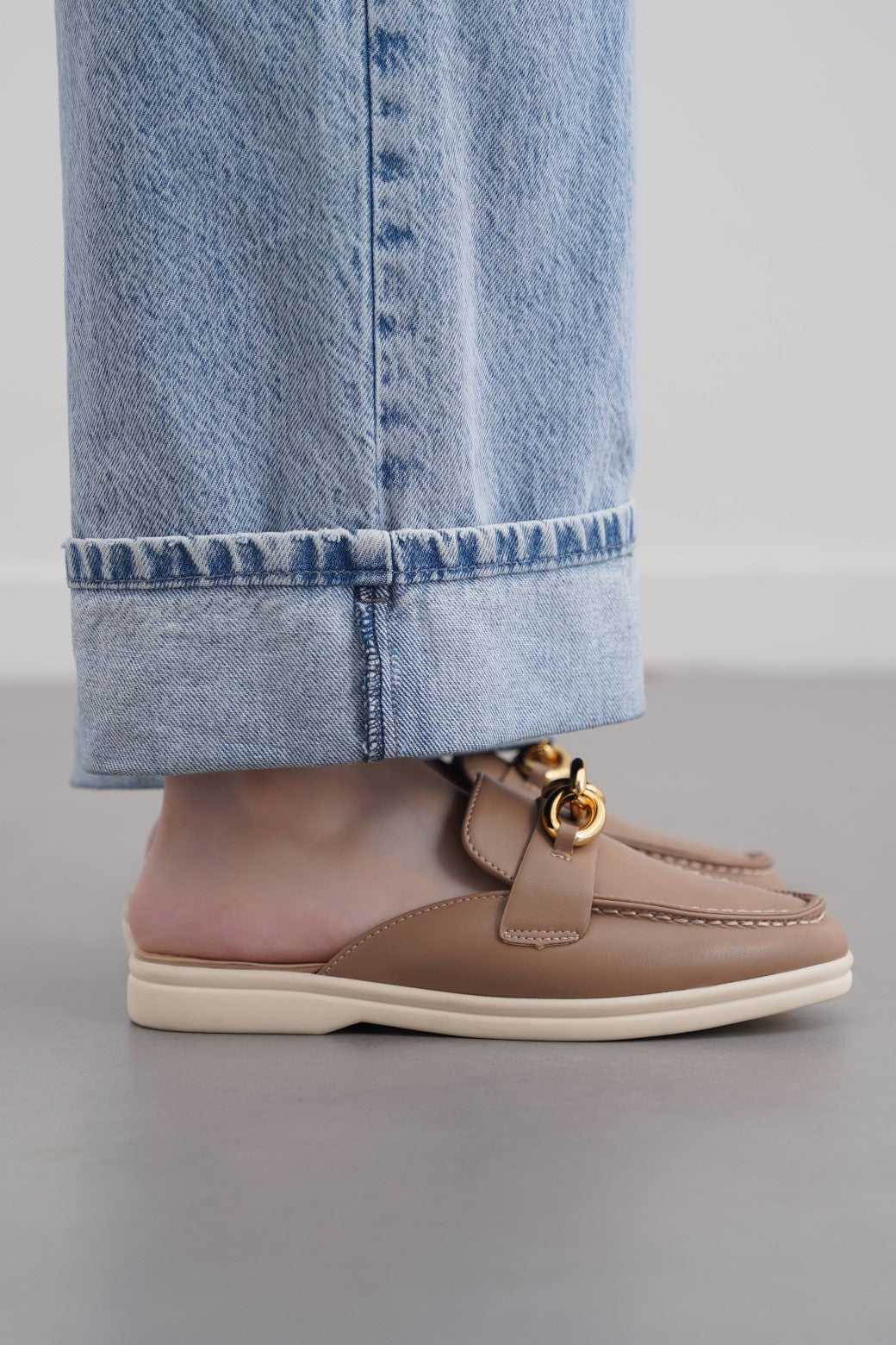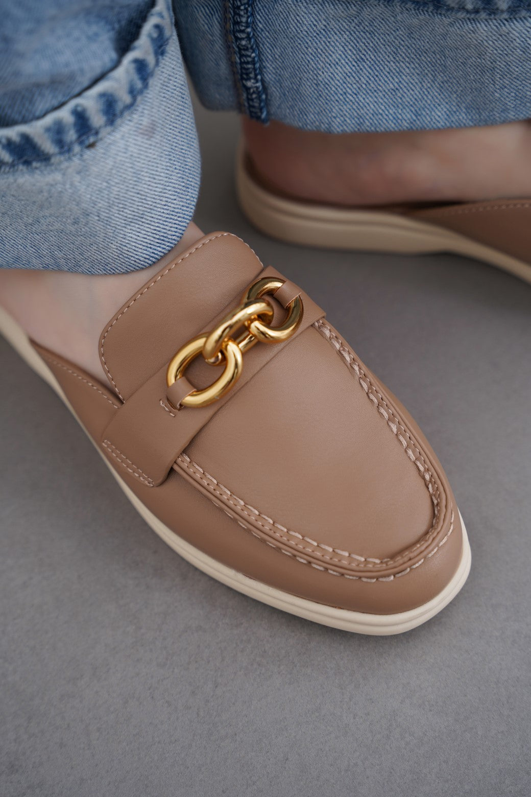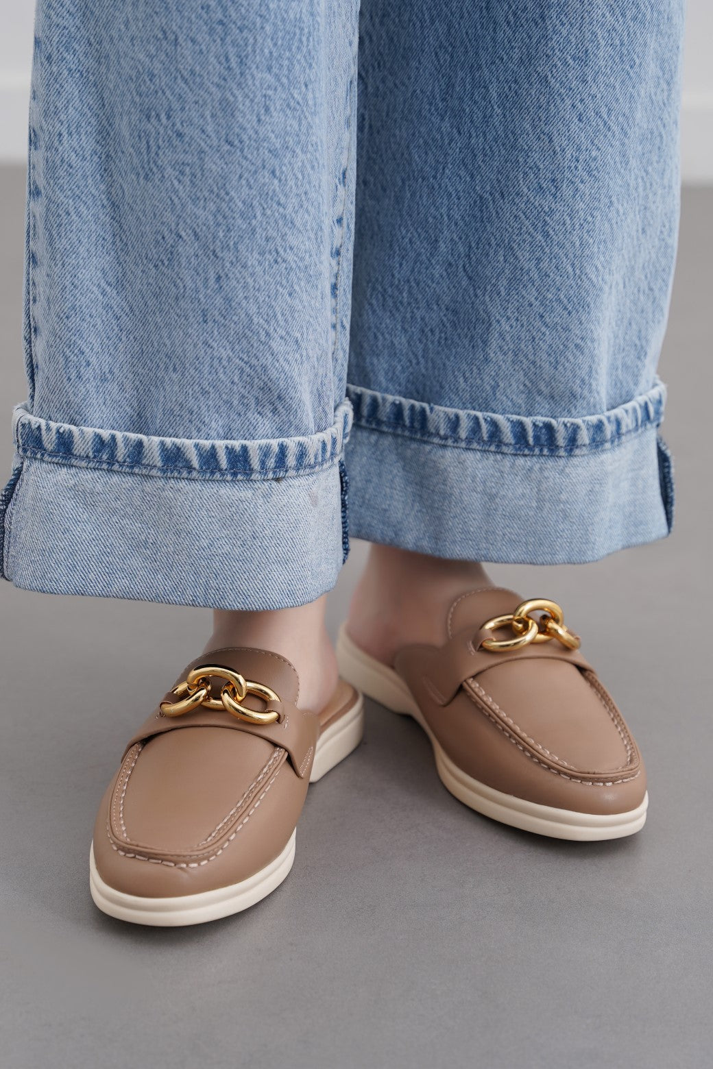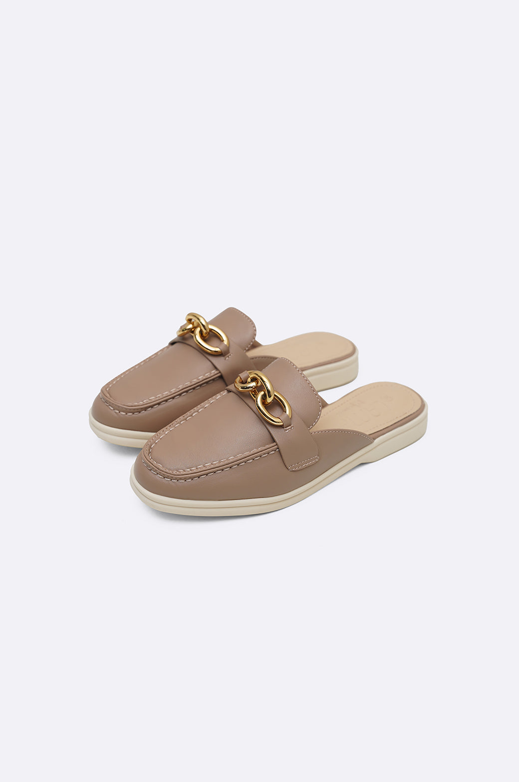 Super soft mama mules with gold chain on the top and contrasting super-flexible rubber outsole.
