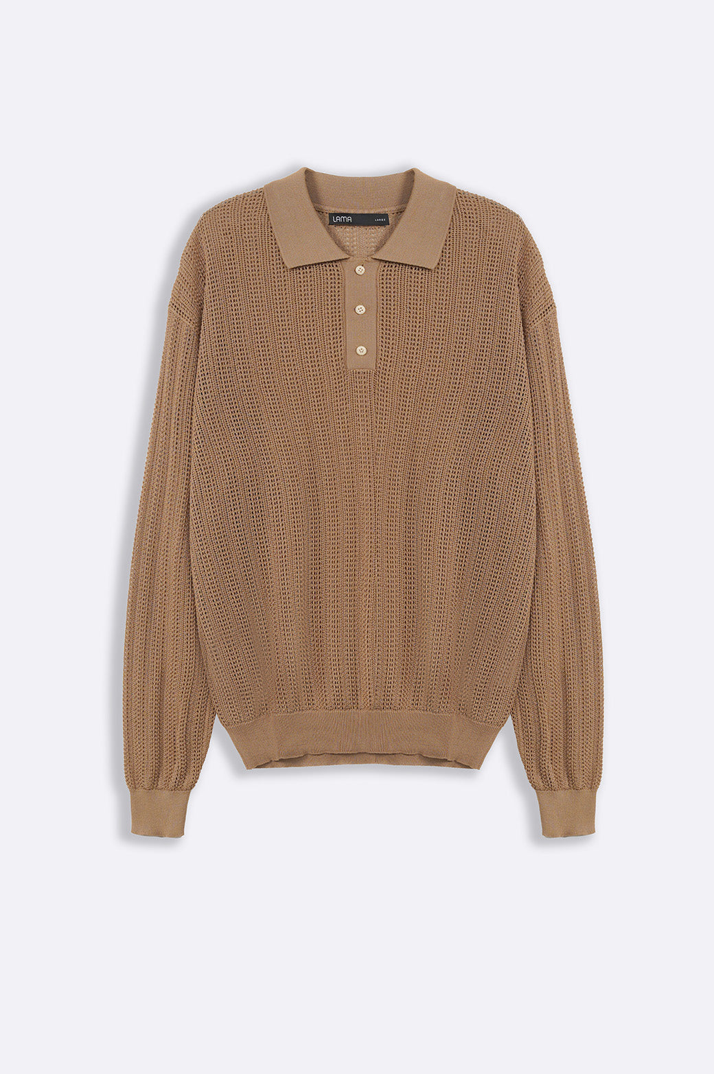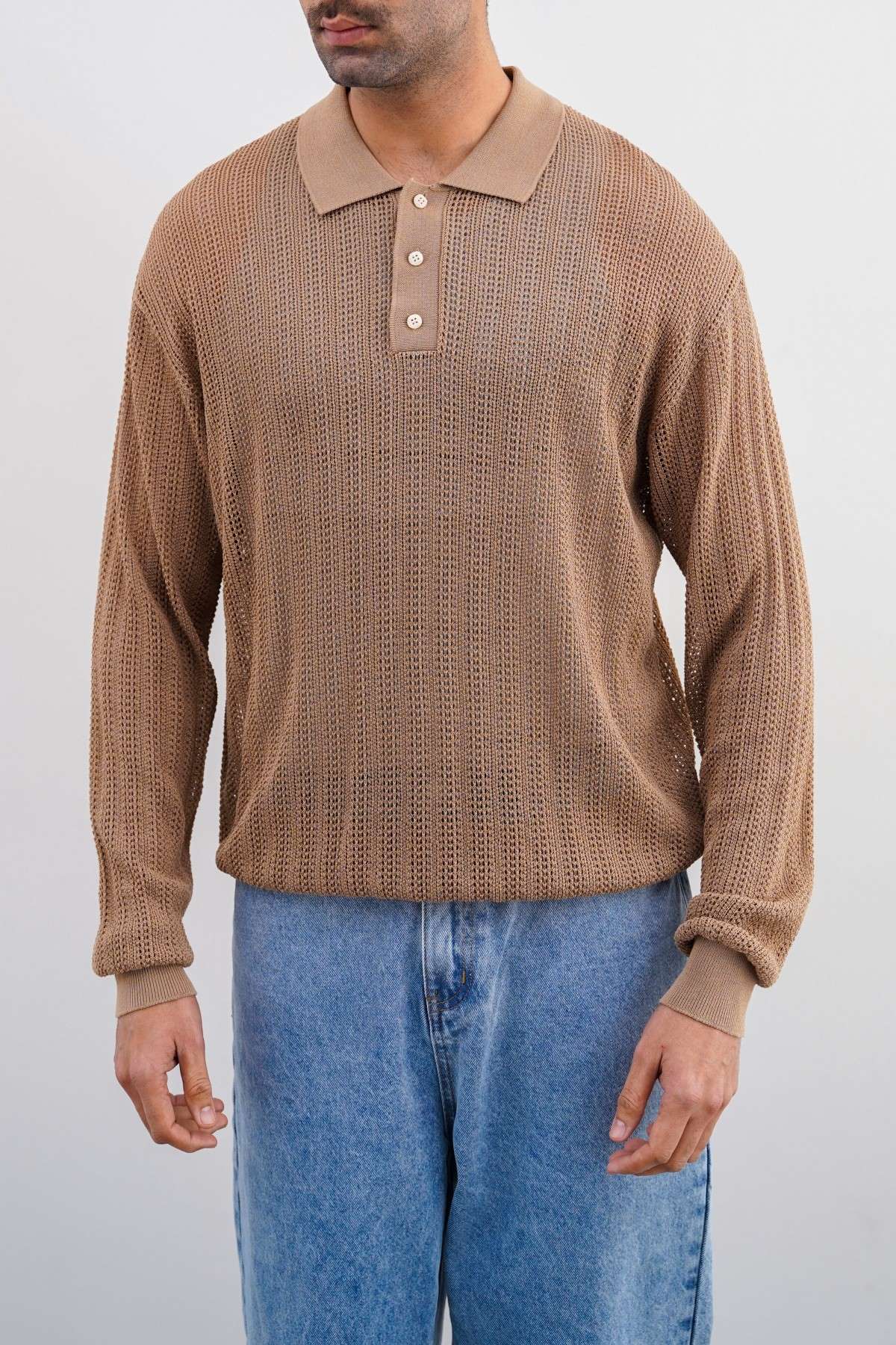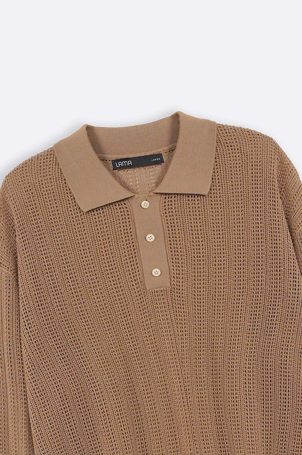 Design details: Full sleeves polo shirt in loose crochet knit, featuring a ribbed front placket with contasting buttons and ribbed hem and cuffs.