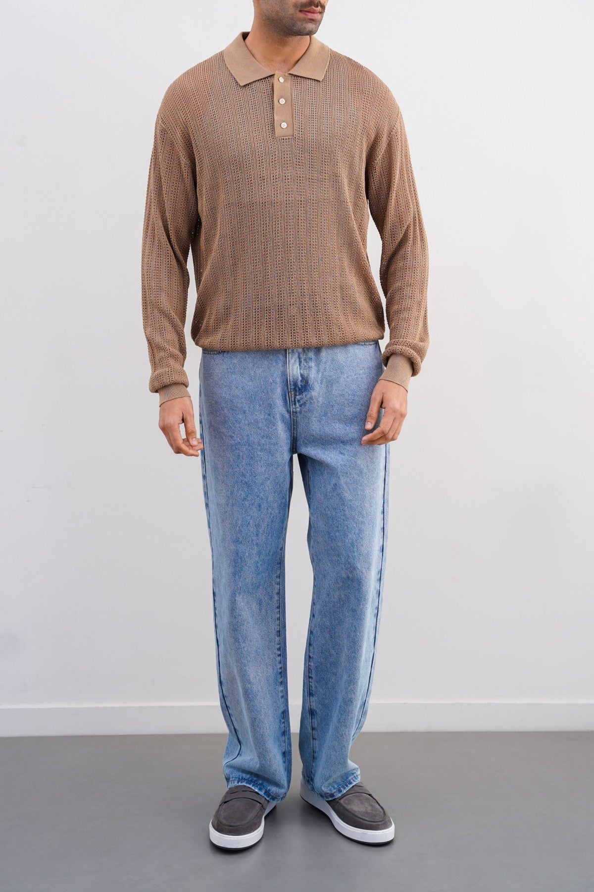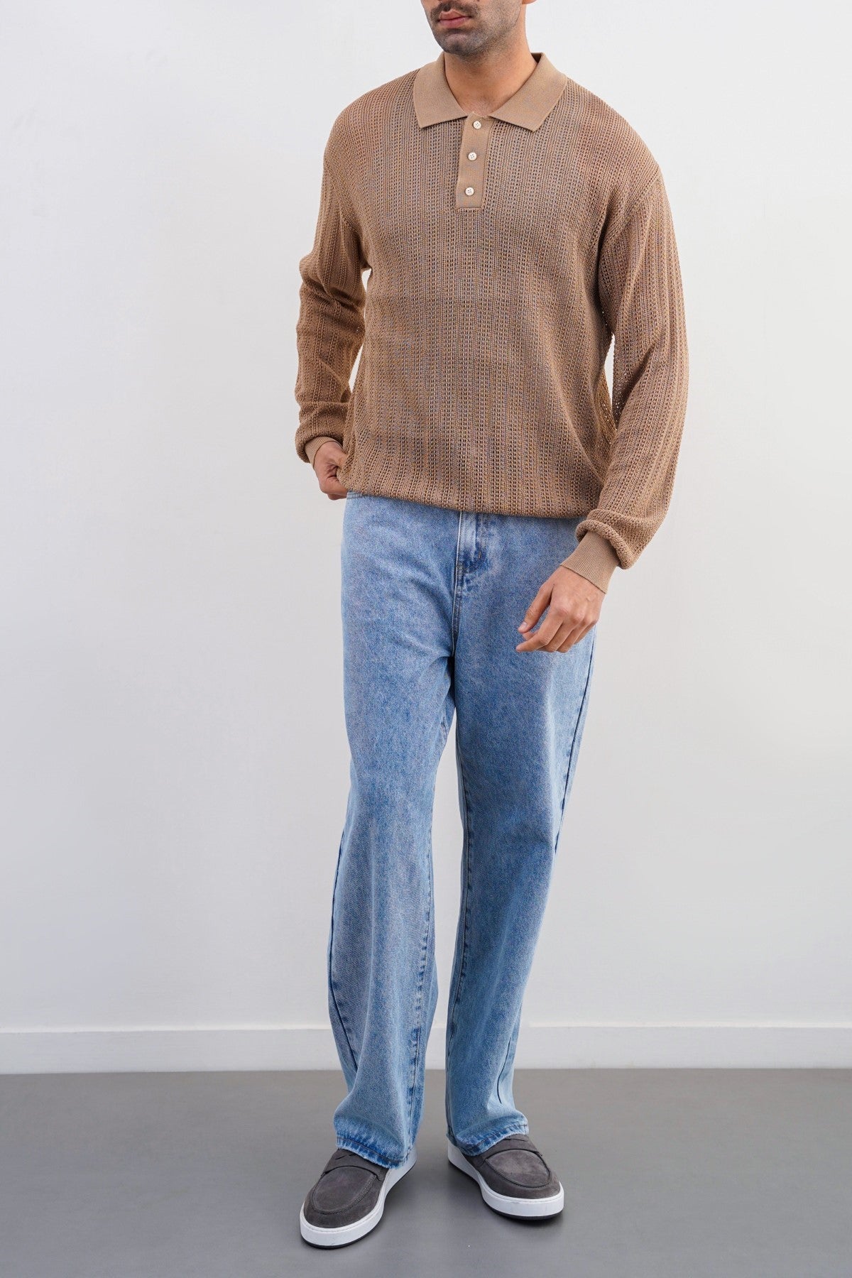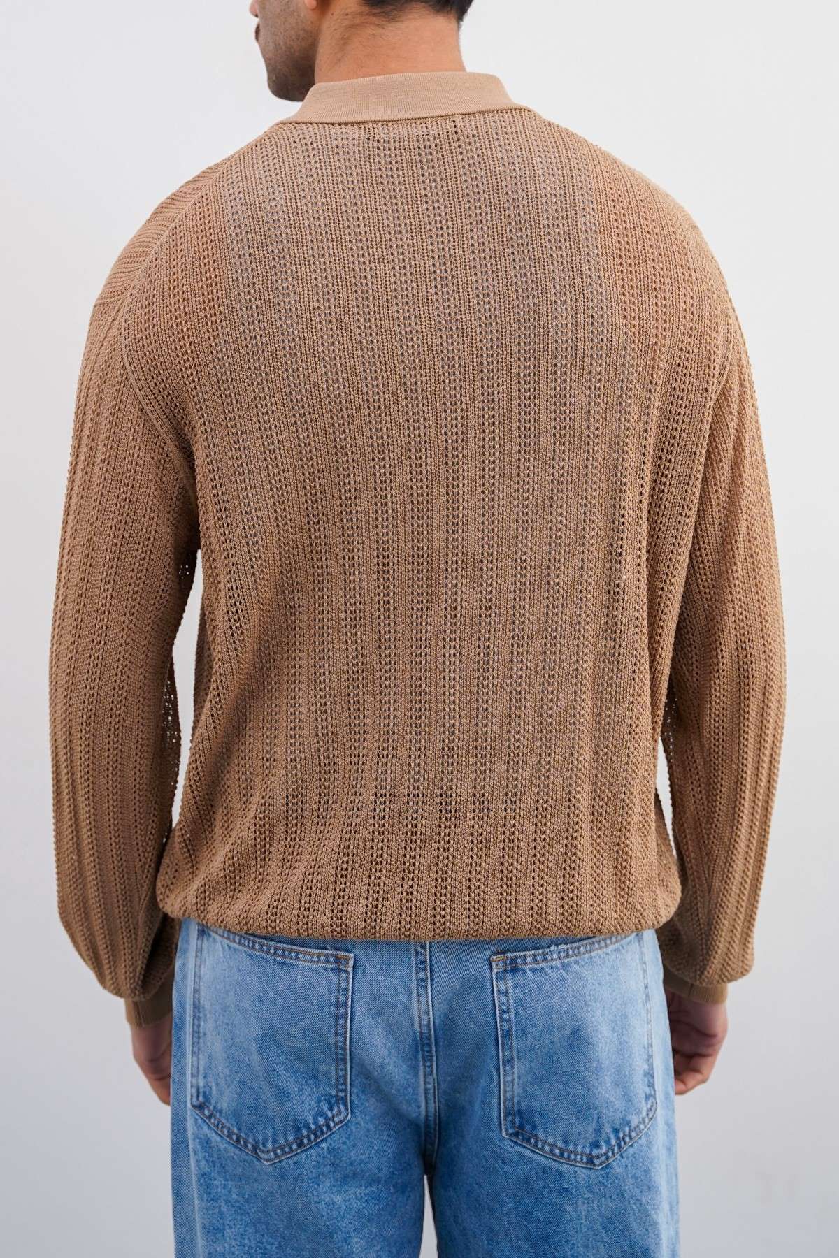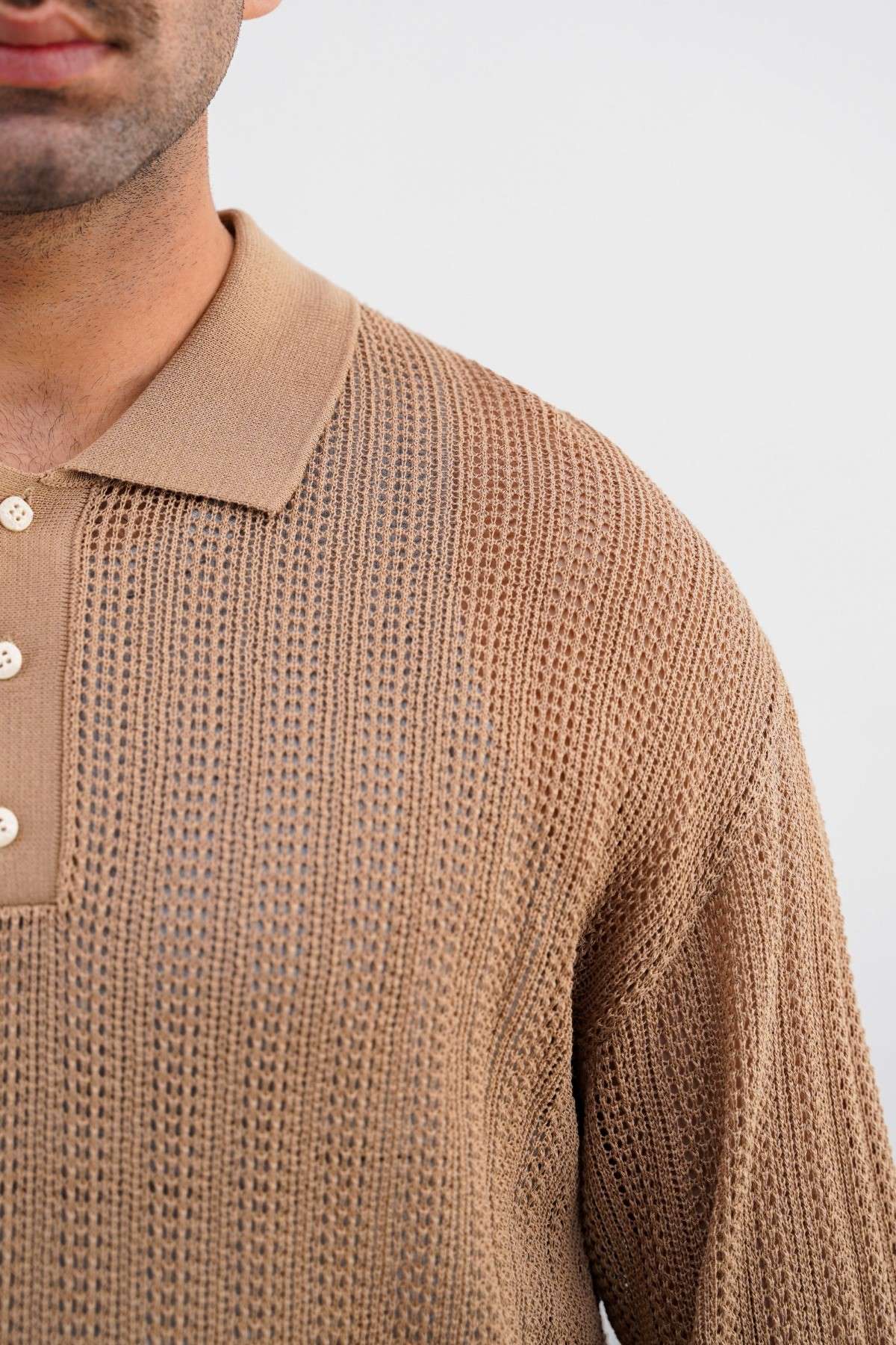 Design details: Full sleeves polo shirt in loose crochet knit, featuring a ribbed front placket with contasting buttons and ribbed hem and cuffs.