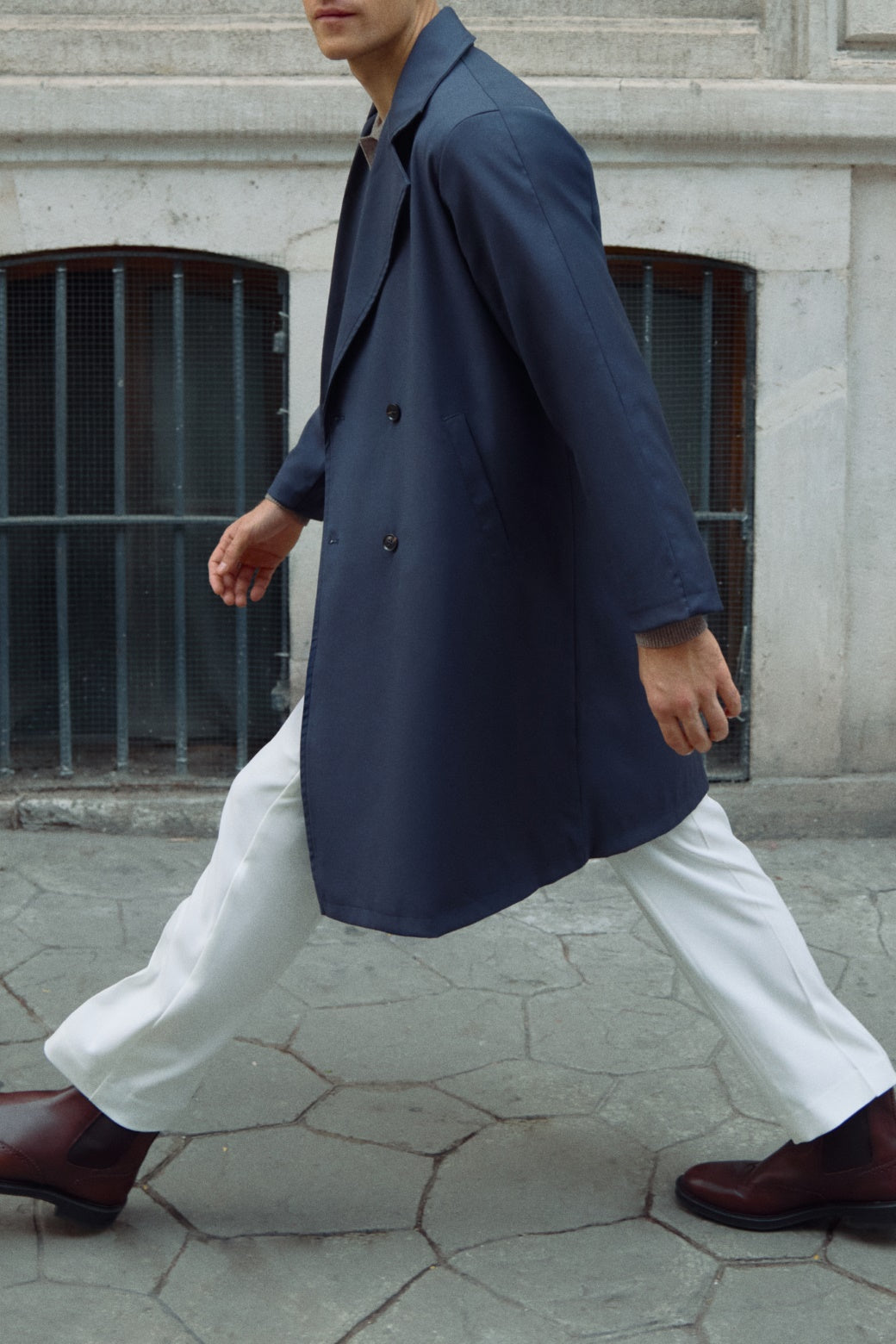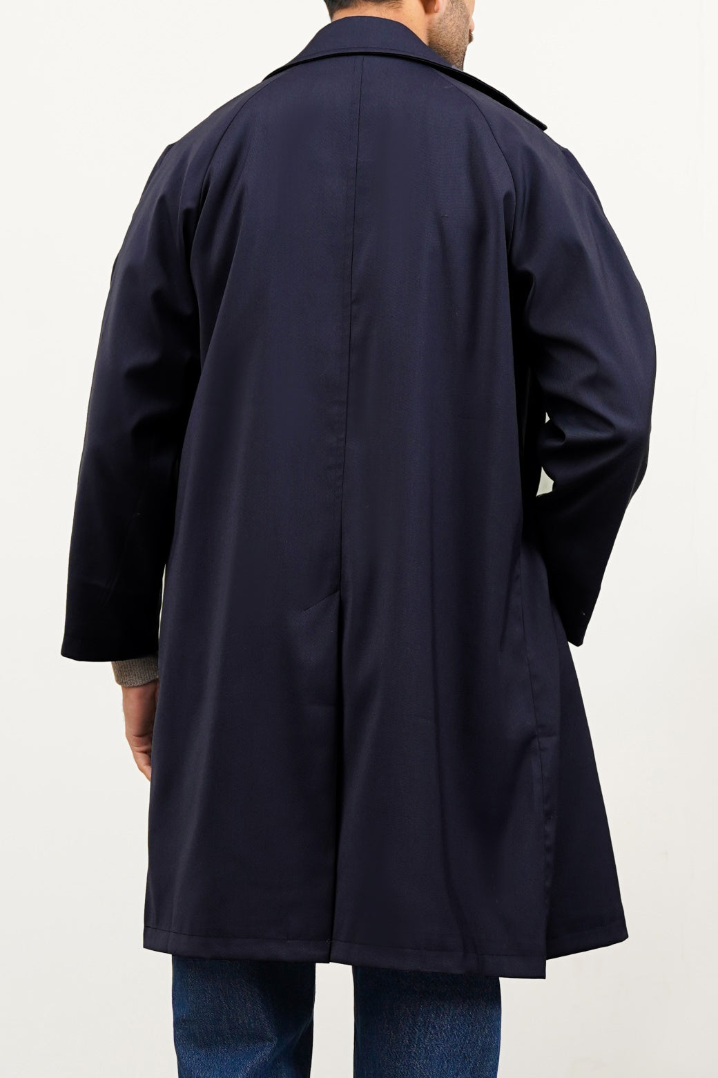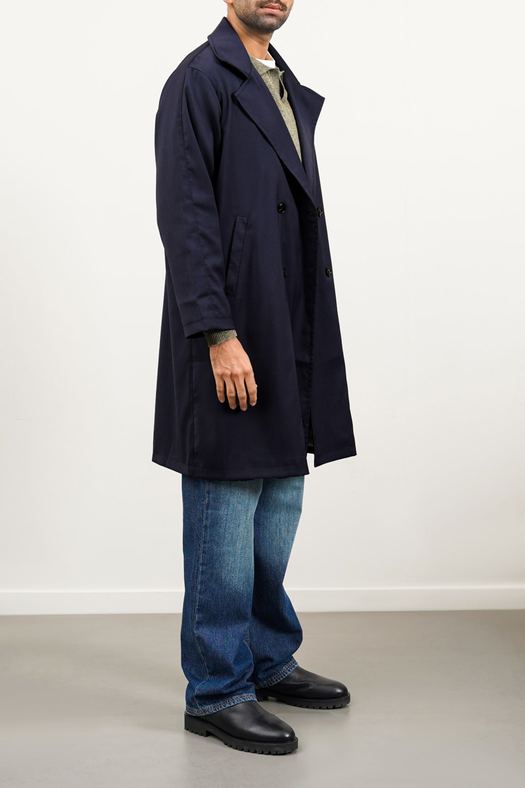 Design details: Double breasted coat with notch lapel, two single welt pockets at front and Raglan sleeves.