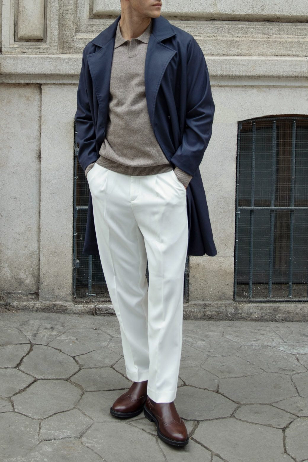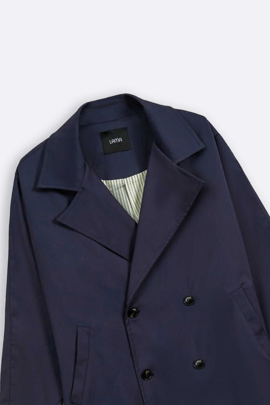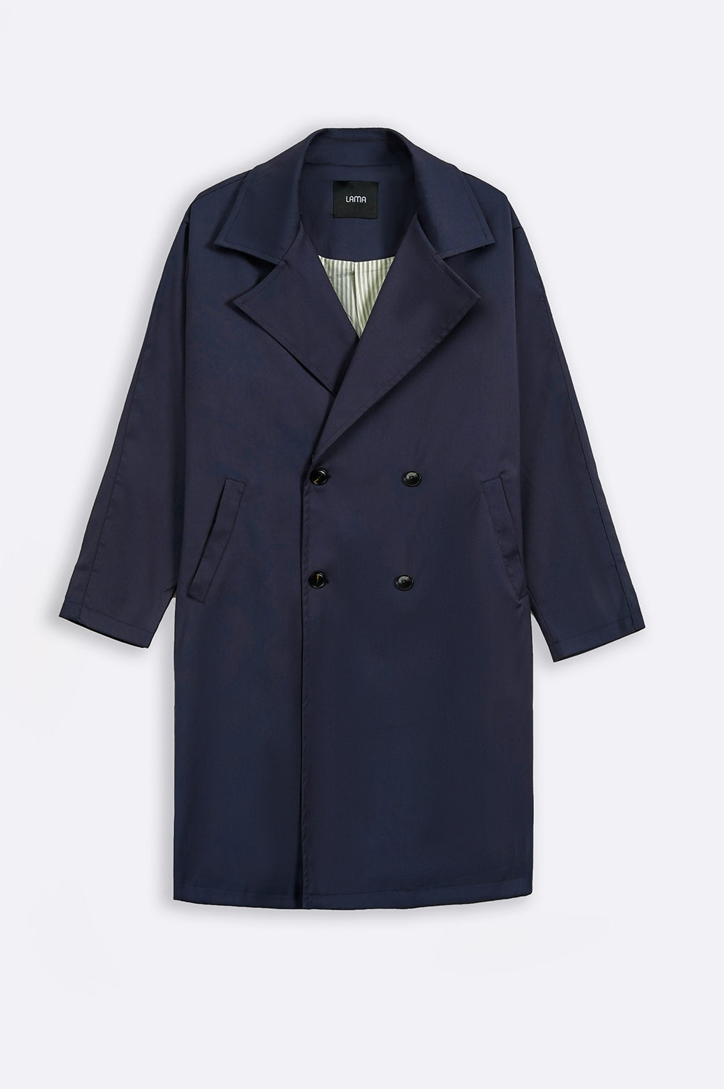 Design details: Double breasted coat with notch lapel, two single welt pockets at front and Raglan sleeves.