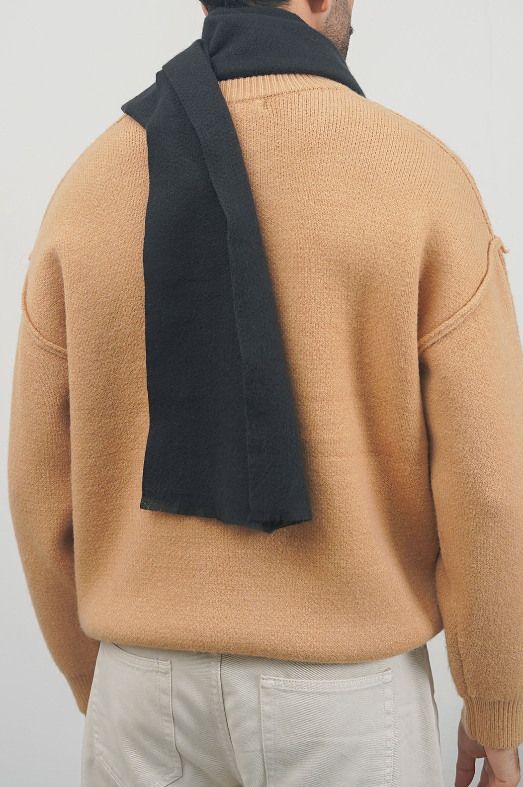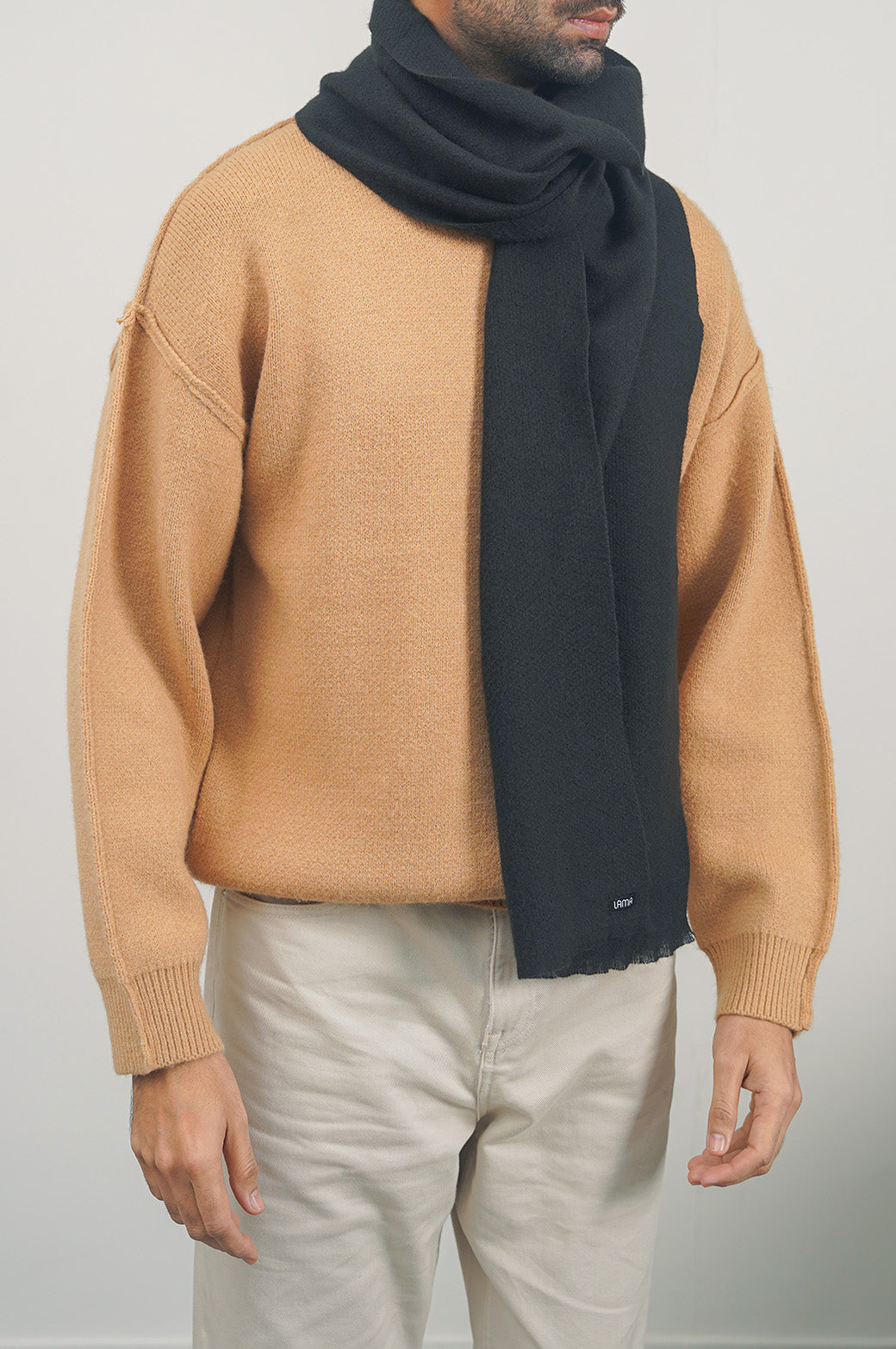 Lightweight, lightly textured and super soft woven scarf with contrasting hem fringes.