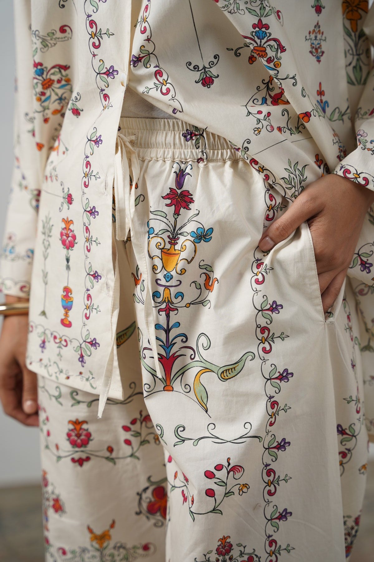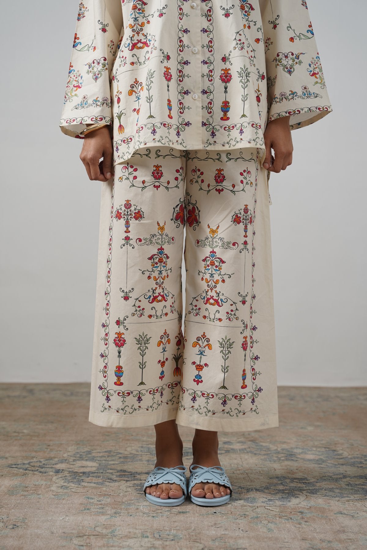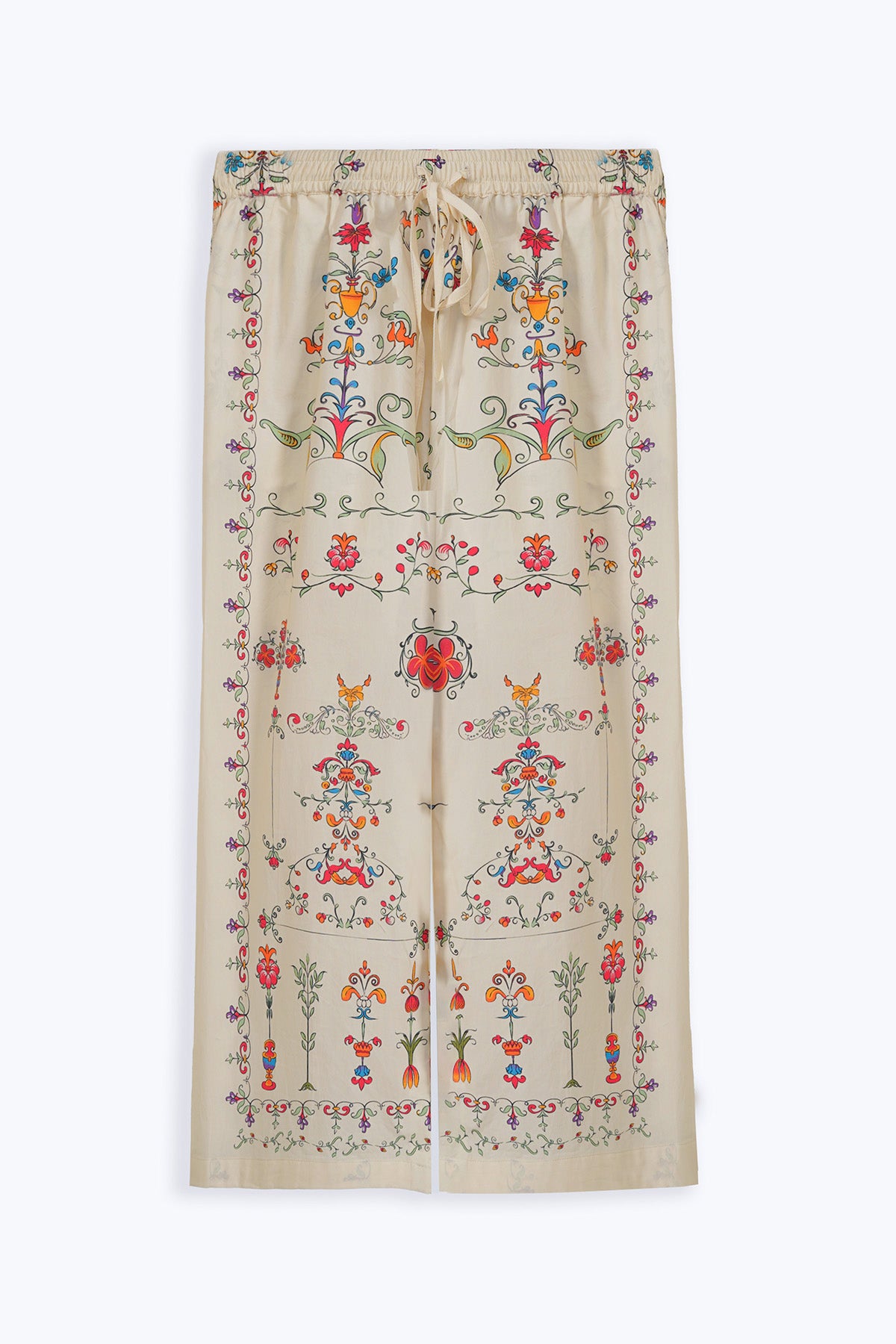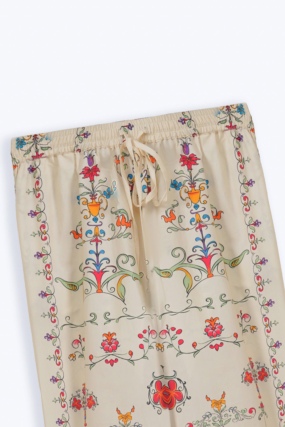Design details: Printed poplin wide-leg pants with front side pockets and an all-around elasticated waistband with drawstring.