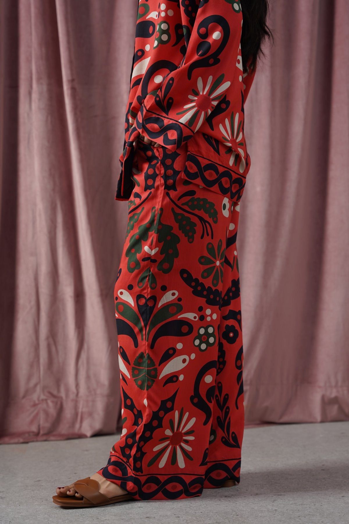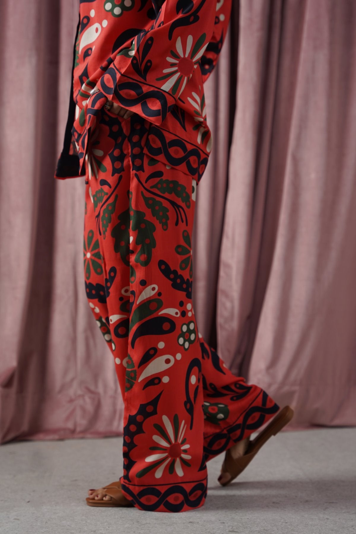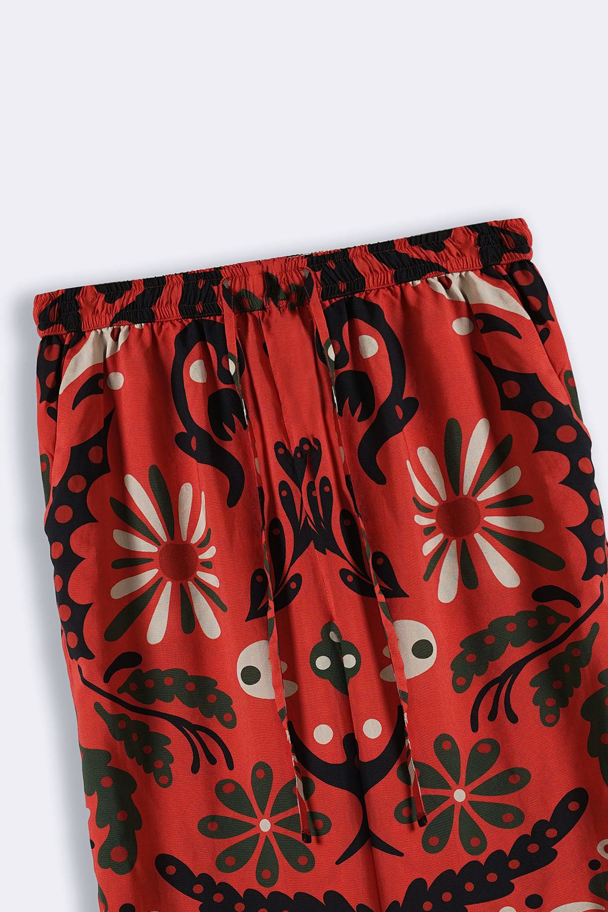 Design details: Printed wide leg pants with front side pockets and an all around elastciated waistband with drawstring.