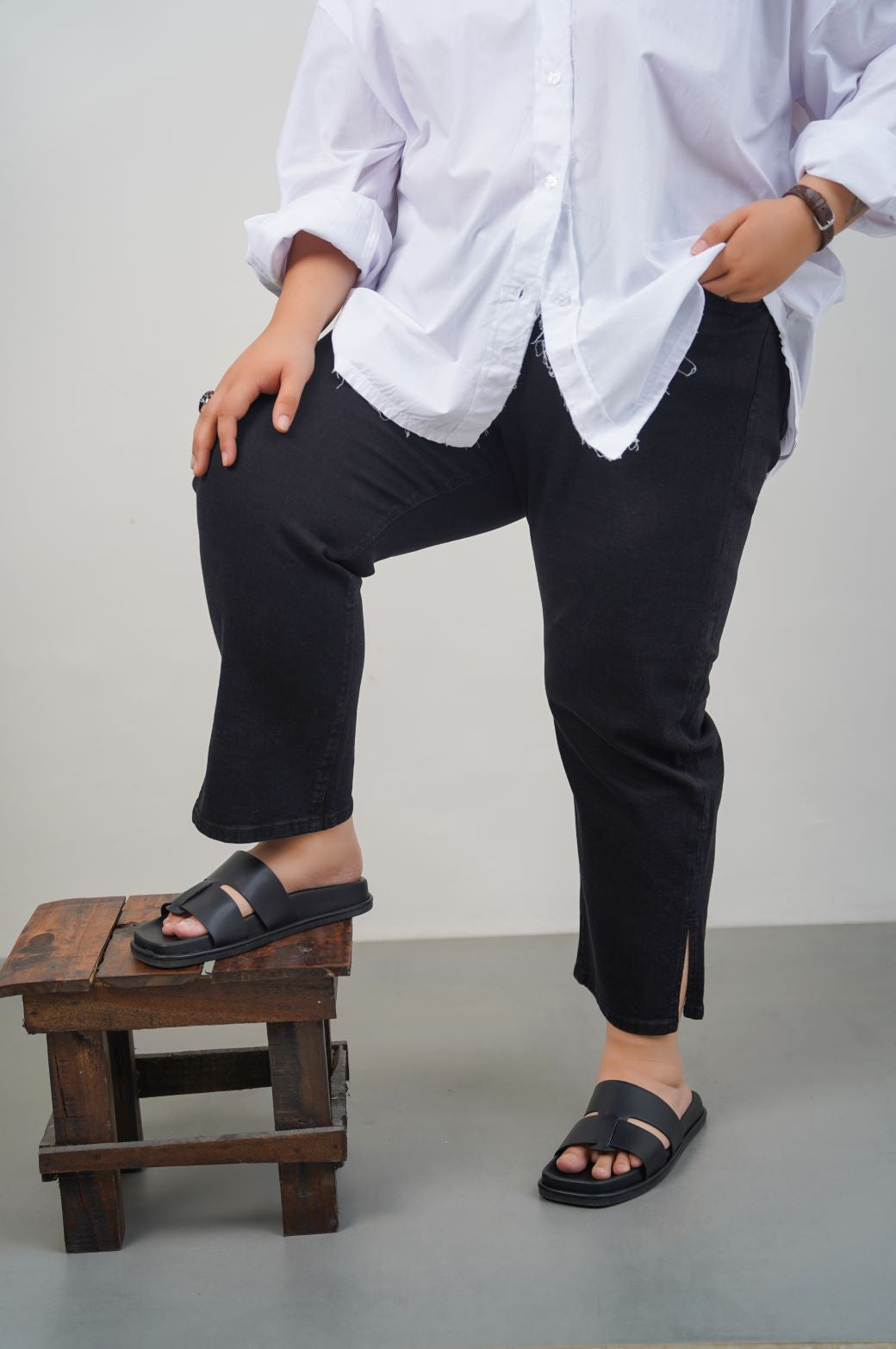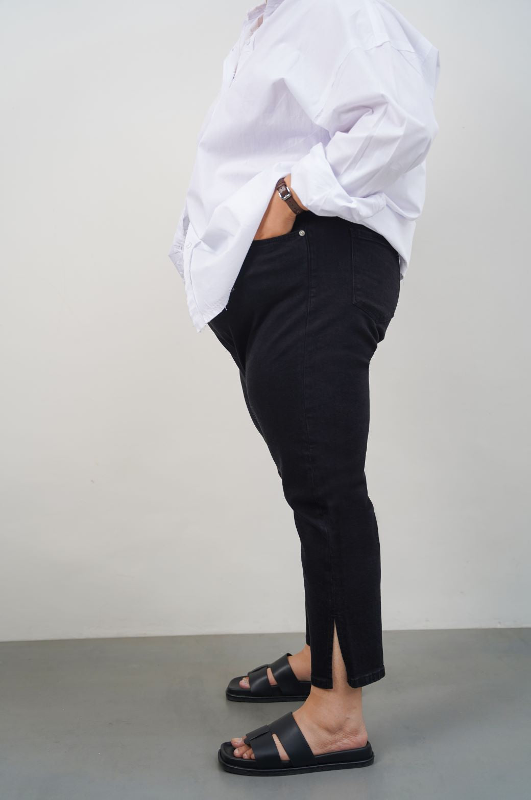 Design details: Mid-rise slim fit cropped jeans. Basic five pocket detail, scoop pocket details. Metal zipper and button closure. Side slit detail at bottom opening.