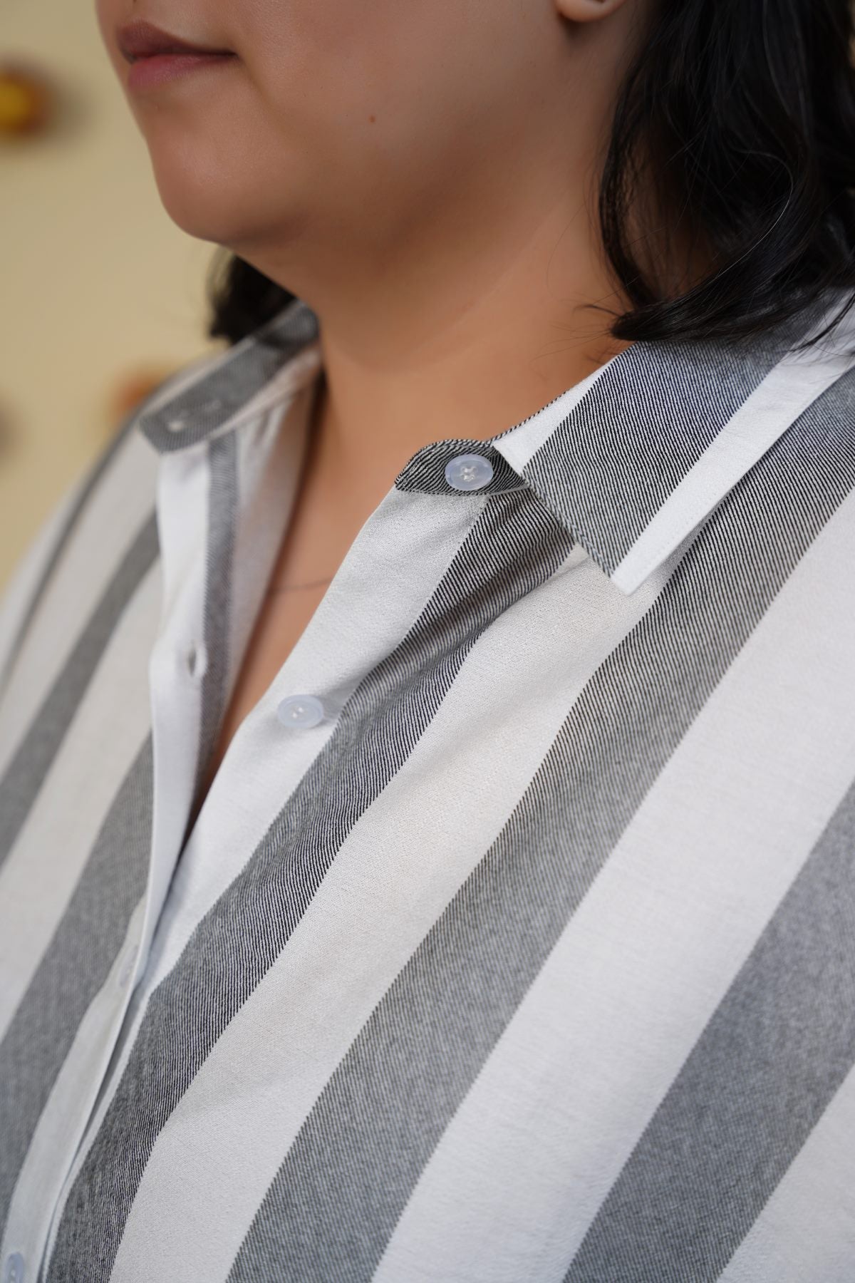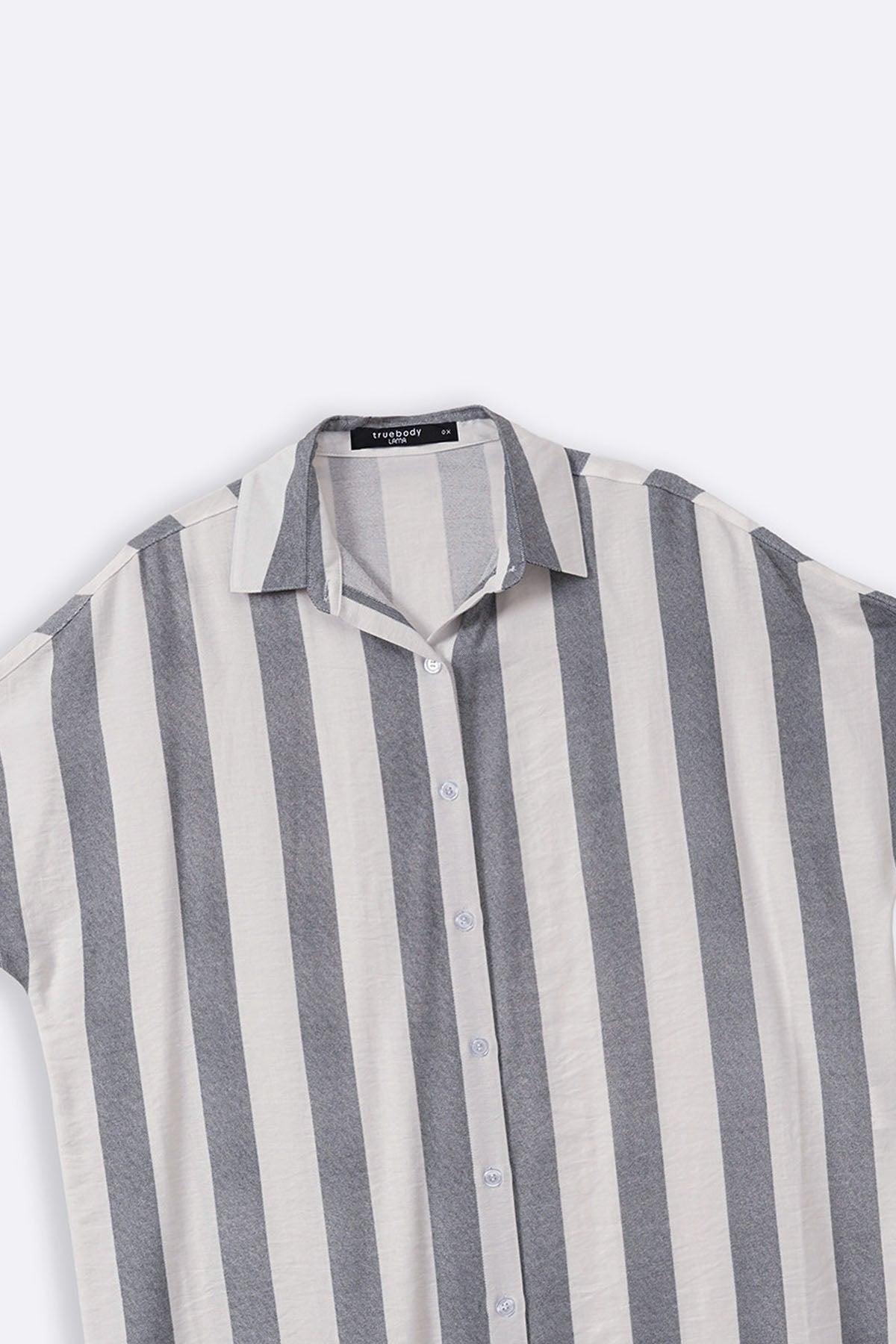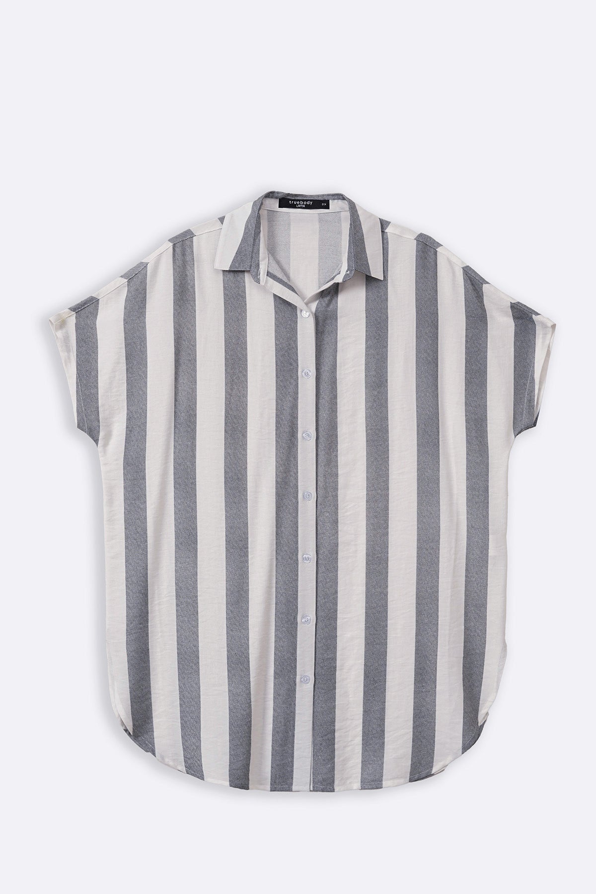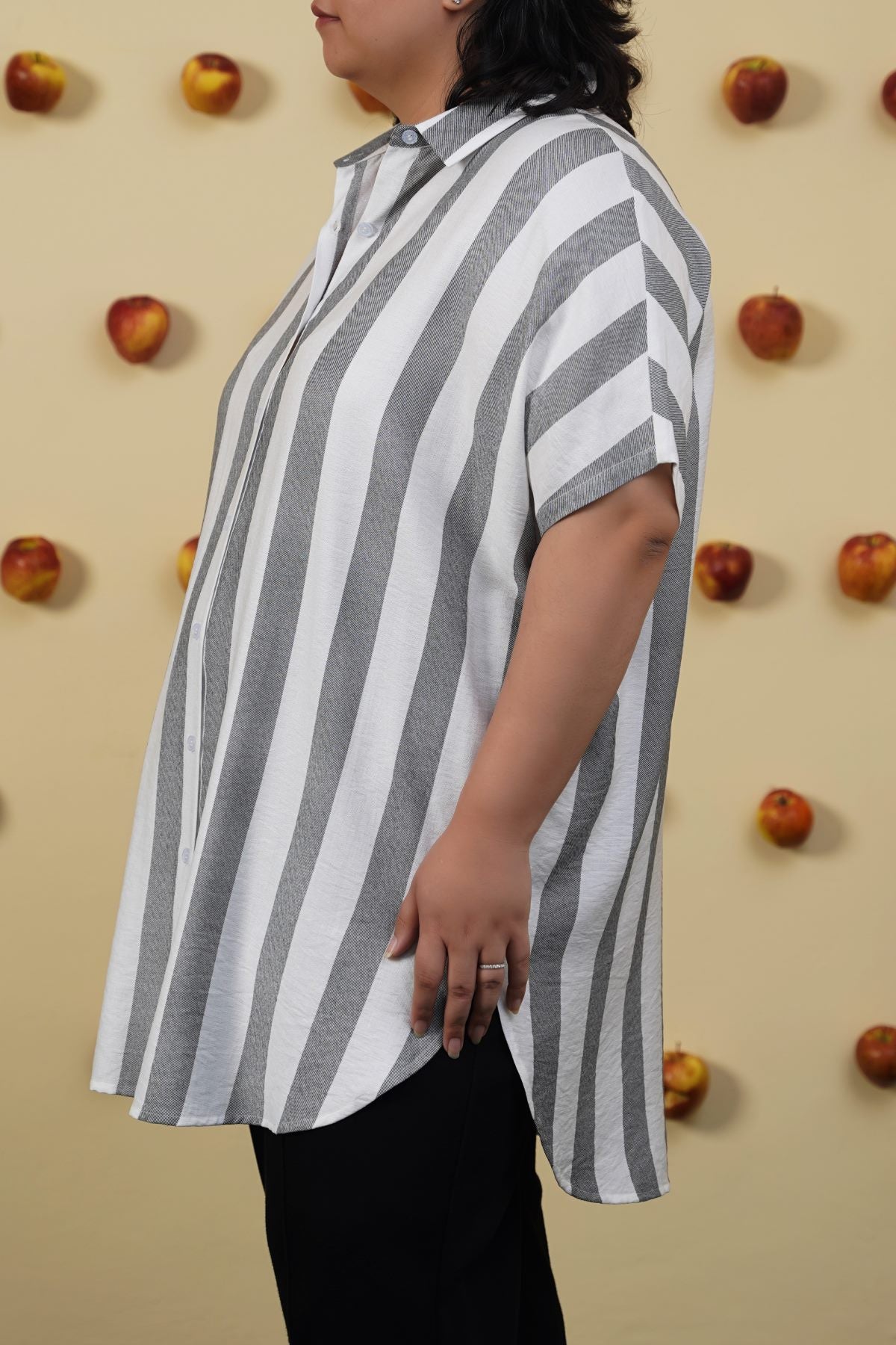 Design details: Striped tunic with a one-piece batwing sleeve design and button-up front.