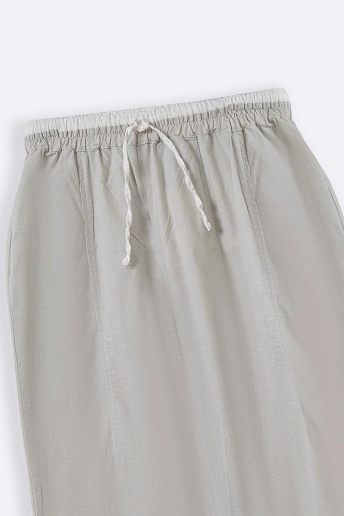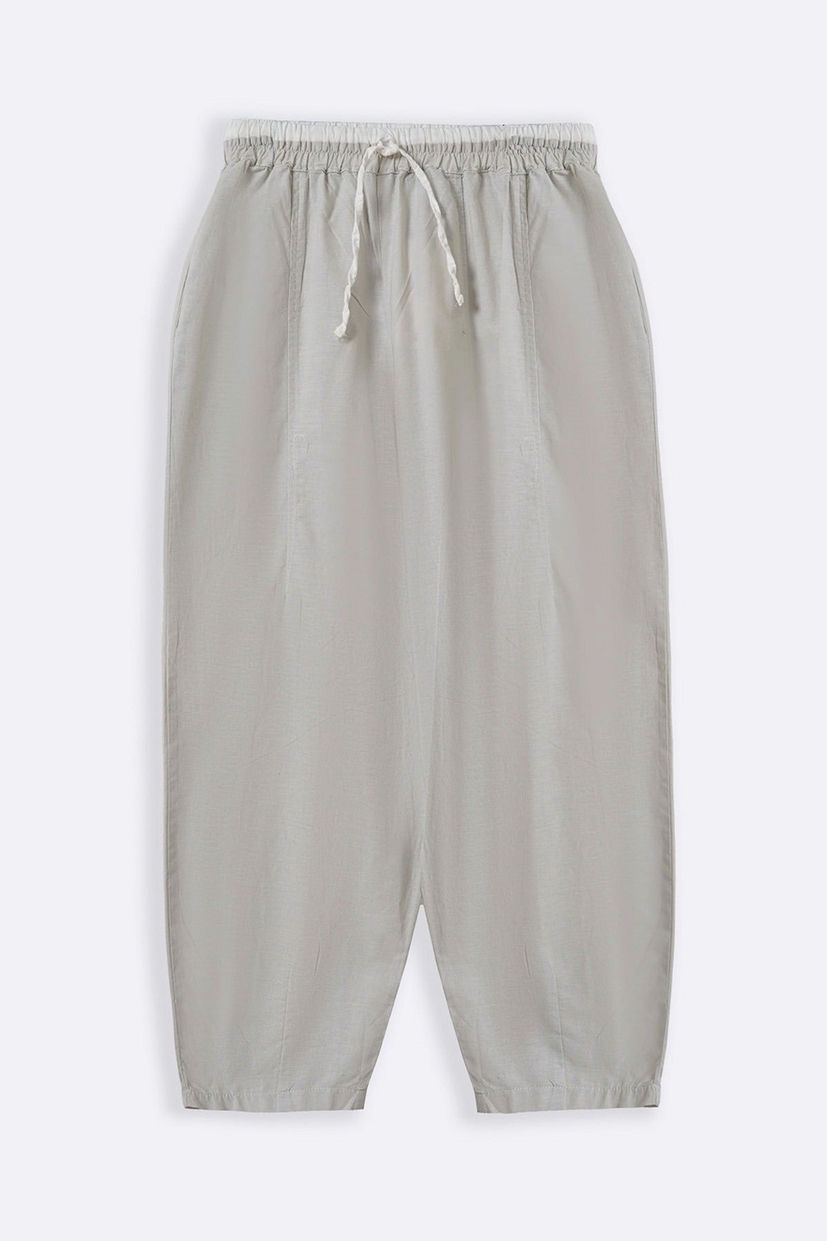 Design details: Barrel-fit pants featuring front side pockets and a contrasting elastic waistband with a drawstring all around.