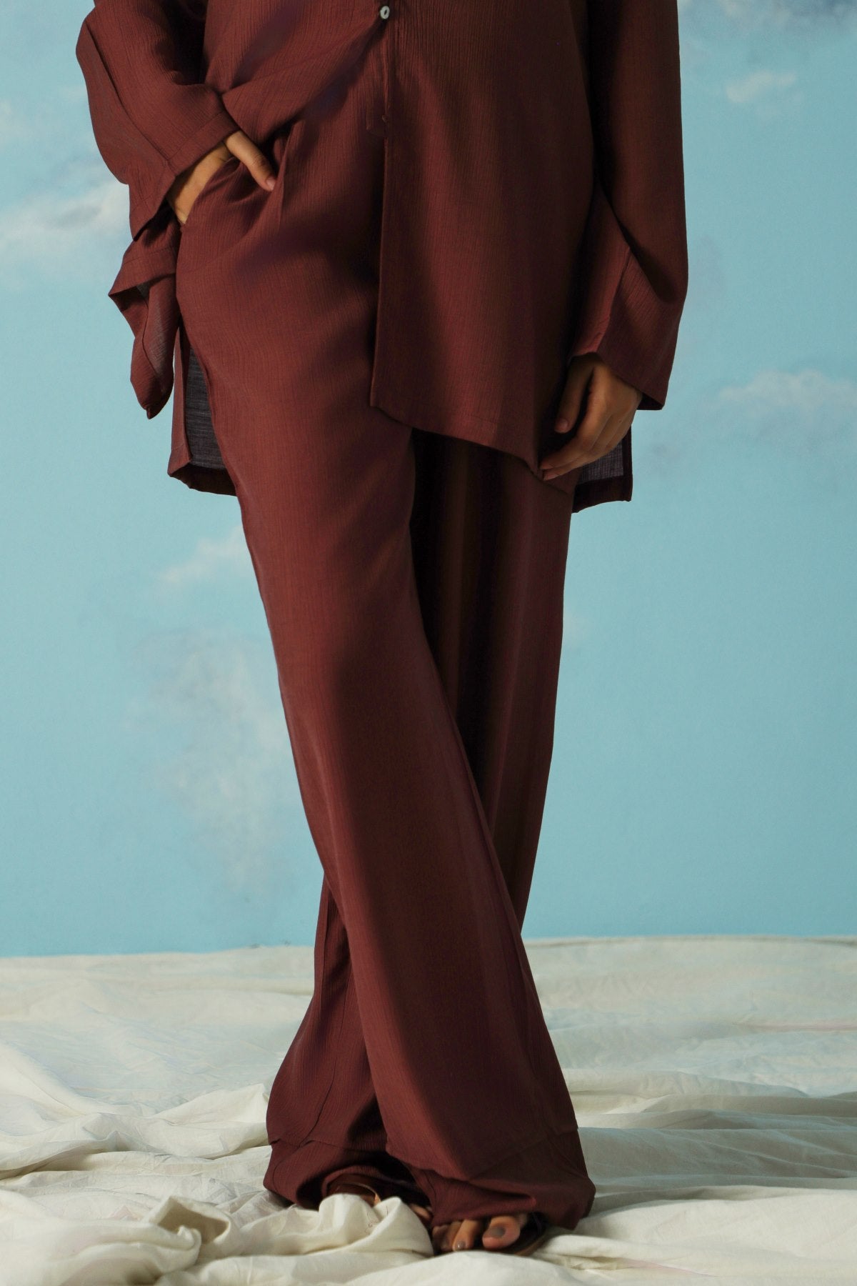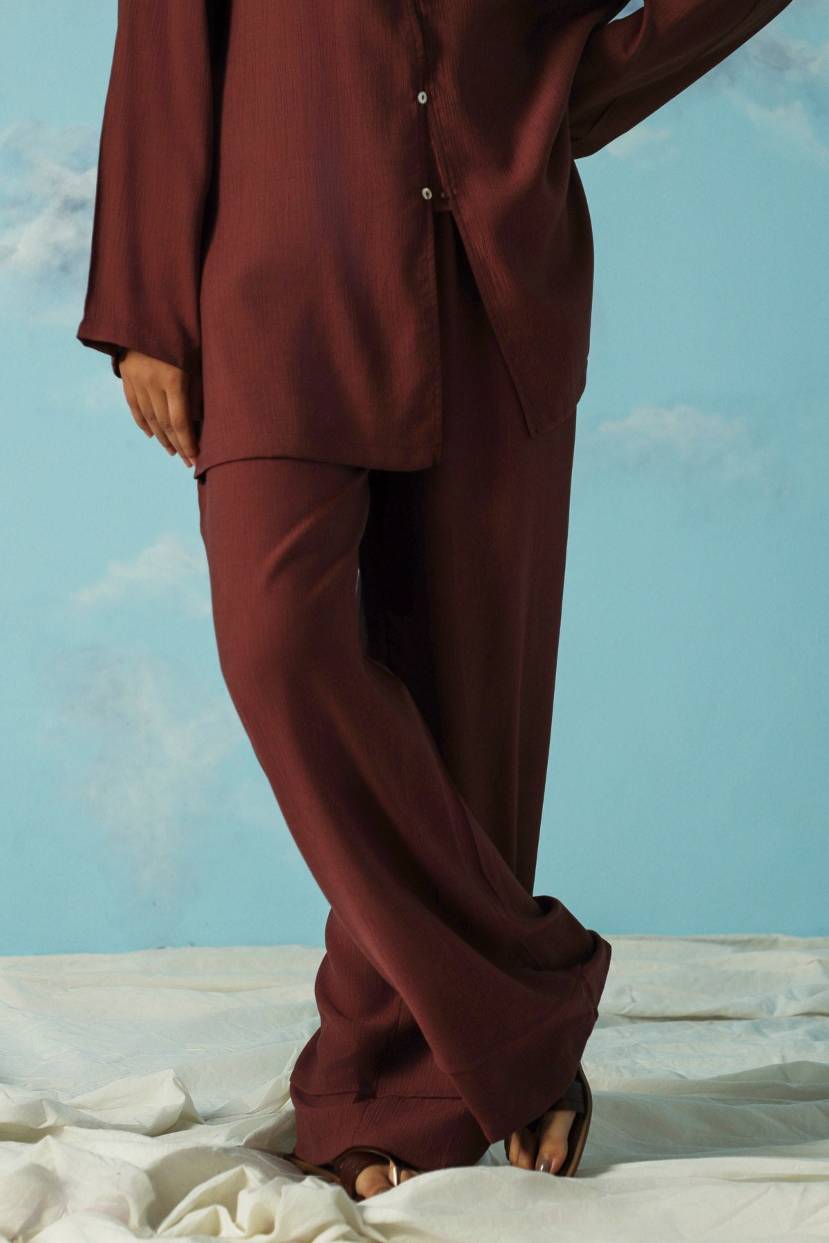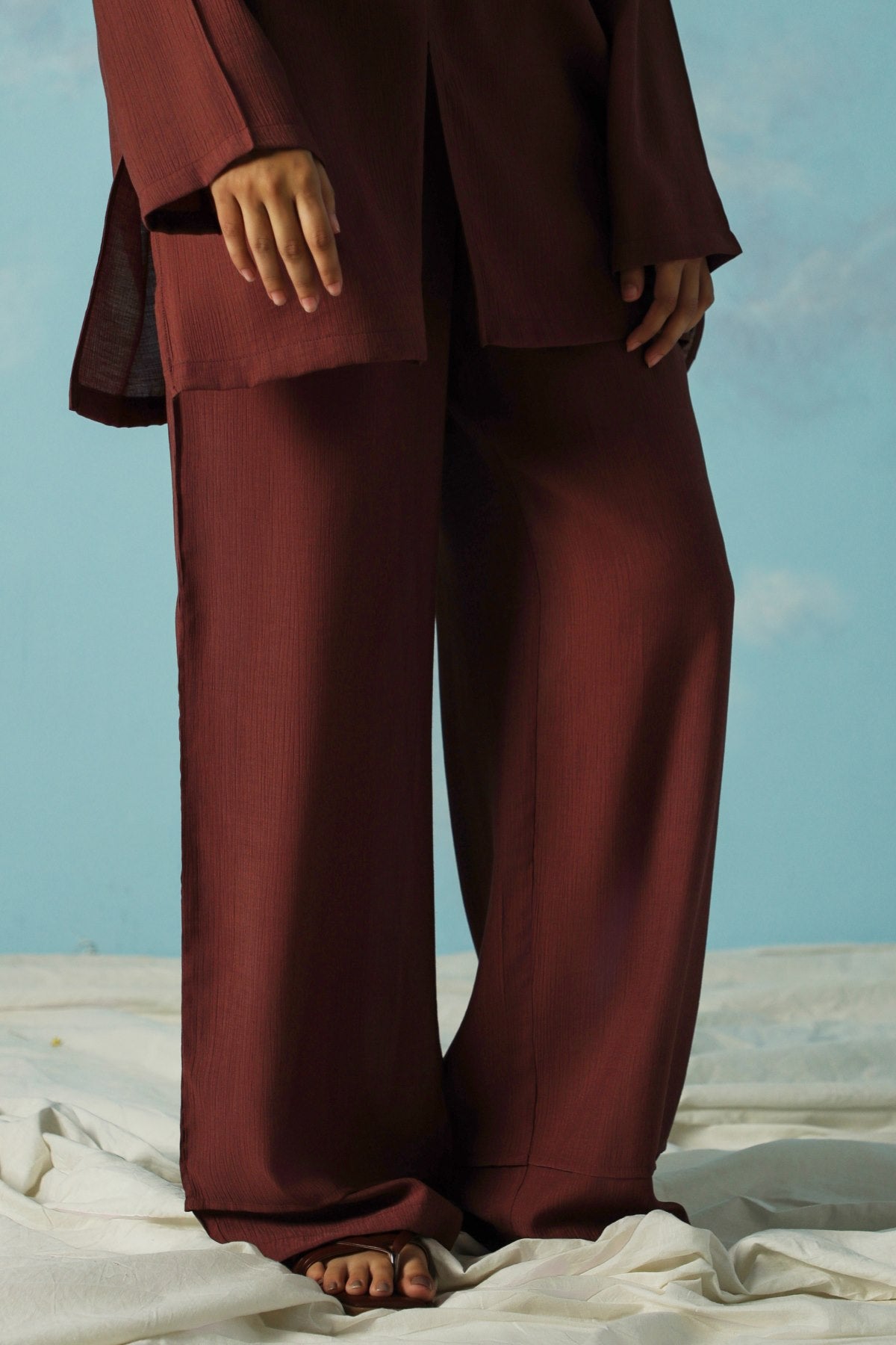 Design details: Relaxed fit pants with front side pockets, creased cut detail at bottom and an all around elasticated wasitband with drawstring.