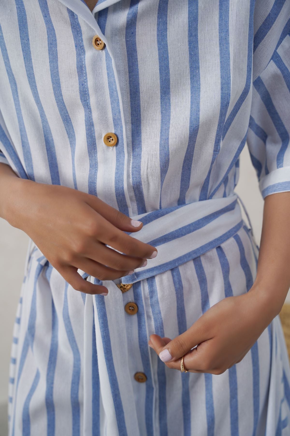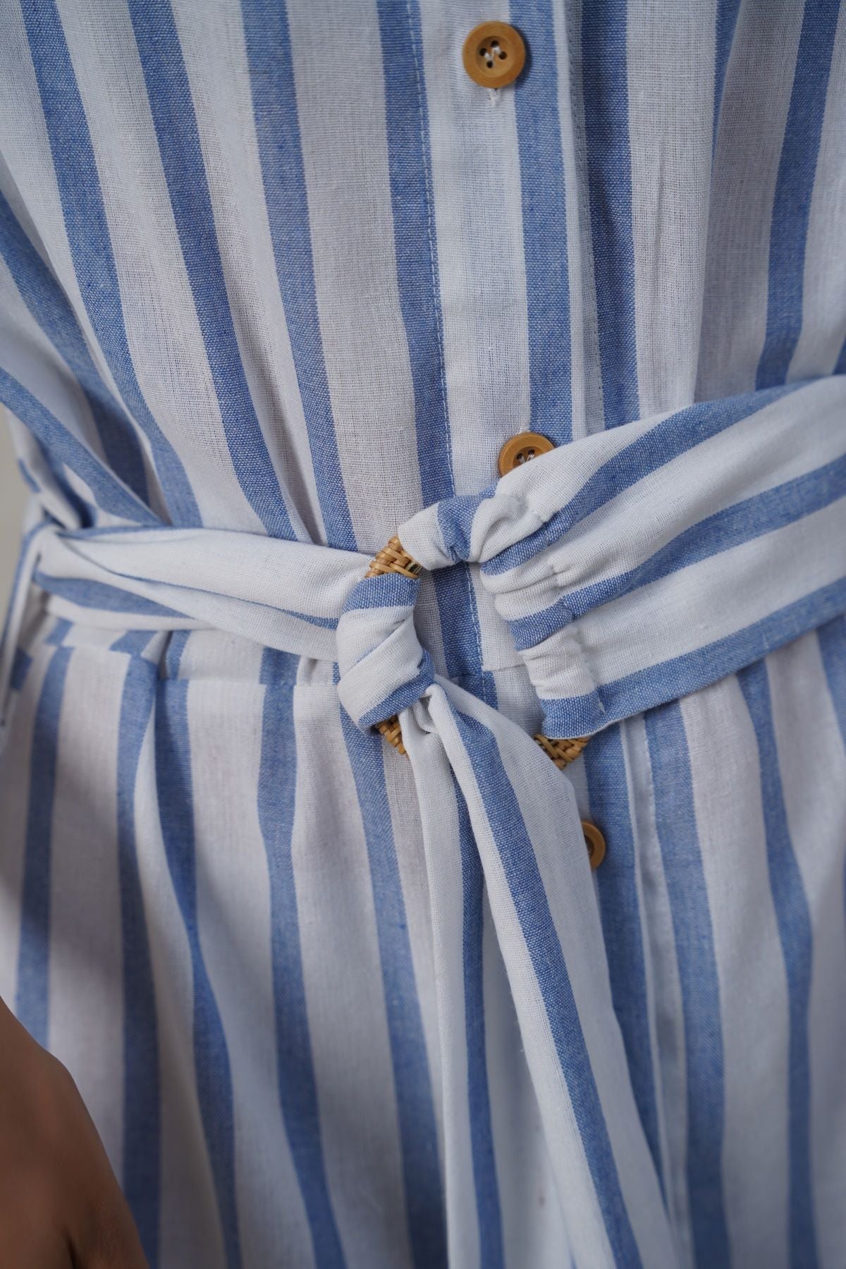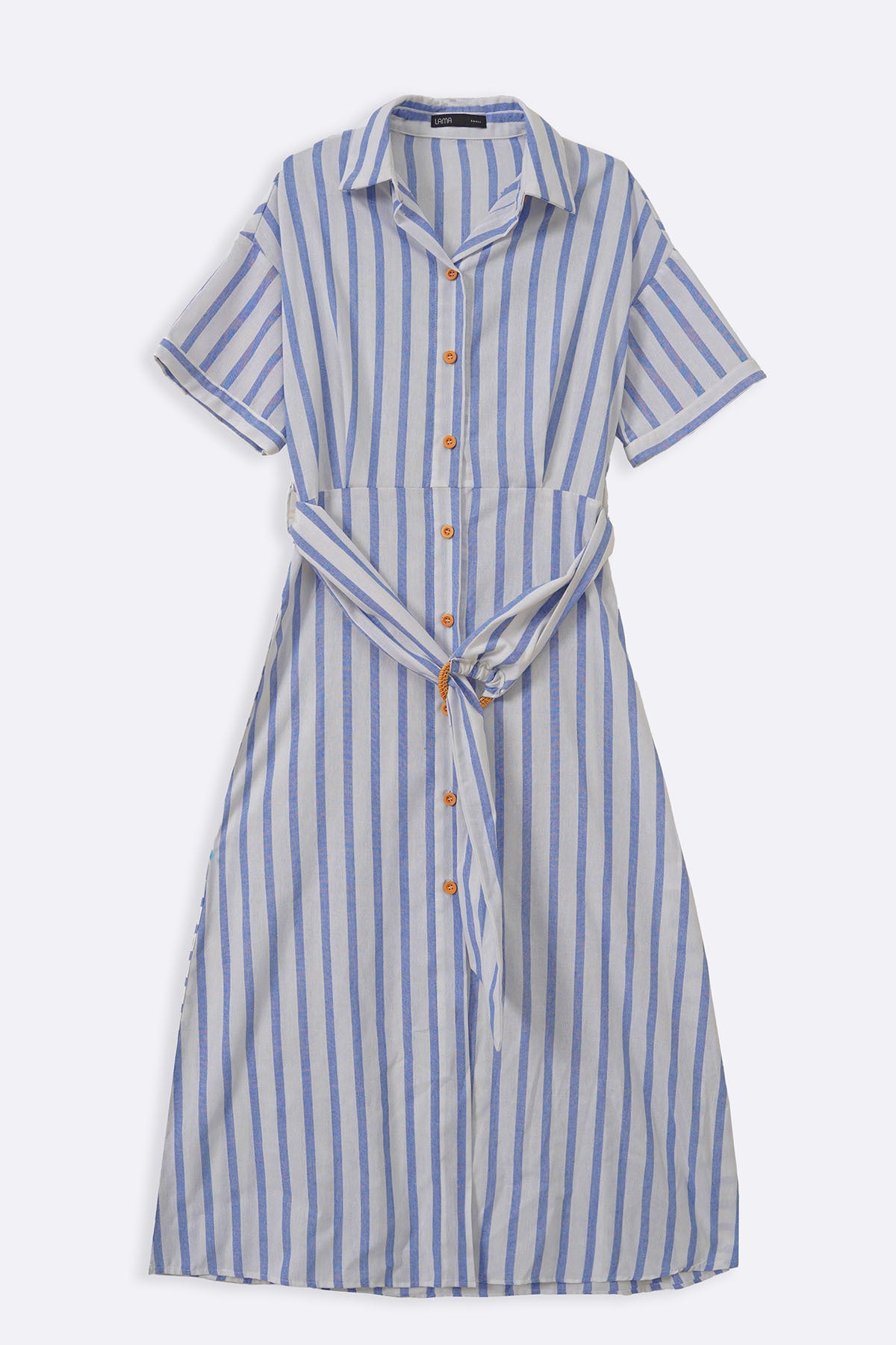 Design details: A full-length striped dress featuring short sleeves, a collar, and a front closure with wooden buttons. It includes side slits and comes with a coordinating belt with a buckle