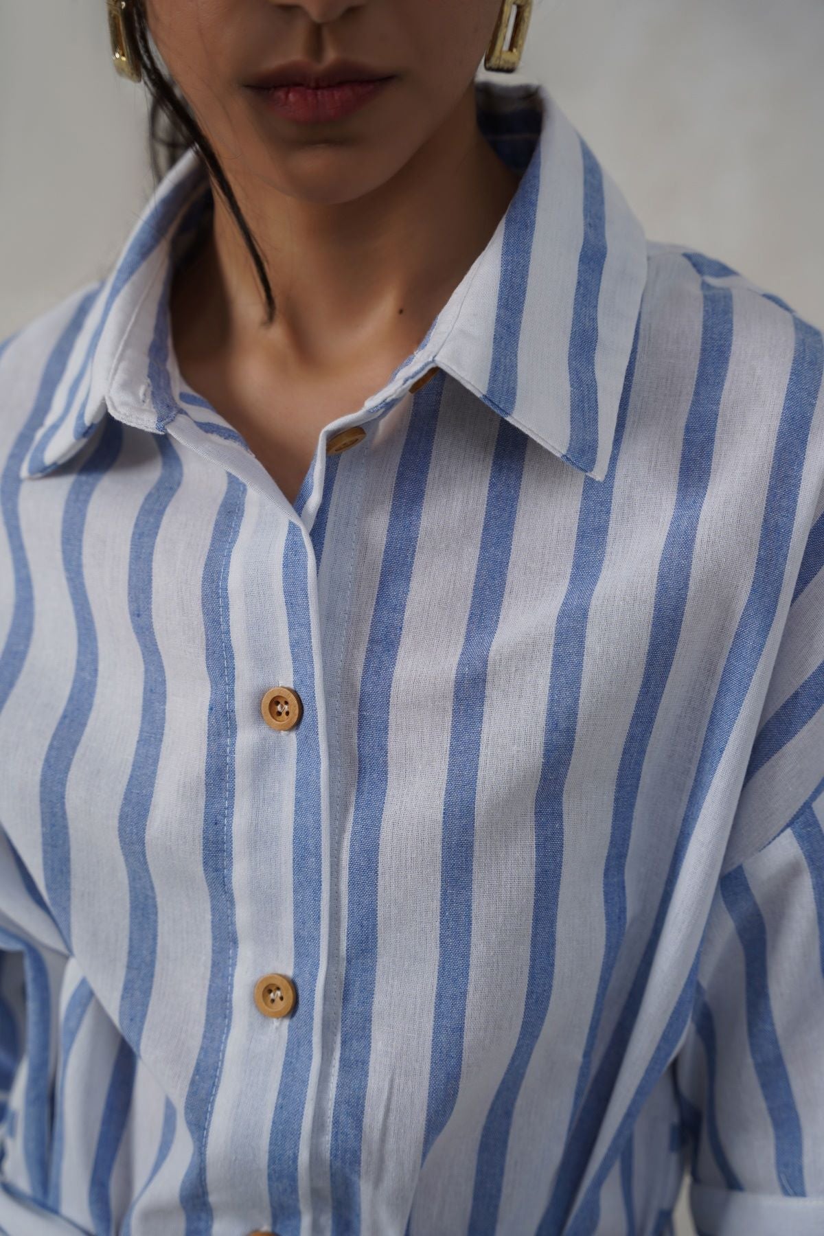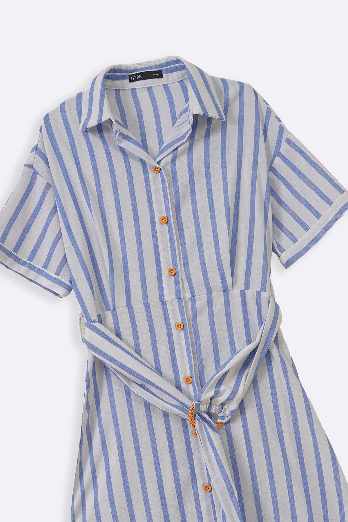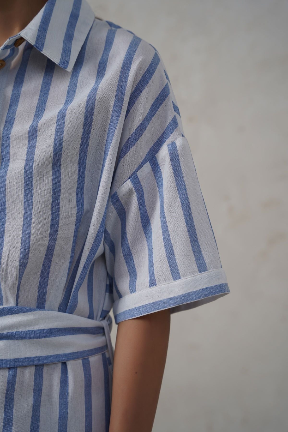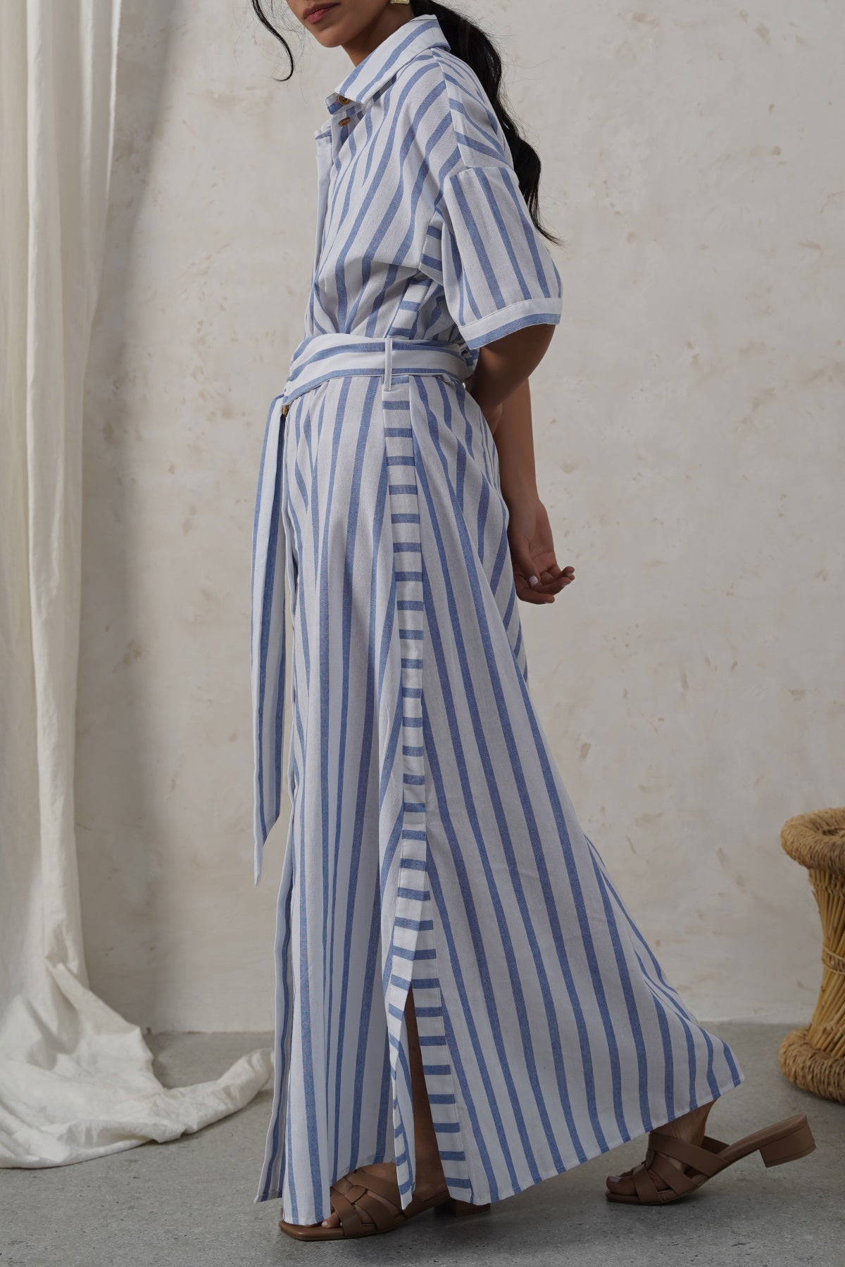 Design details: A full-length striped dress featuring short sleeves, a collar, and a front closure with wooden buttons. It includes side slits and comes with a coordinating belt with a buckle