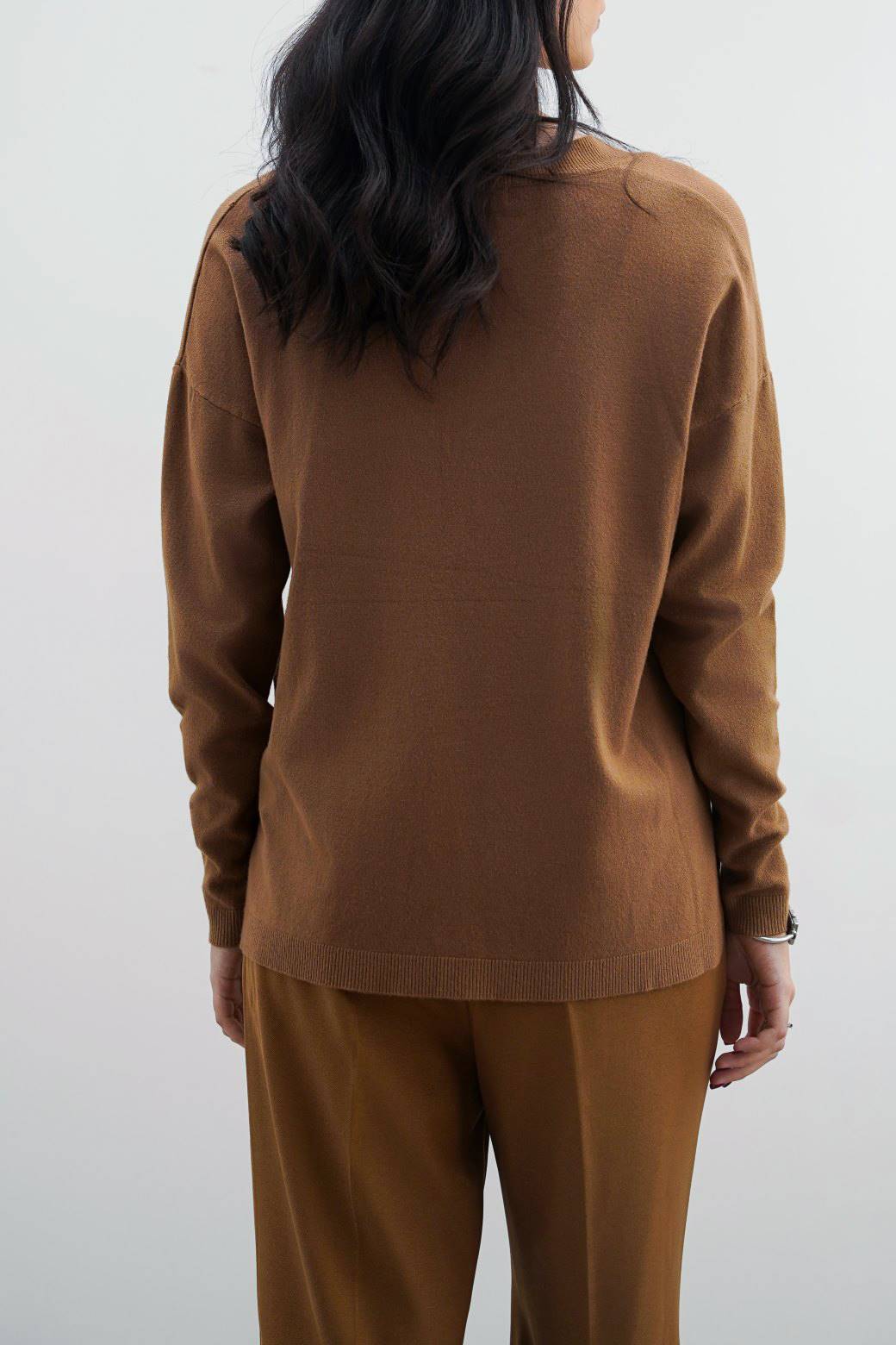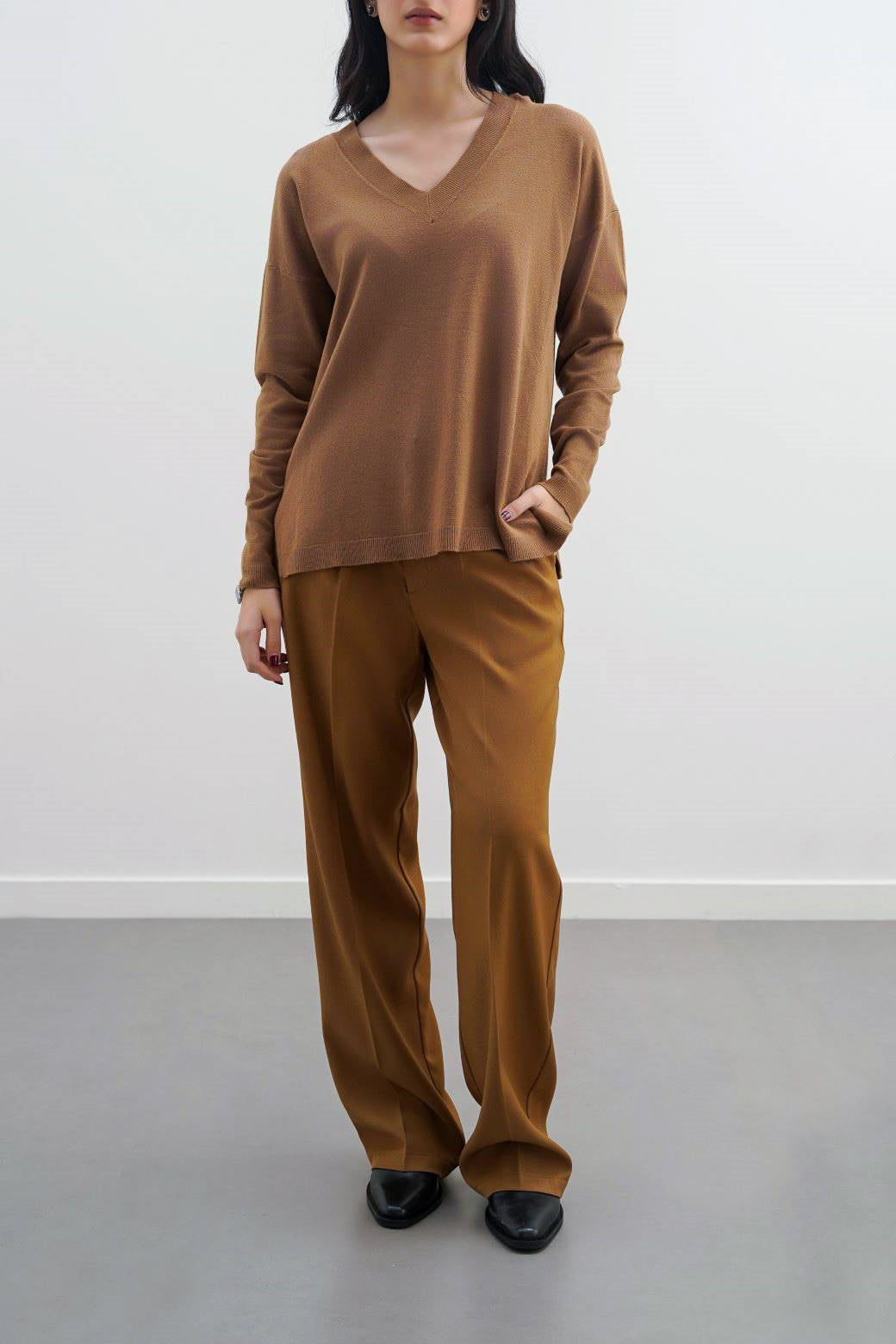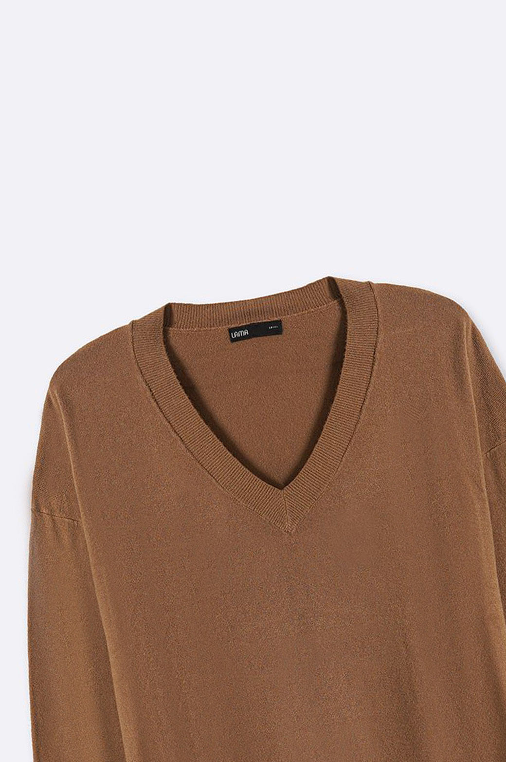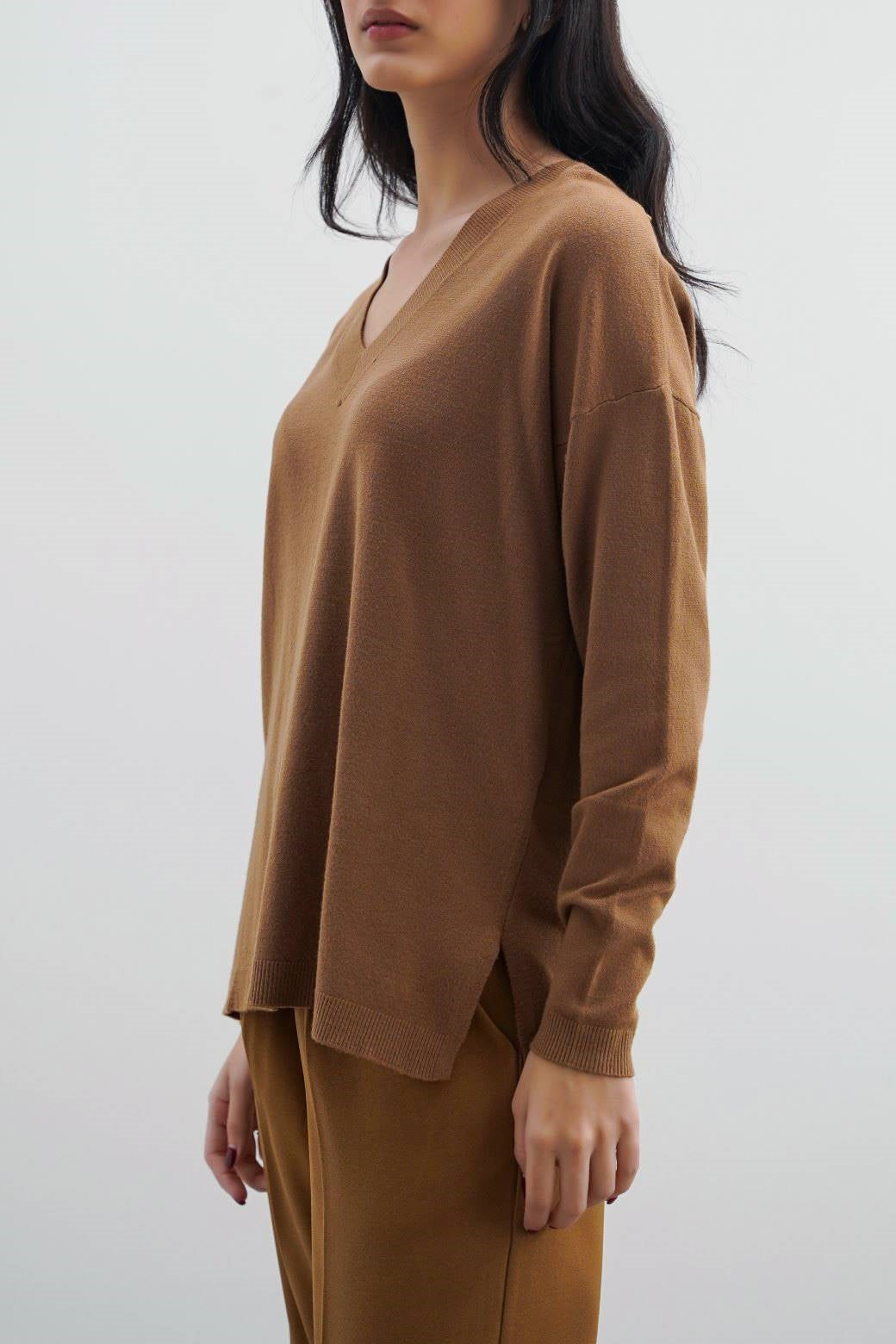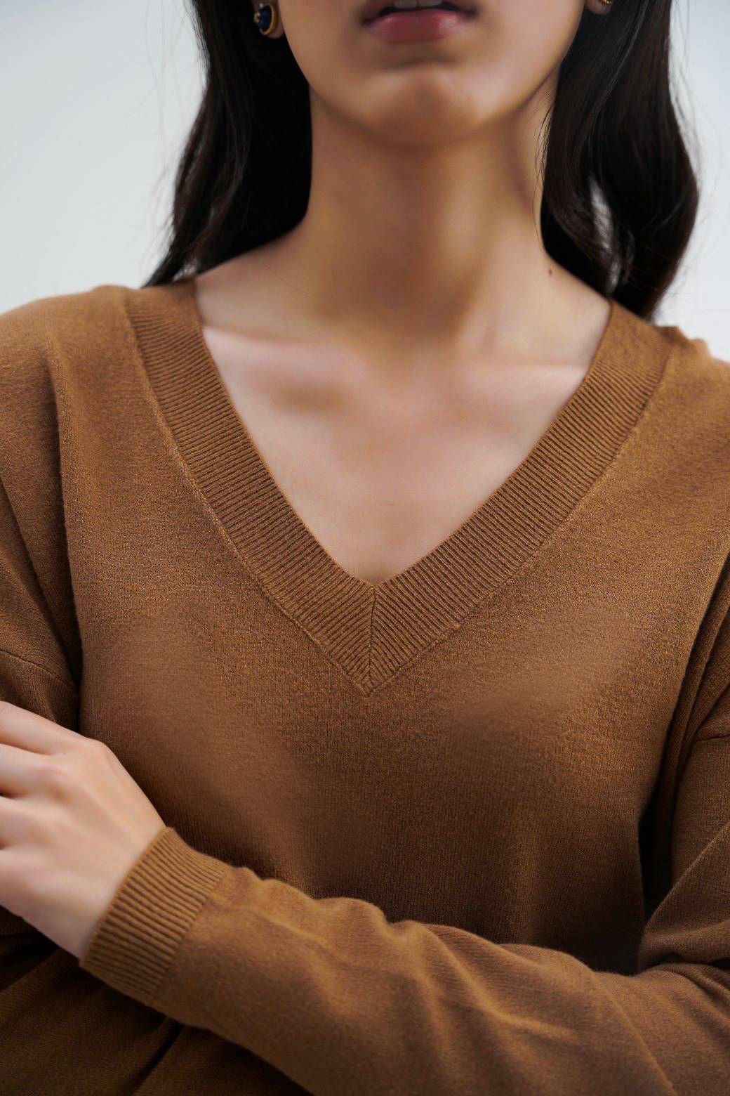 Design detail: Soft, fine knit sweater for daily wear. Low-cut V-neck, dropped shoulders, and long sleeves. Ribbing at neckline, cuffs, and hem along with side slits.