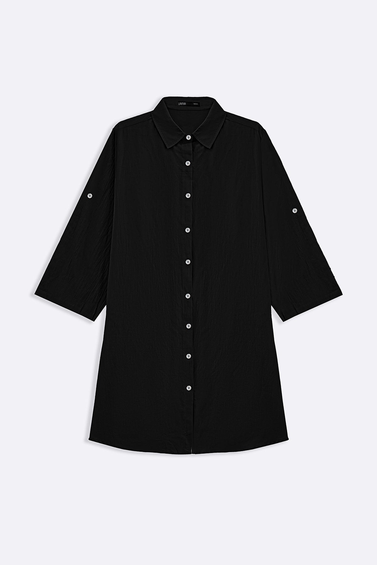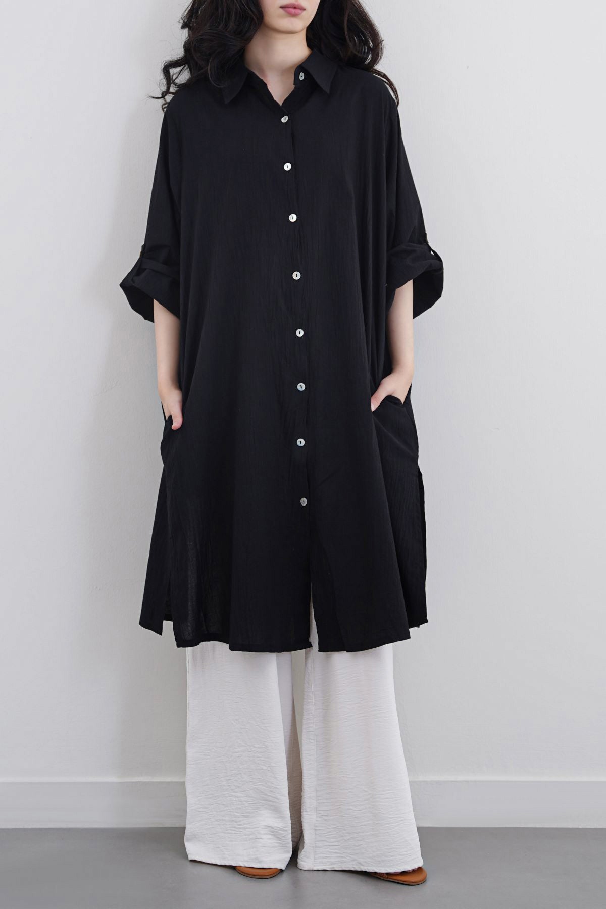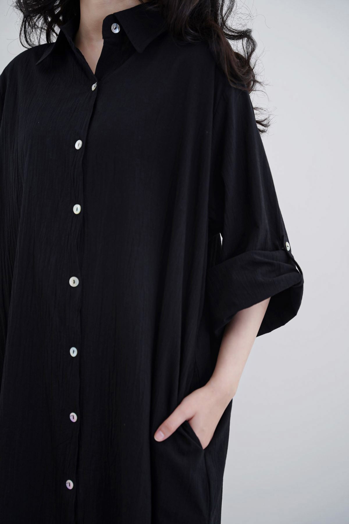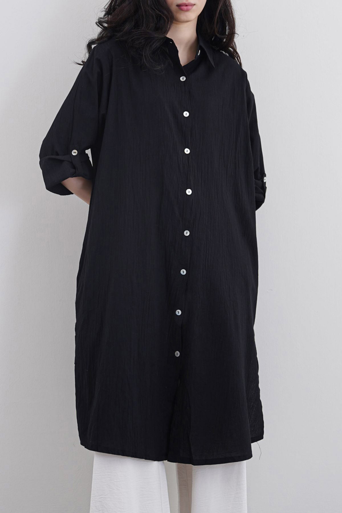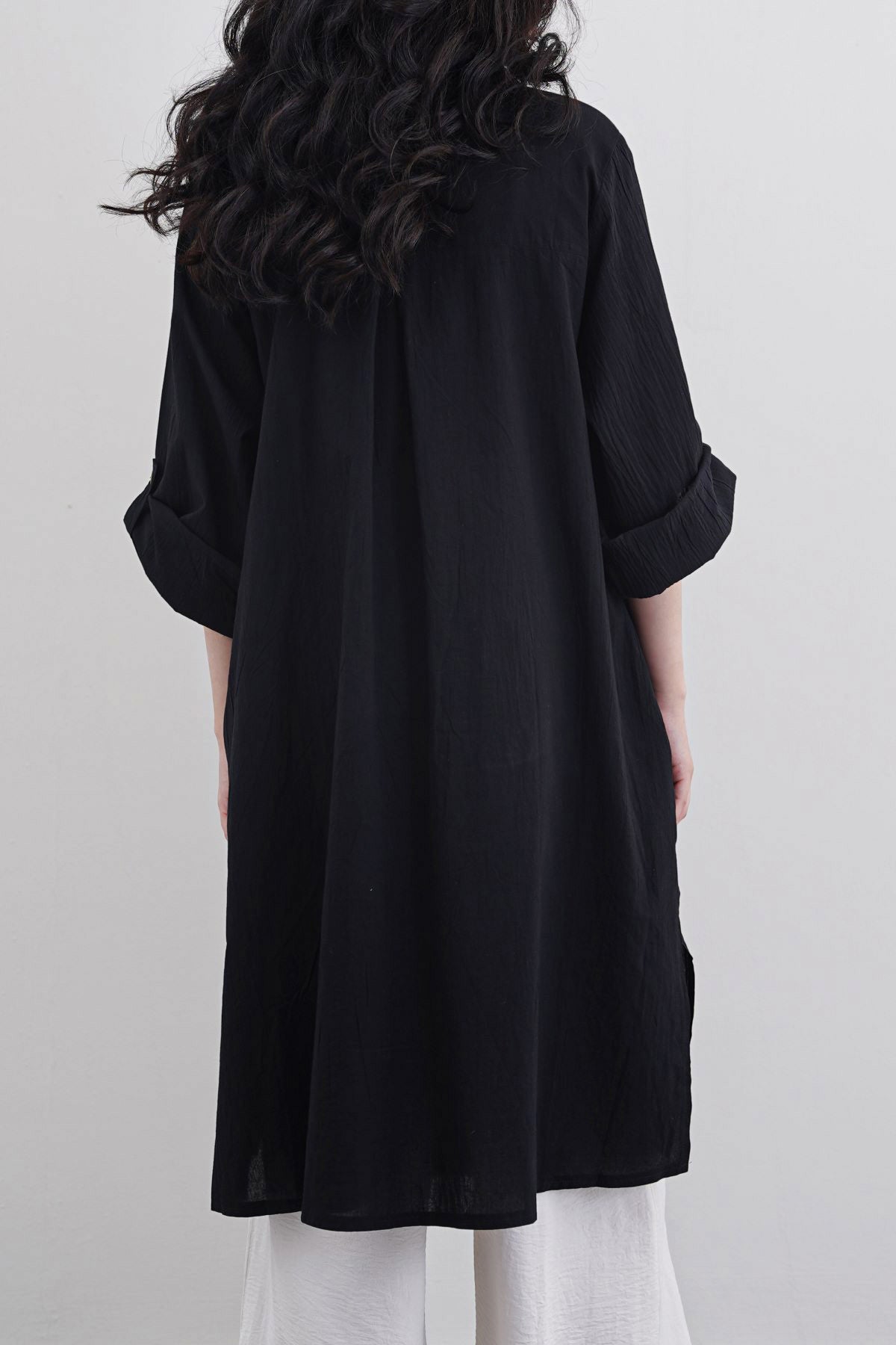 Design details: Breezy fabric feel with a little crinkle. Small side slits and side pockets with mother of pearl buttons.