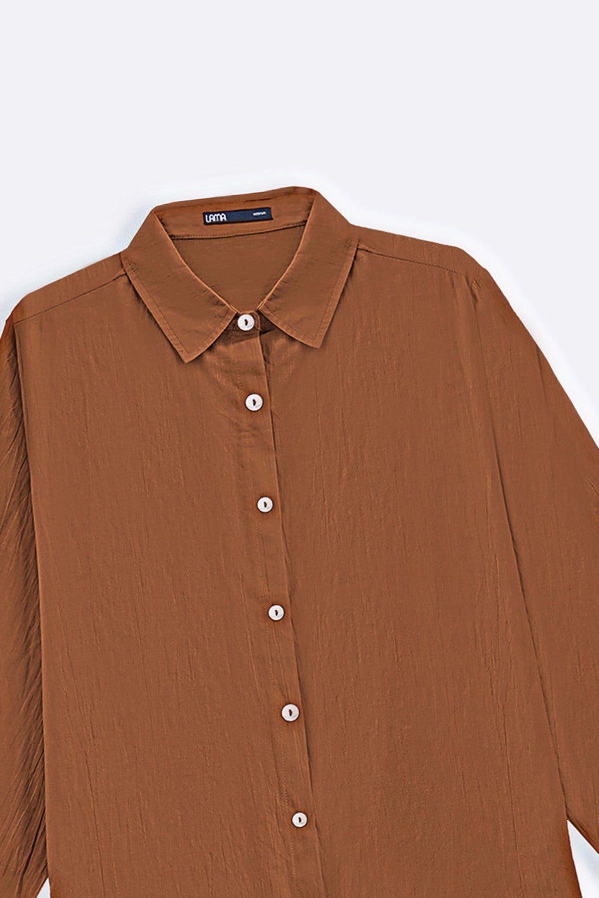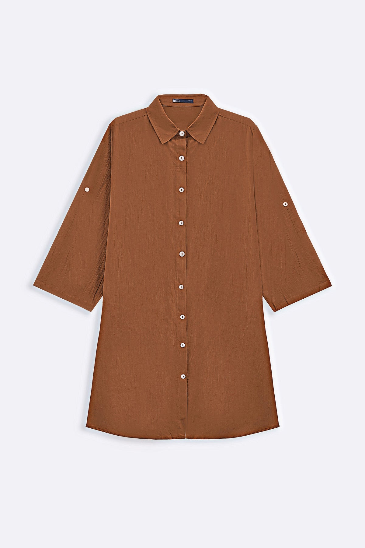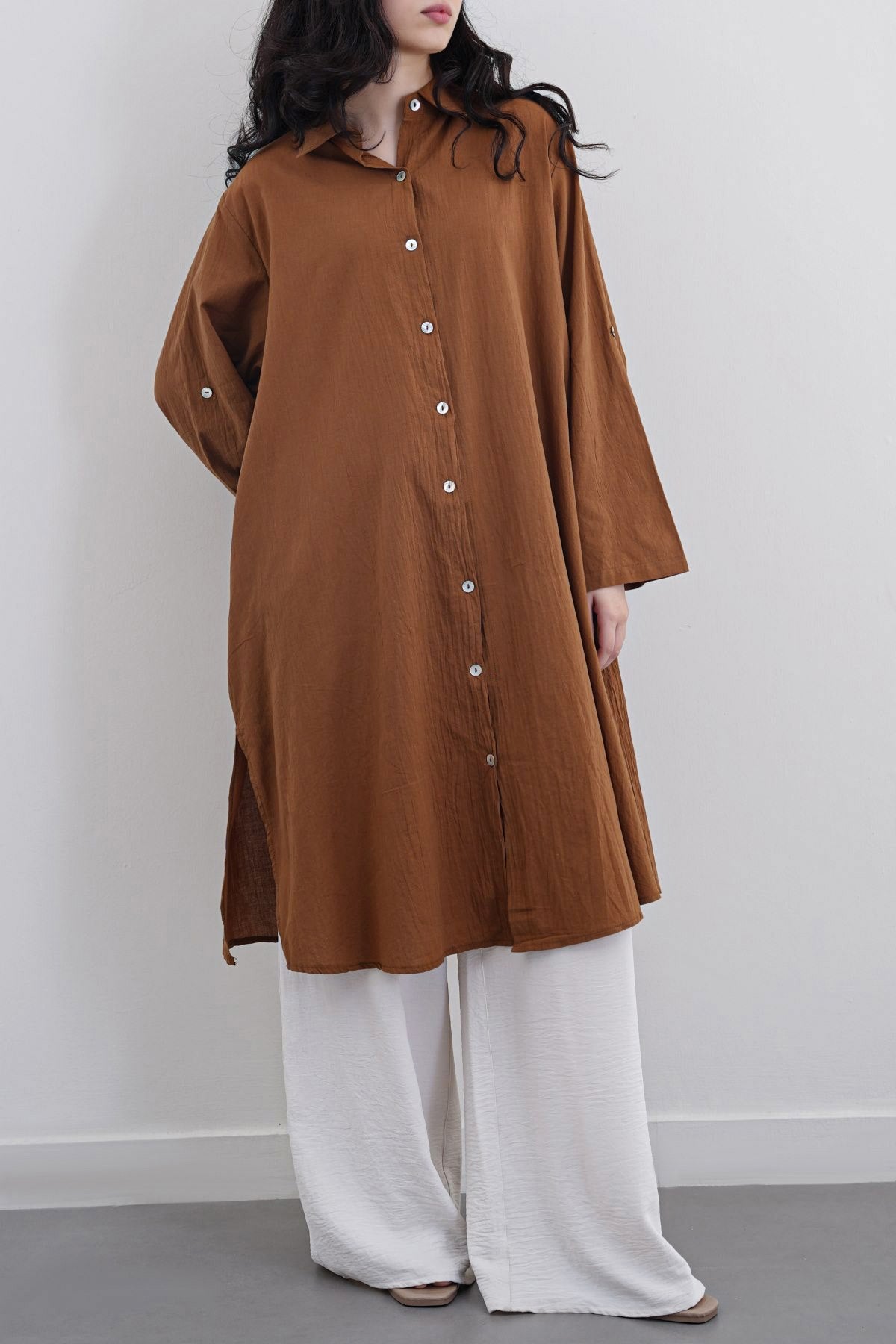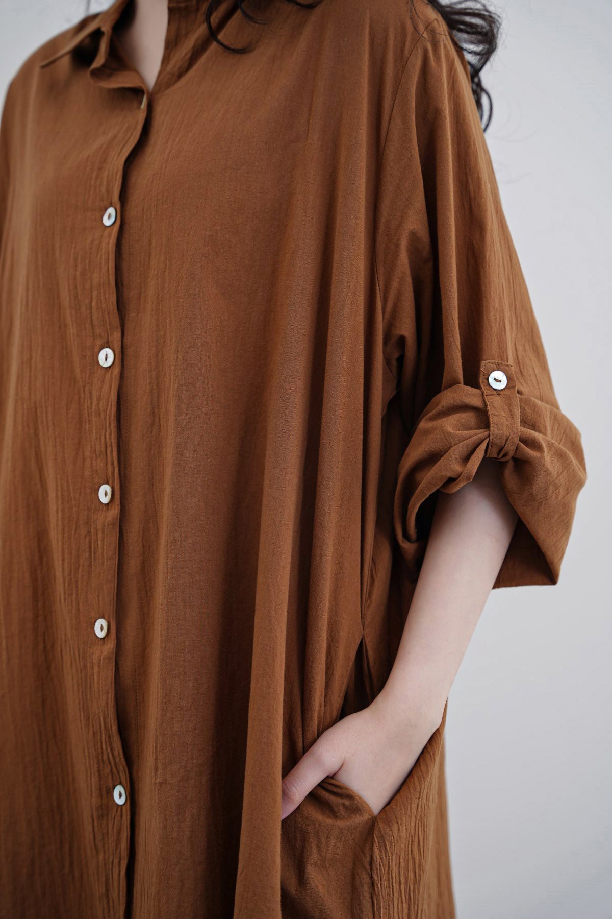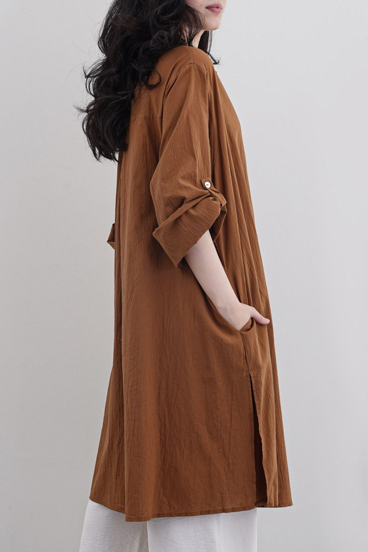 Design details: Breezy fabric feel with a little crinkle. Small side slits and side pockets with mother of pearl buttons.