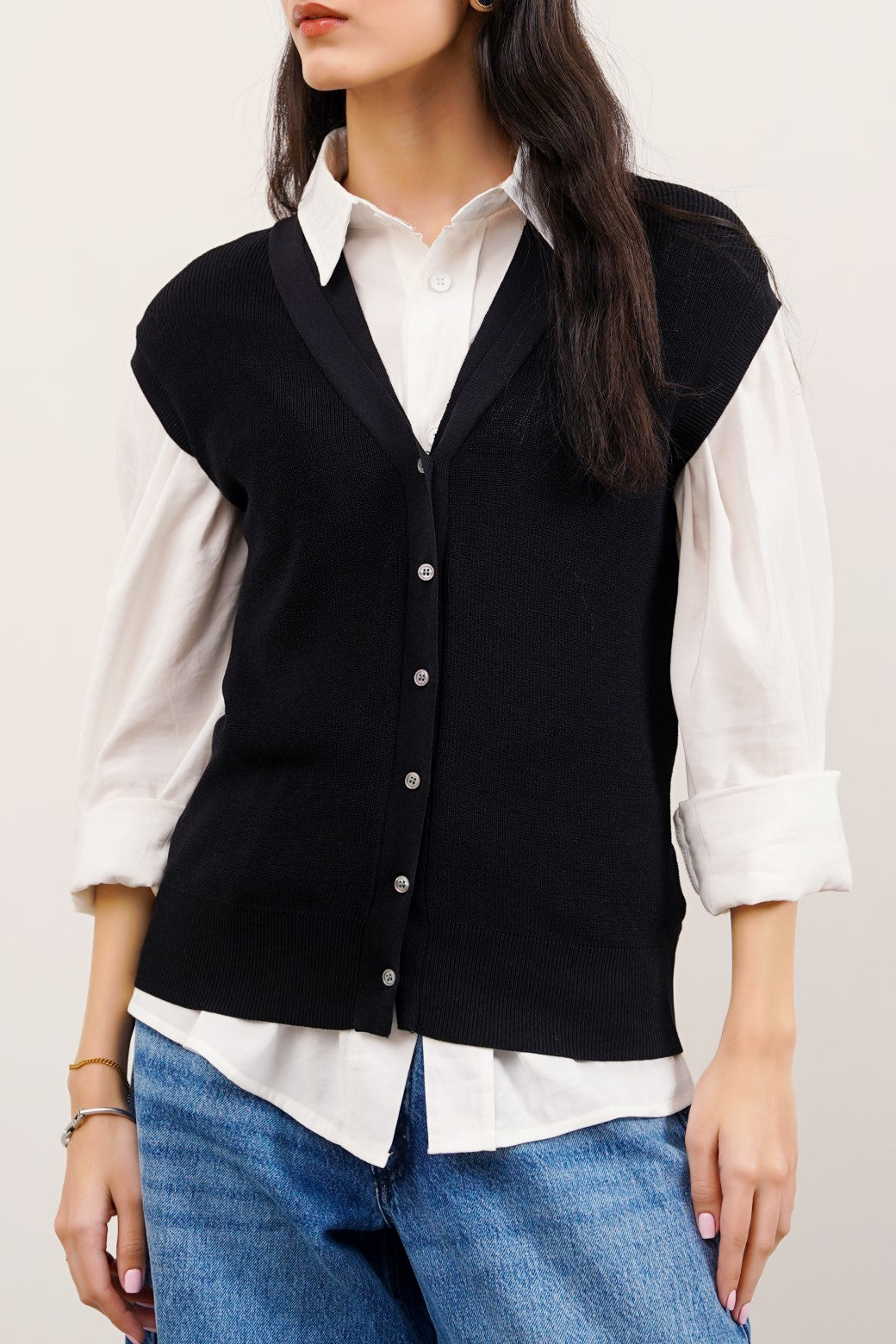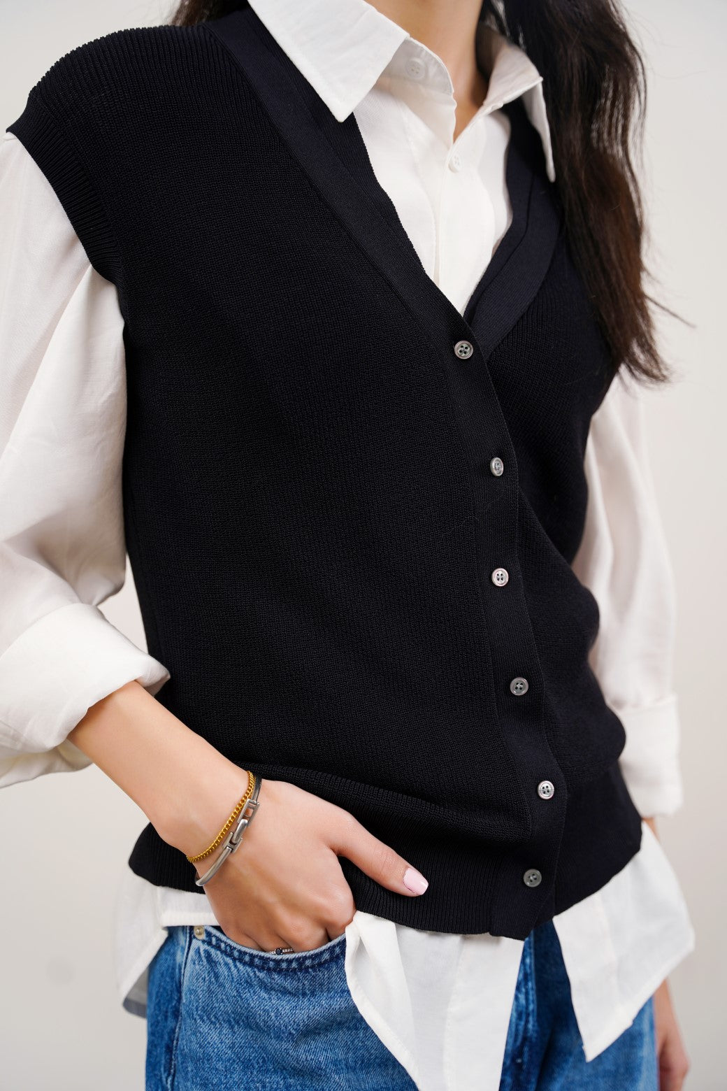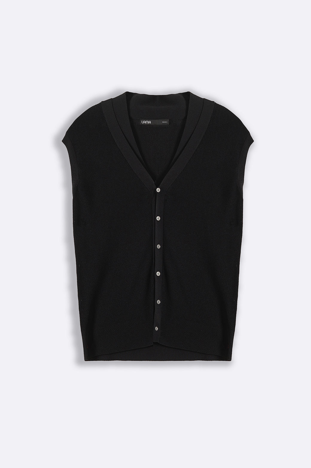 Design detail: This sleeveless rib-knit cardigan is finely knitted from different blends of yarn. It's cut in a regular silhouette and features a ribbed hem and armhole along with front button other of pearl fastening.