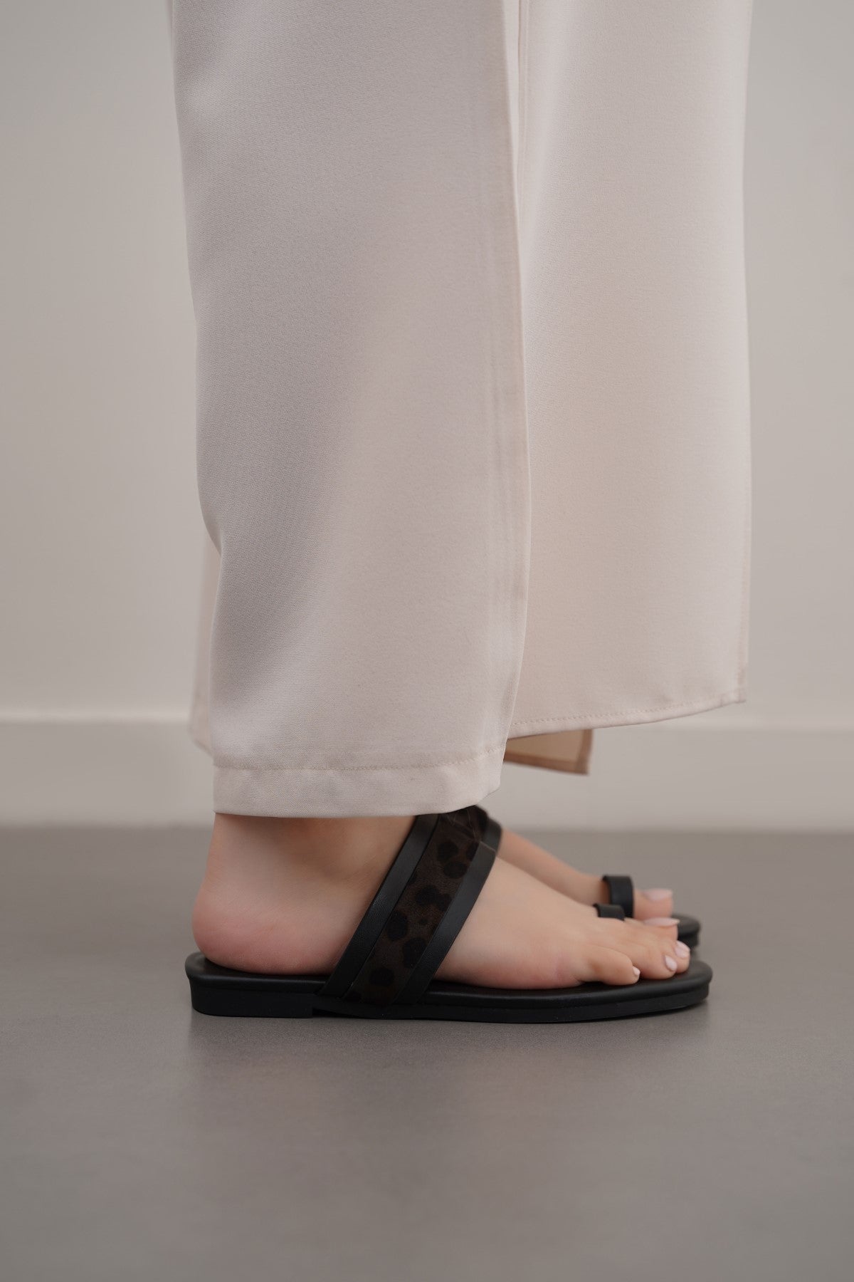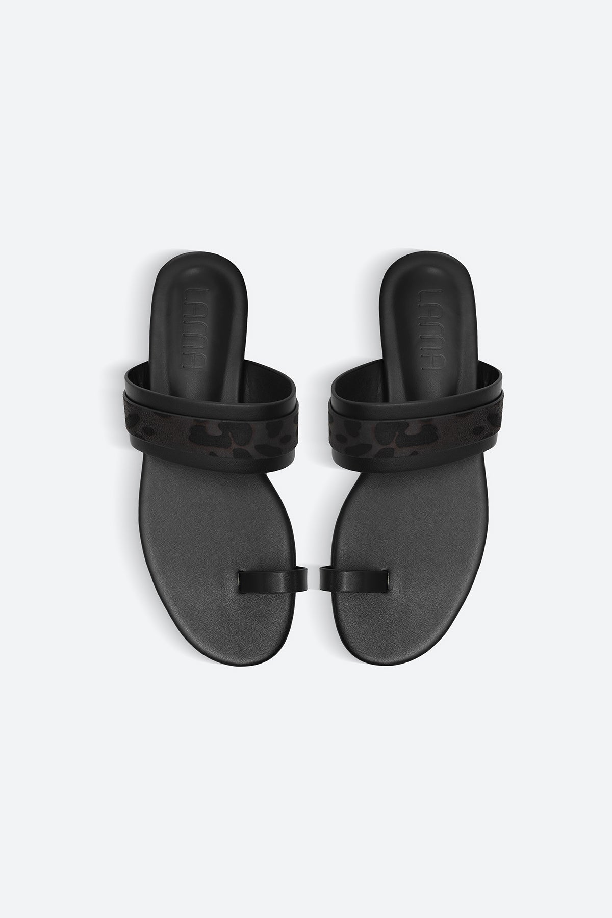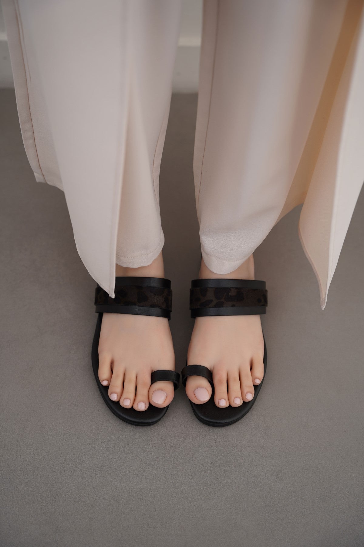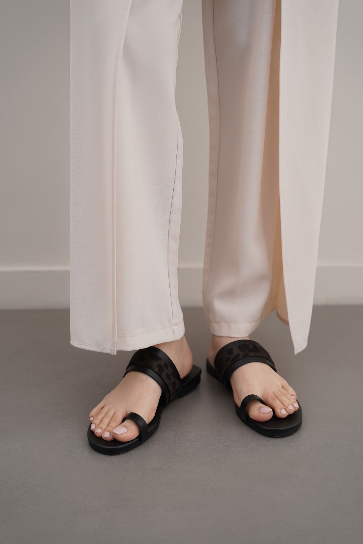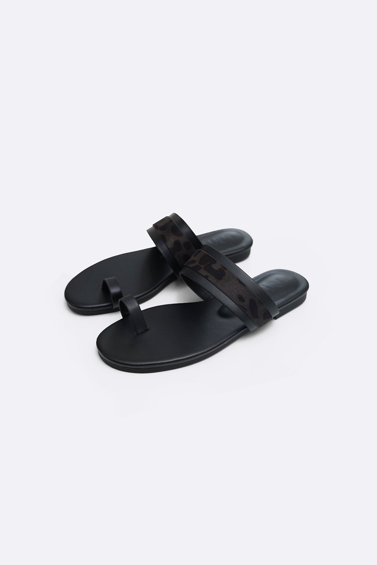 Summer toe ring slides with animal print strap on the instep.