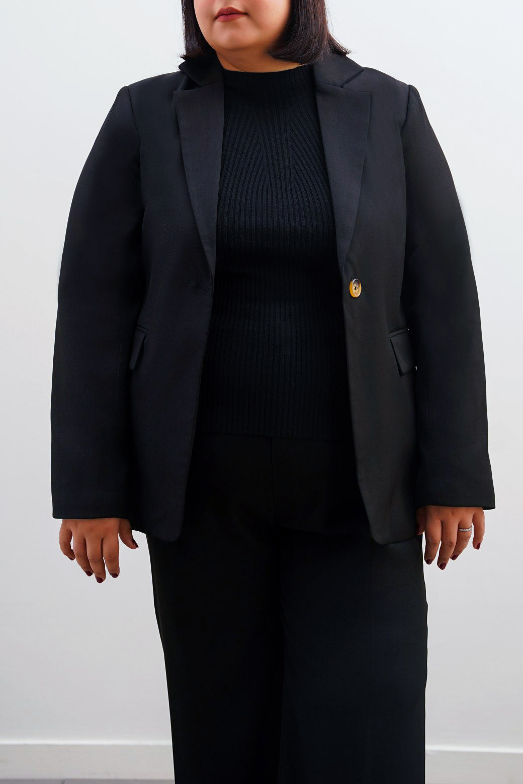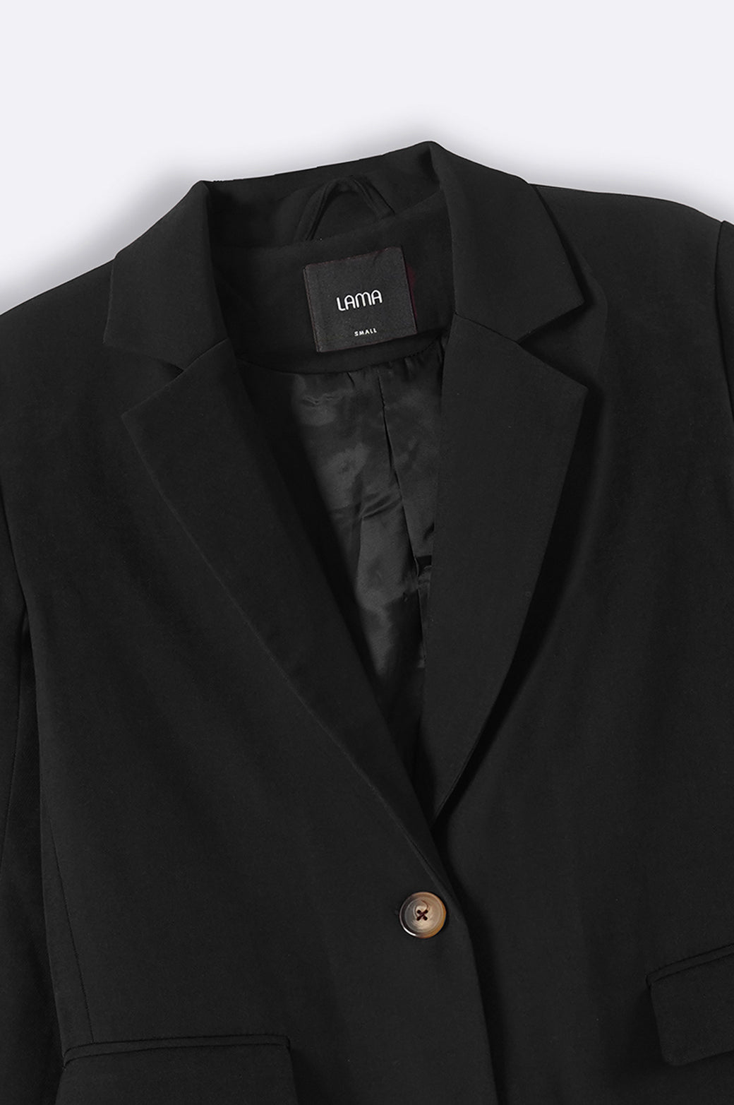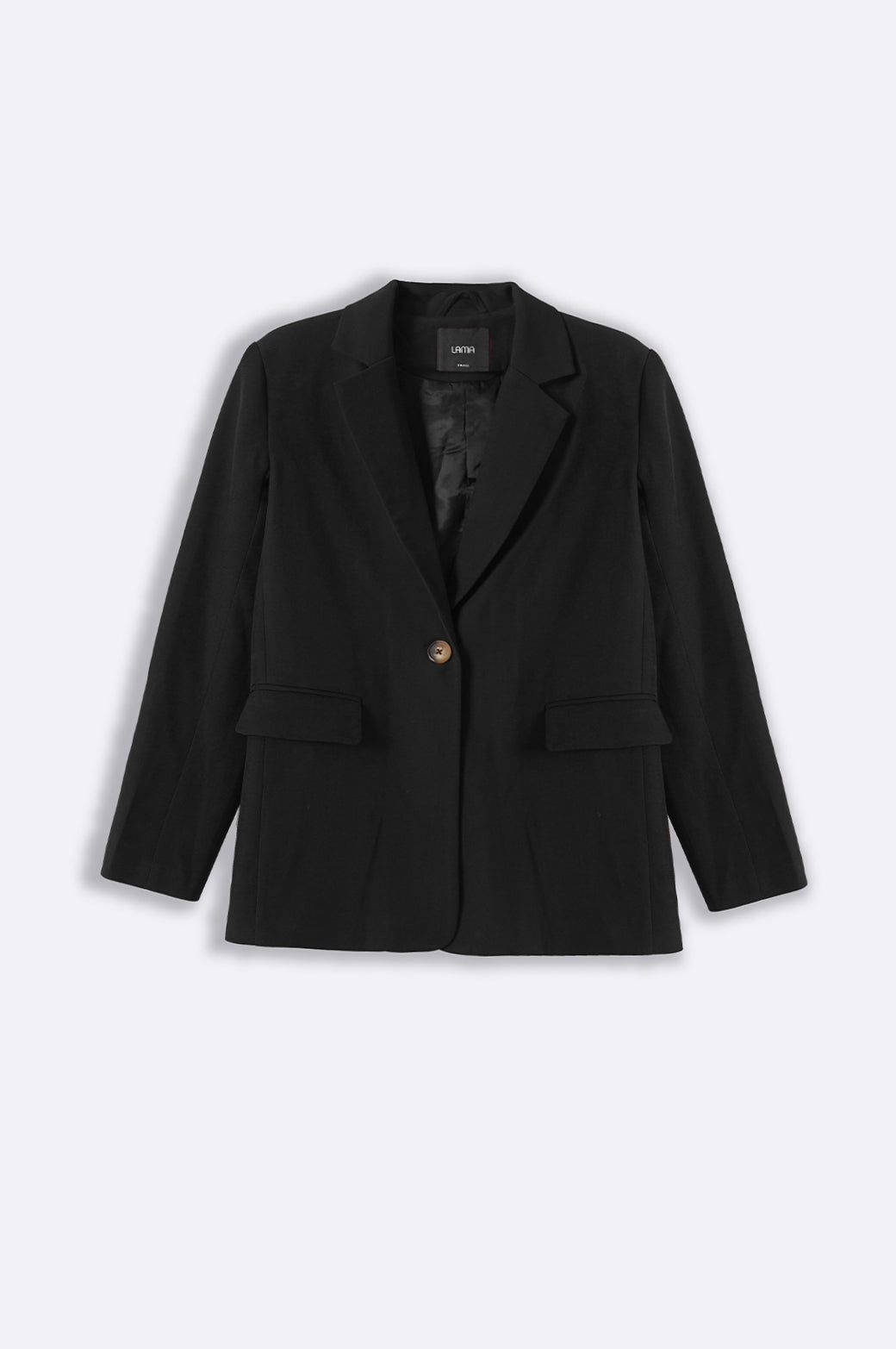 Design details: Single-breasted blazer with a notch collar and side welt pockets with flap. It has a vent at back and front single button closure.