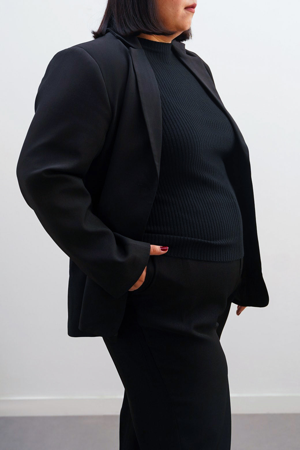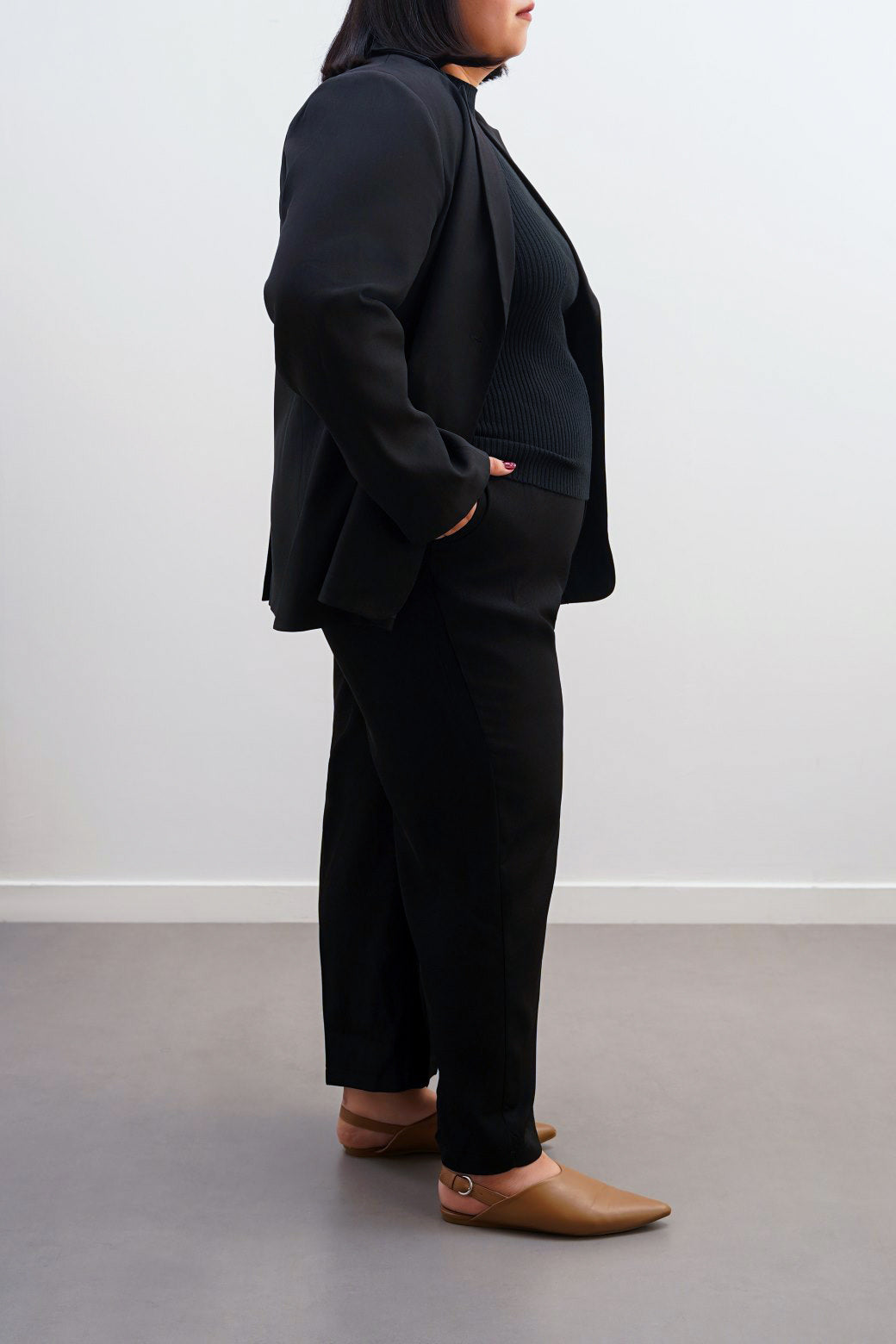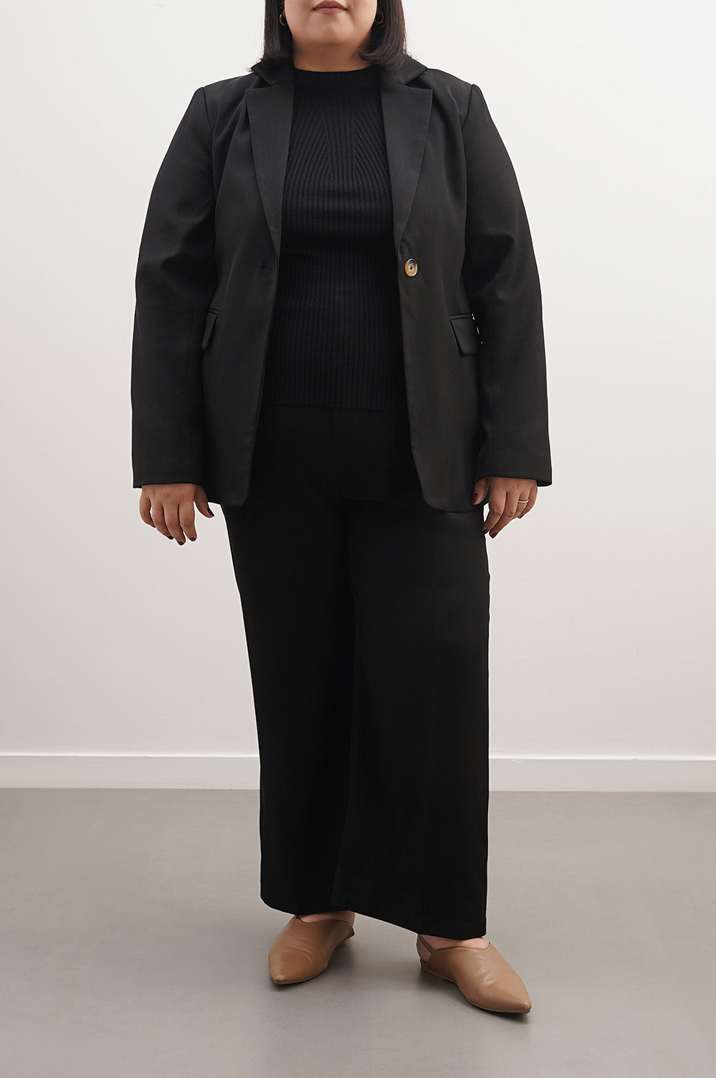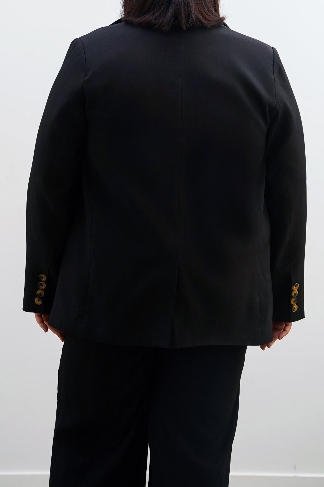 Design details: Single-breasted blazer with a notch collar and side welt pockets with flap. It has a vent at back and front single button closure.