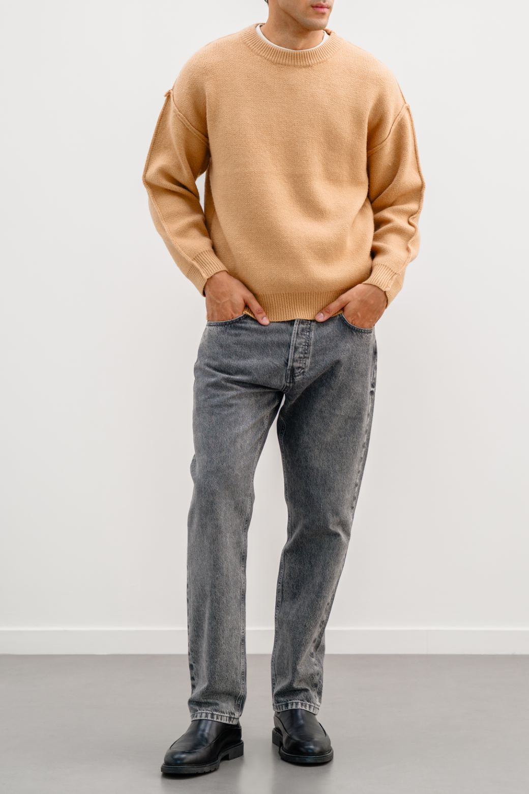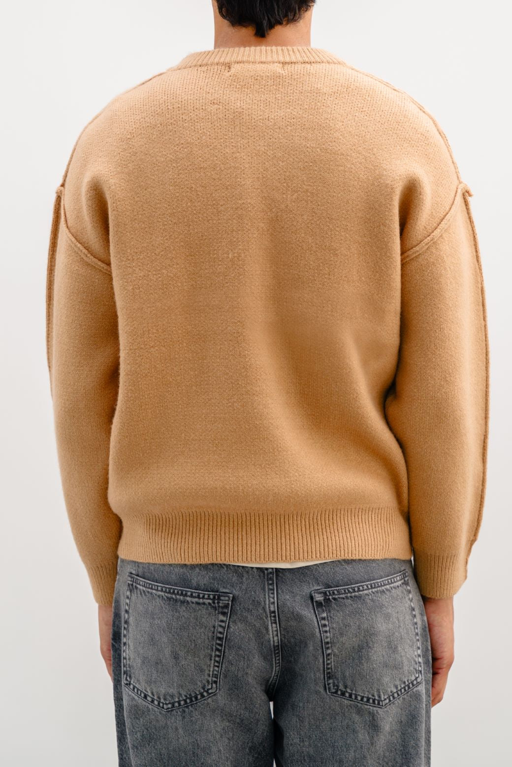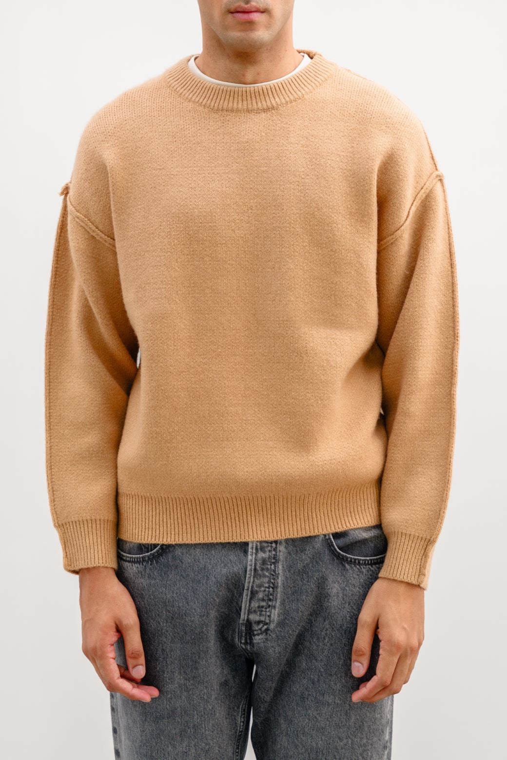 Design details: Drop shoulder sweater with crew neck and long sleeves featuring rib trims.