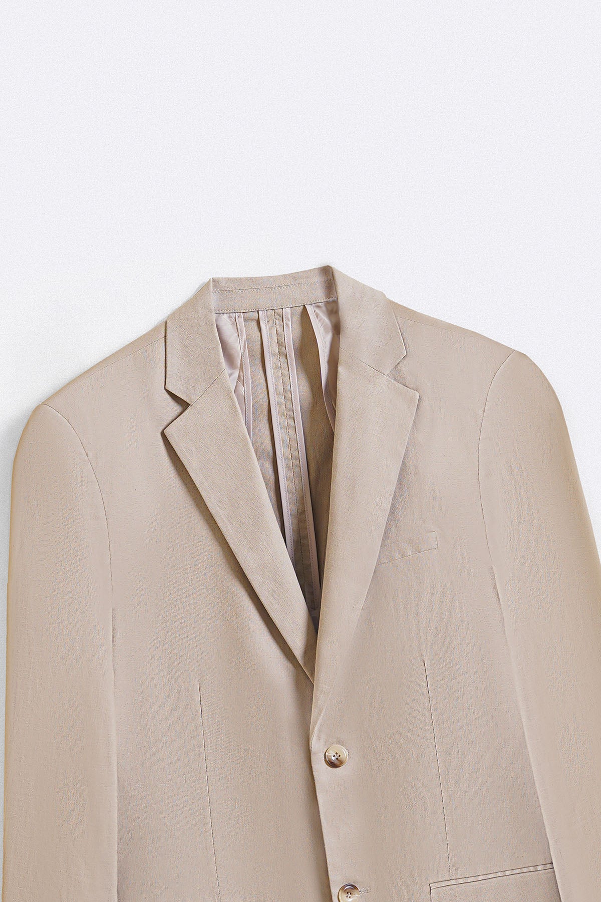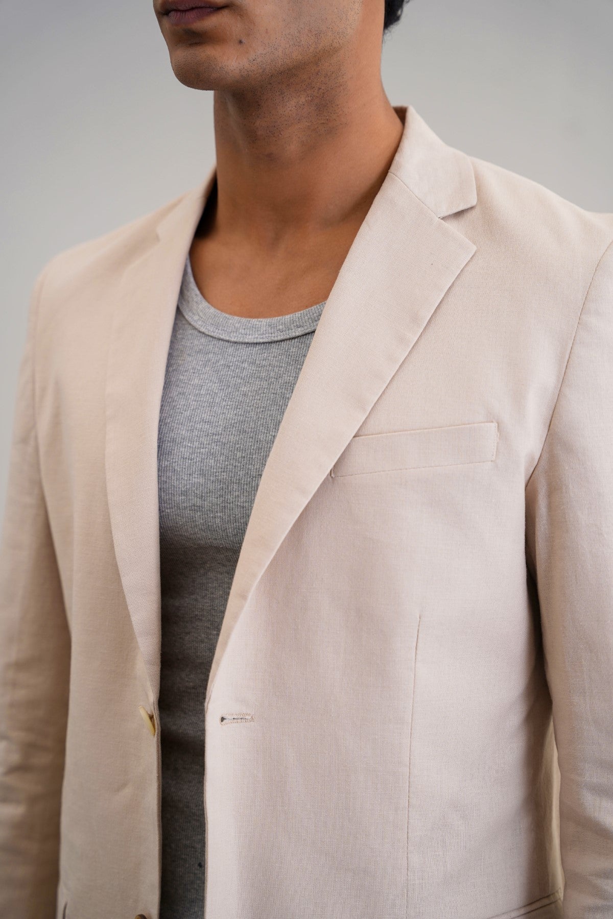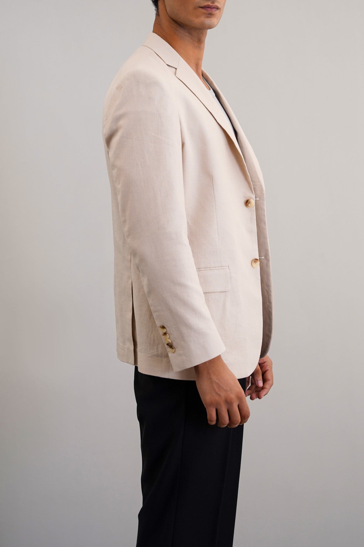 Design details: Light-weight, linen blazer without lining. Front button closure with side flap pockets and double rear vents.