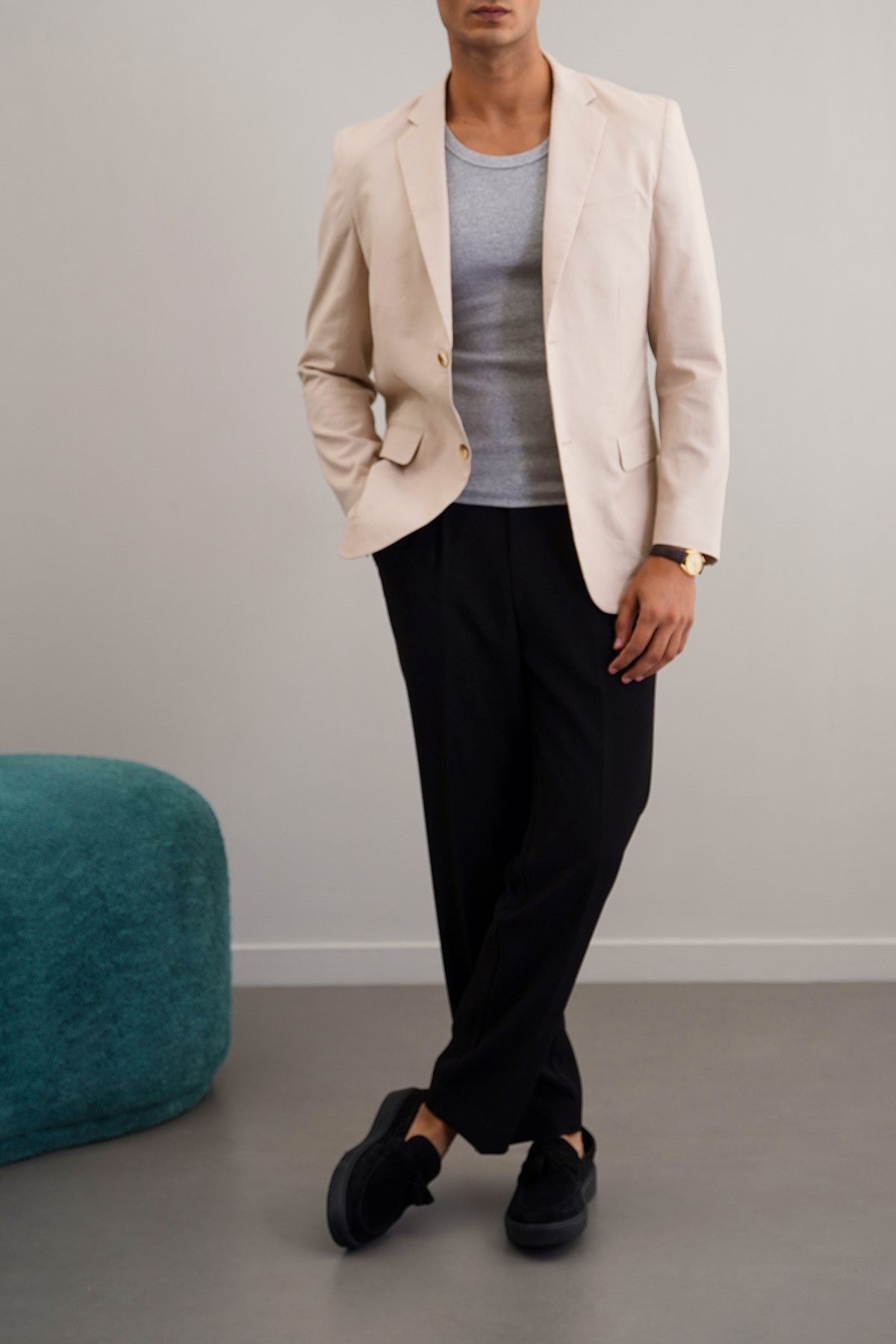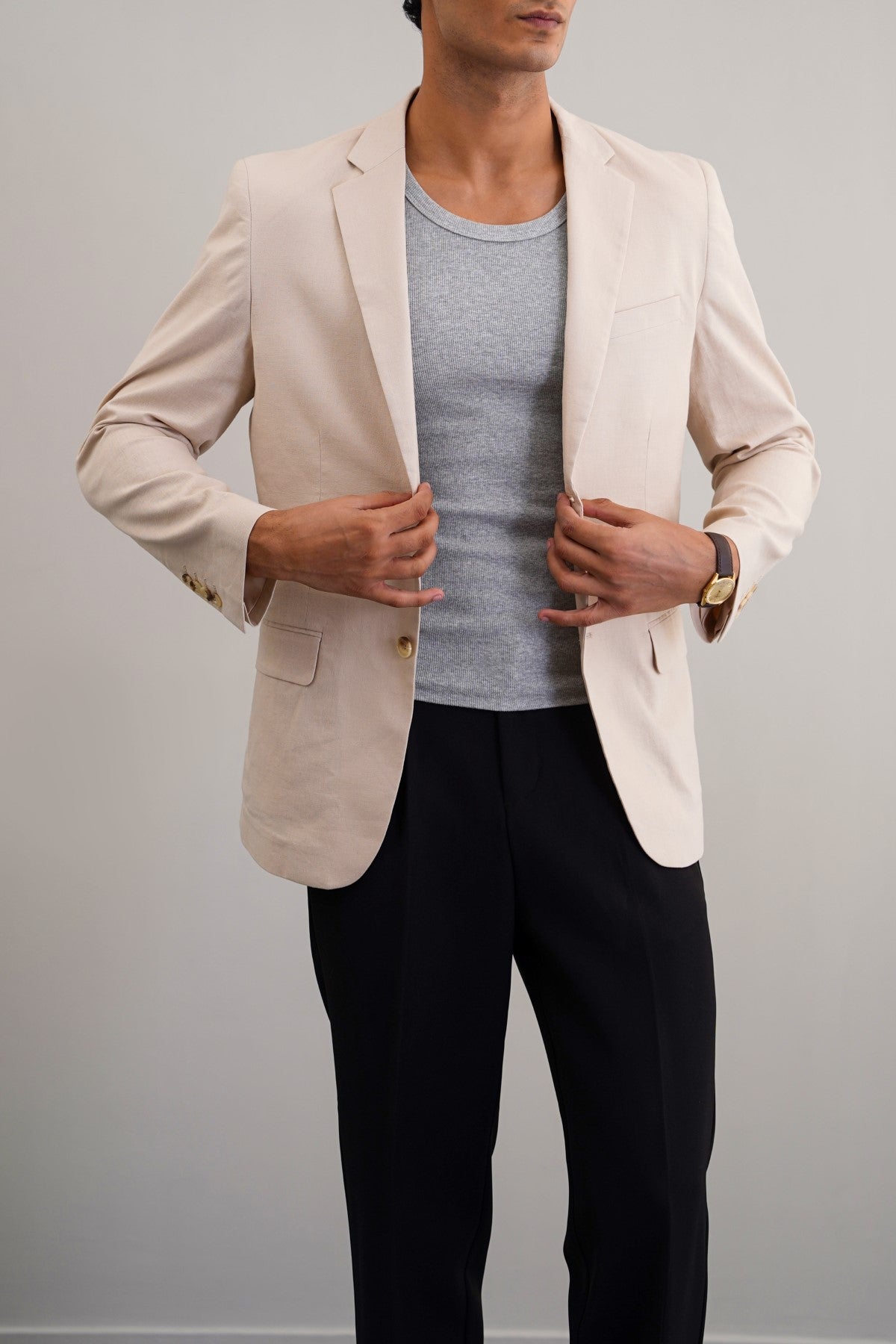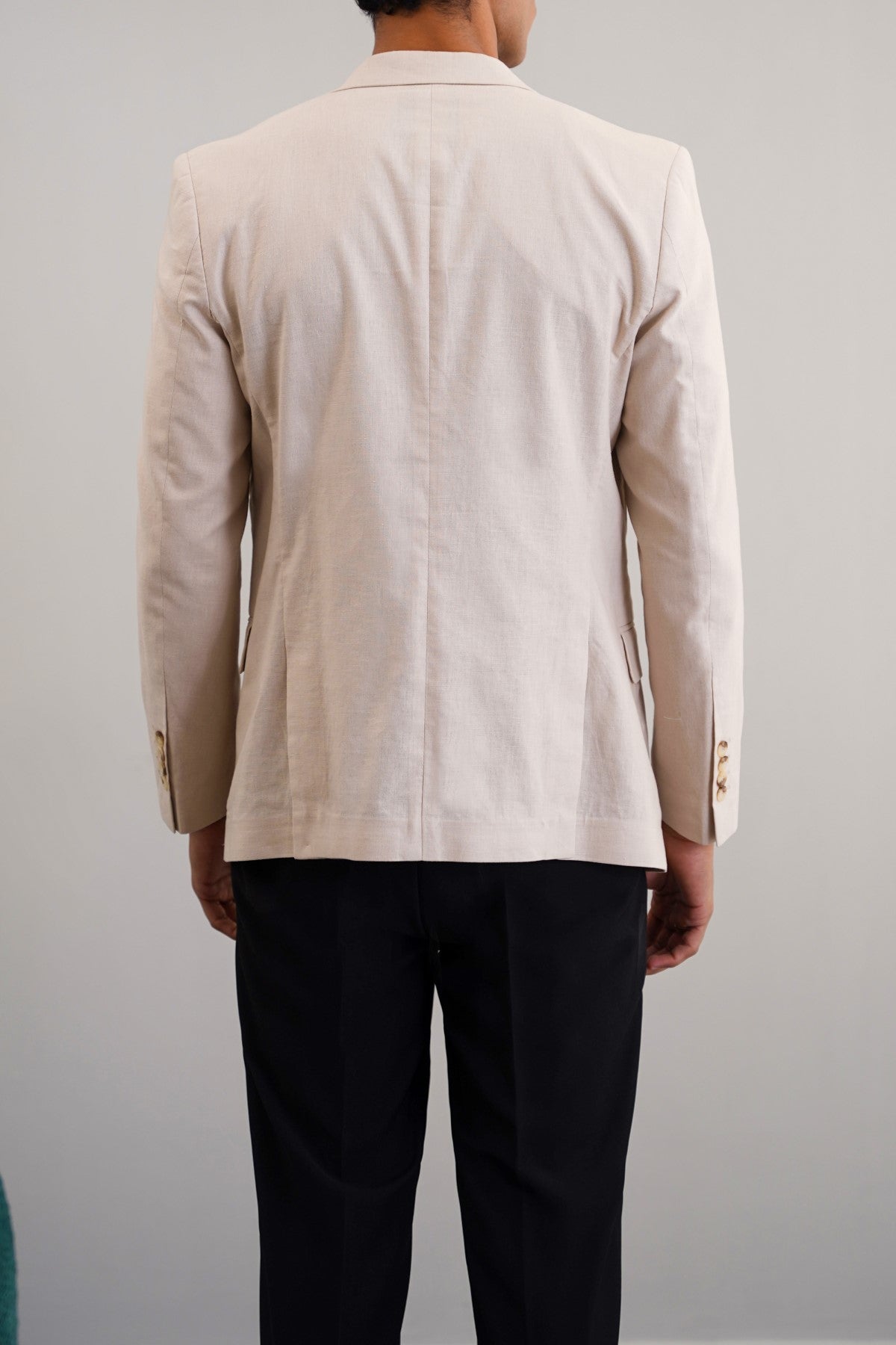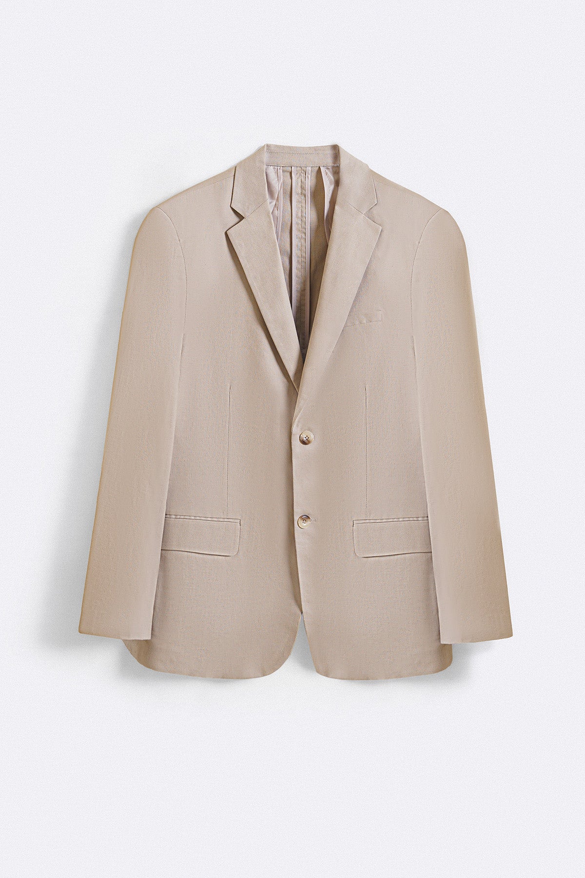 Design details: Light-weight, linen blazer without lining. Front button closure with side flap pockets and double rear vents.