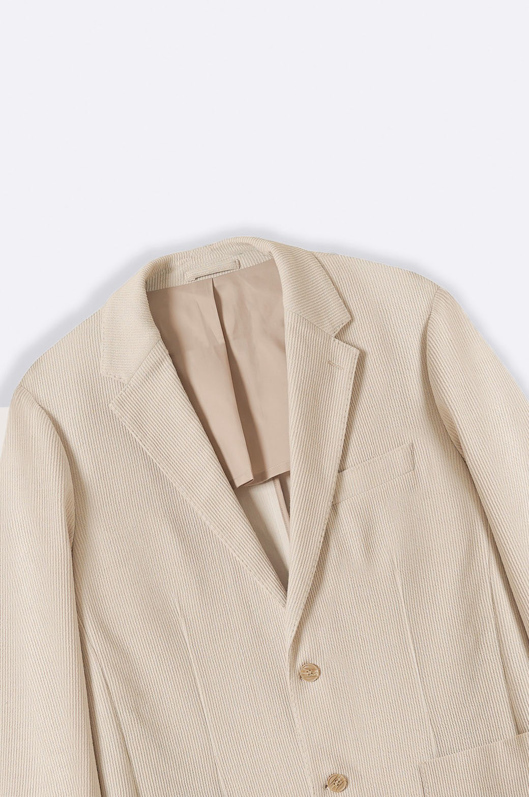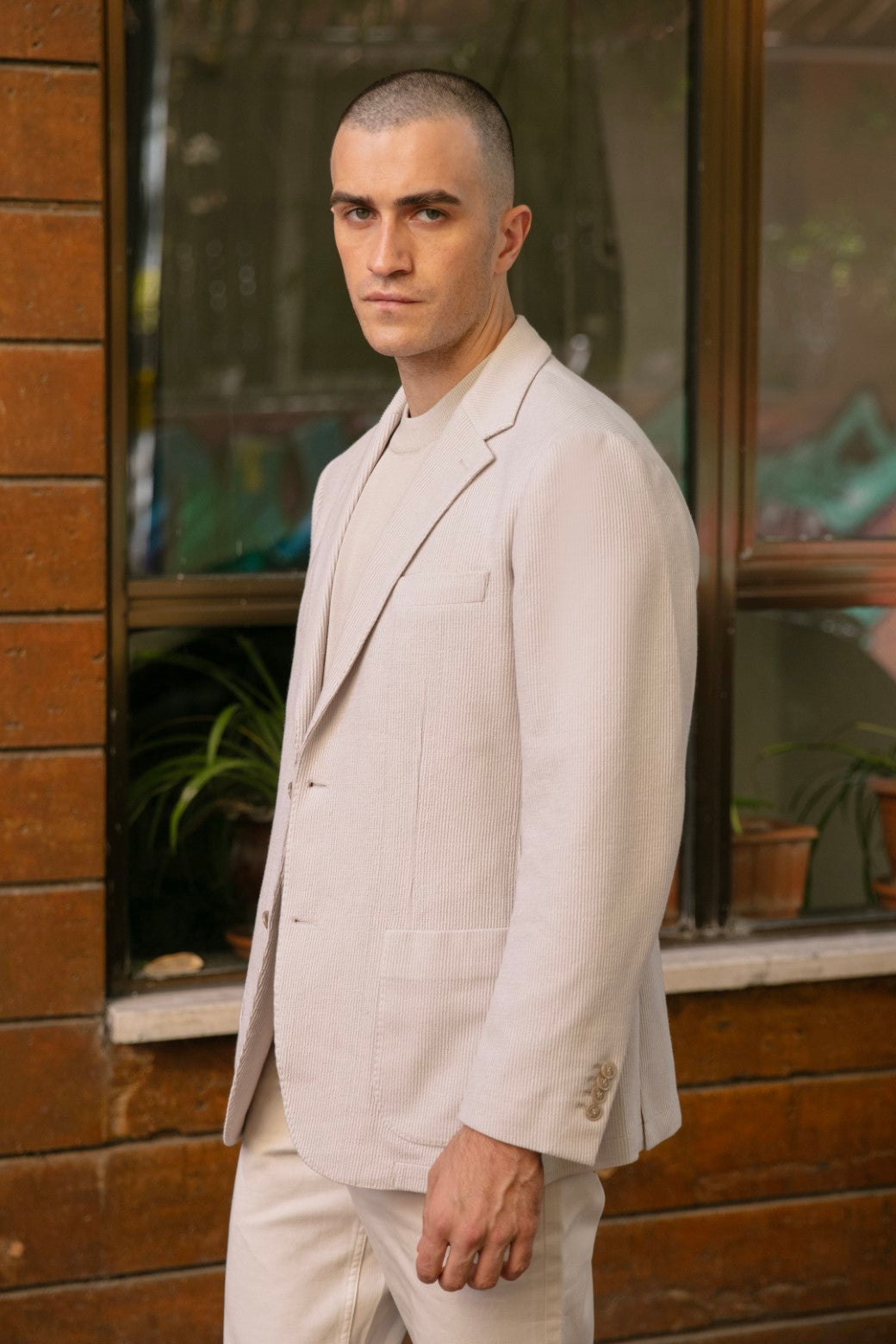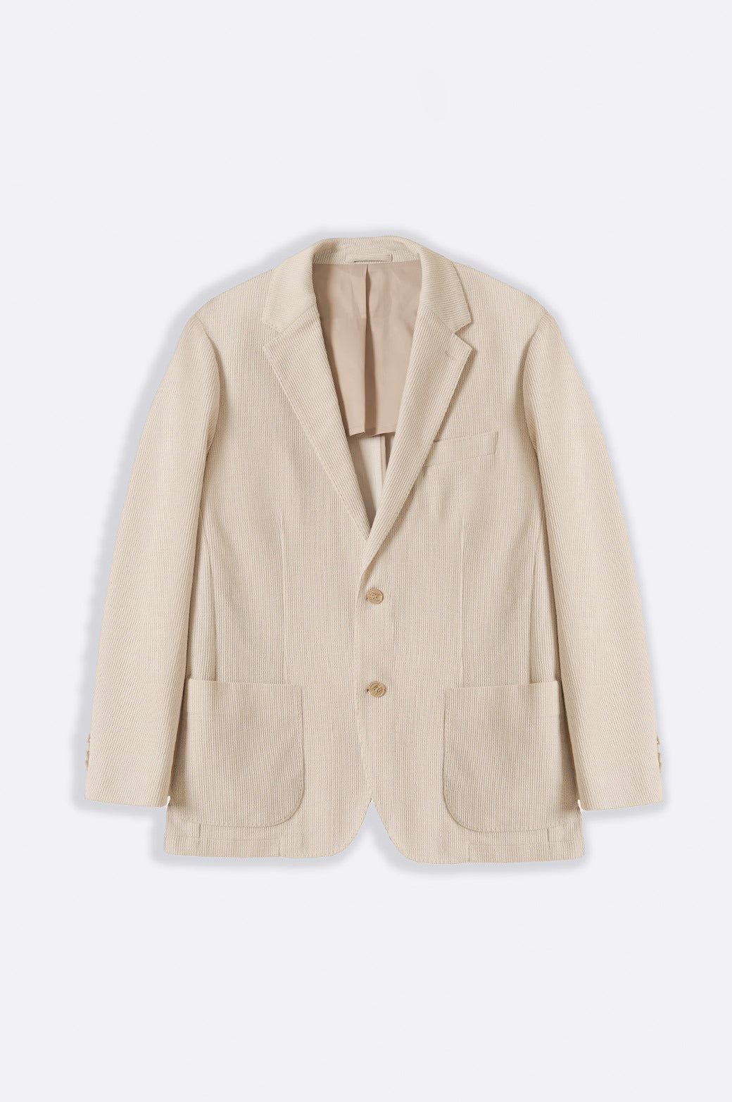 Design details: Single-breasted two-button textured blazer with notch lapel, patch pockets at front and one chest welt pocket. Front button closure and double rear vent.