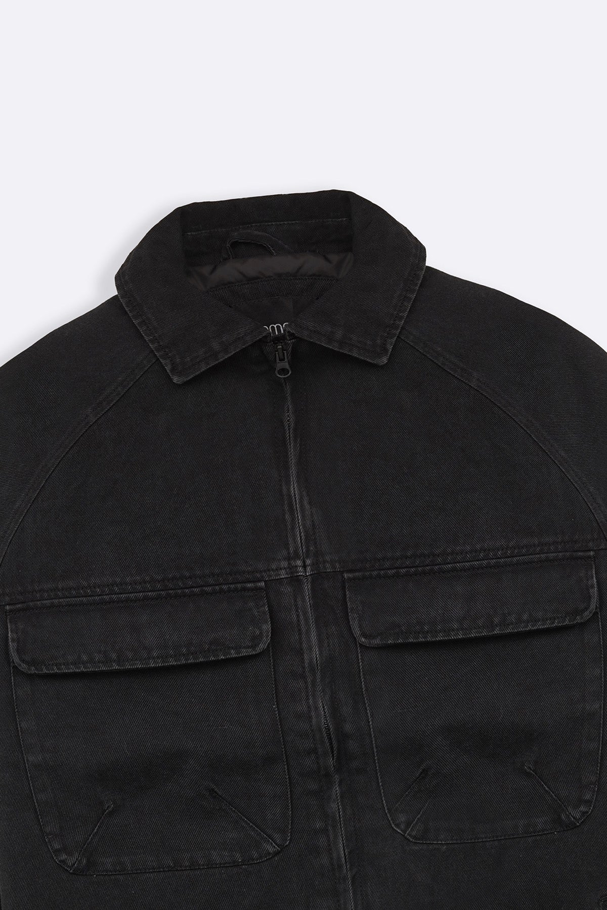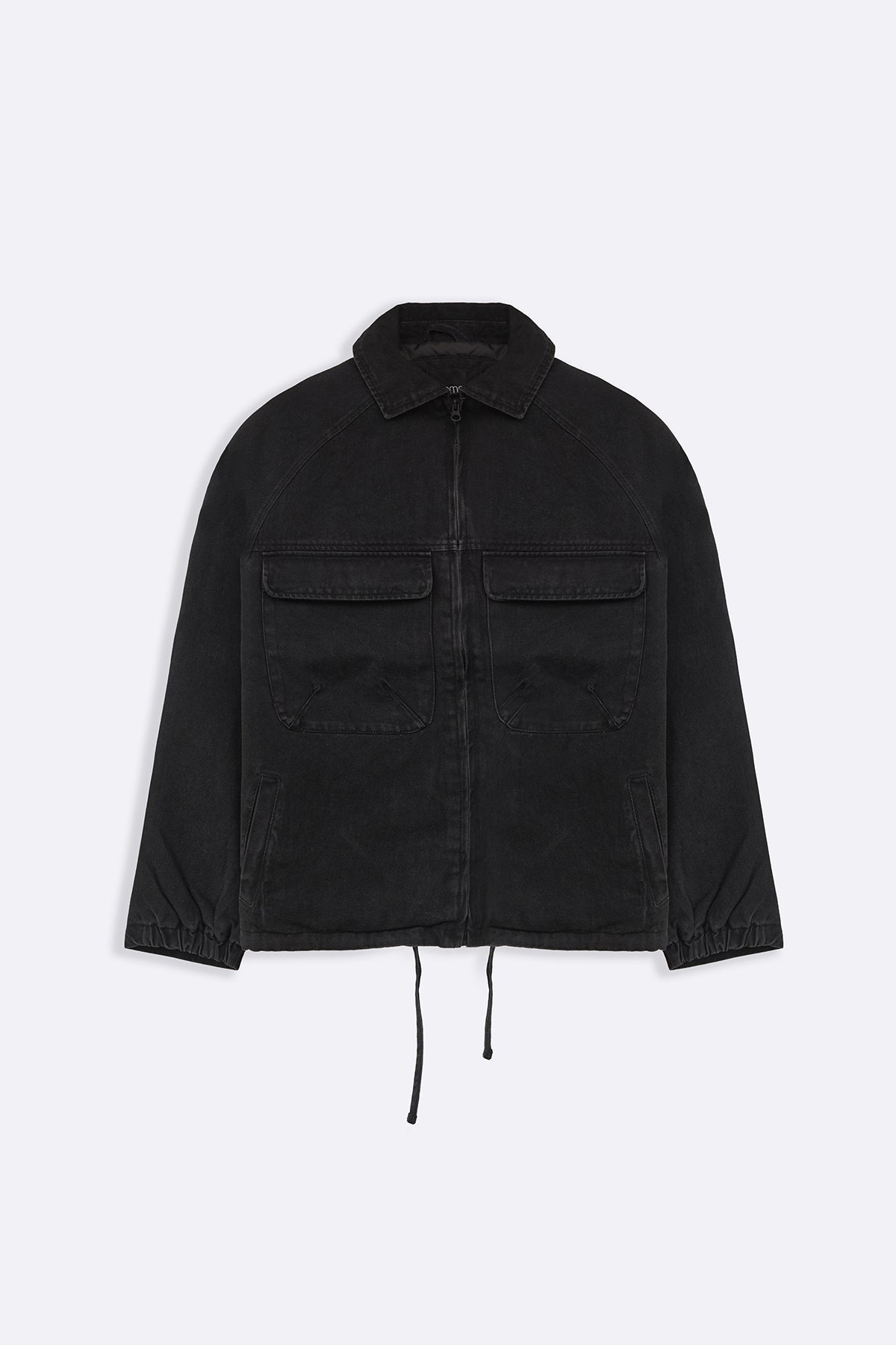 Design details: Oversized denim jacket with a collar, patch pockets with flaps at the front, raglan sleeves with elasticated cuffs and front zipper closure.