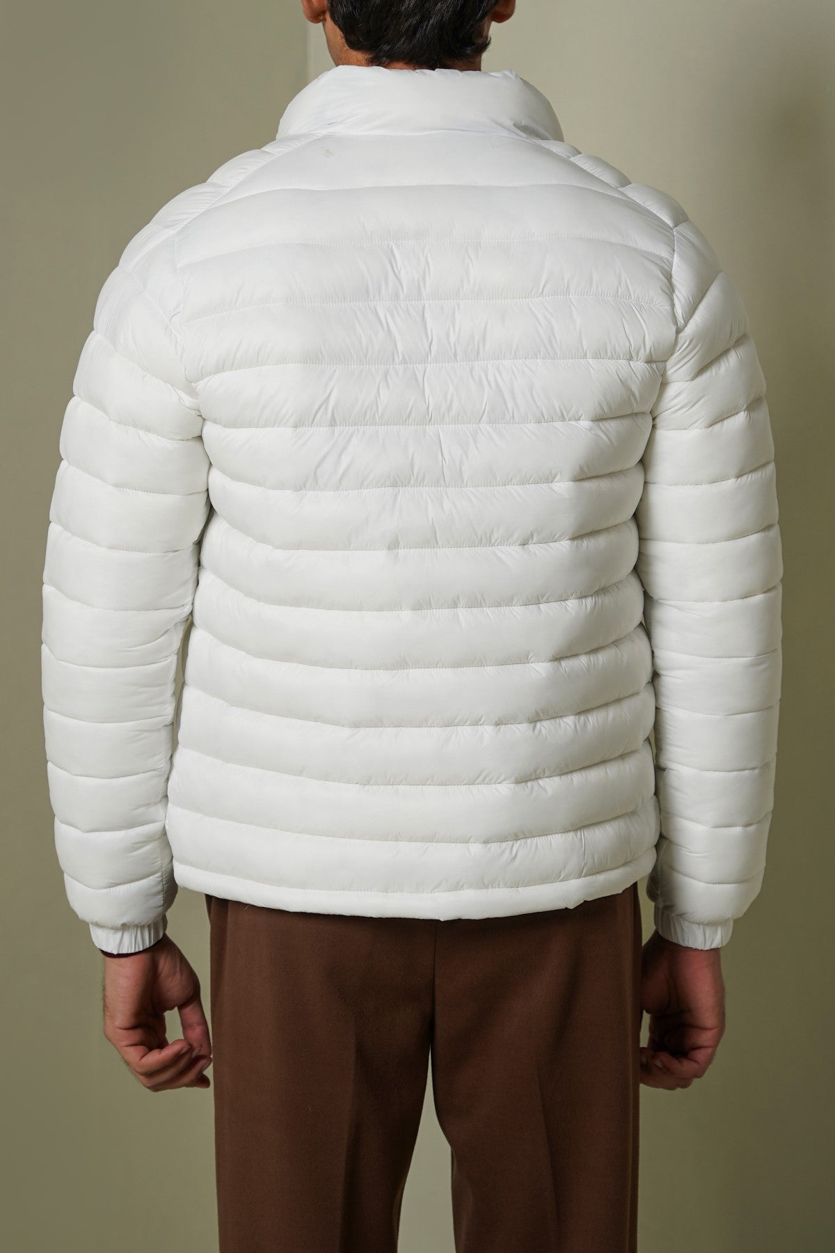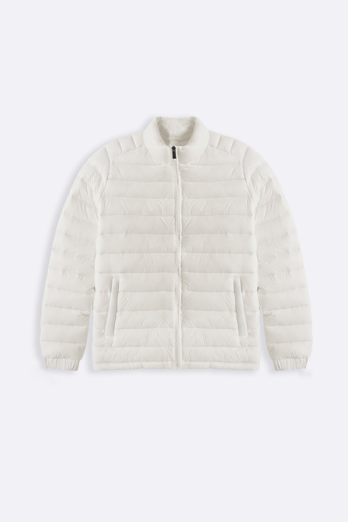 Design details: light weight puffer jacket with mock neck, bone pockets and zipper closure at the front.