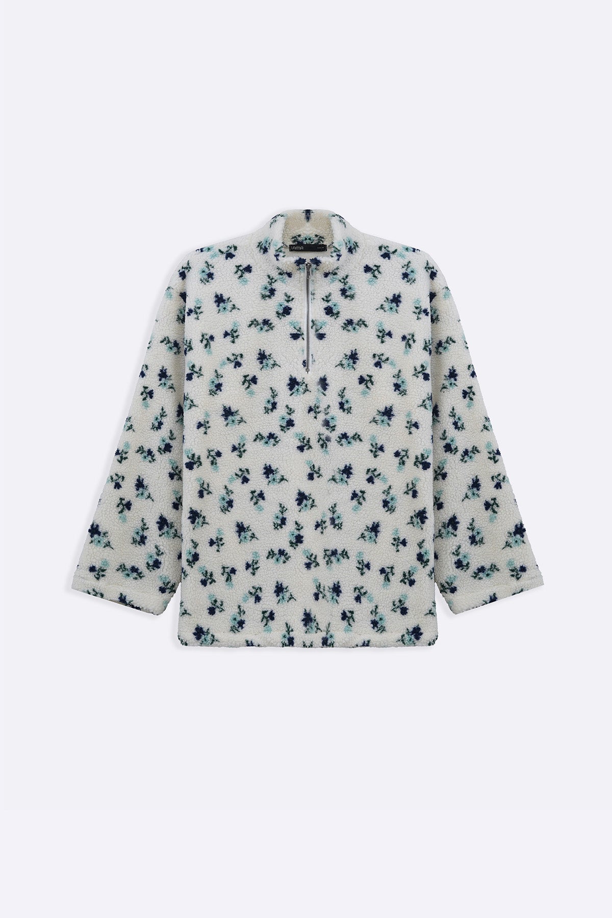 Design details: Relaxed-fit sherpa with full sleeves, pockets, a quarter-zip front, and a bungee-cord detail at the hem.