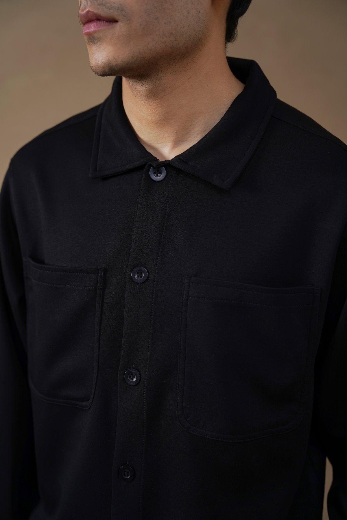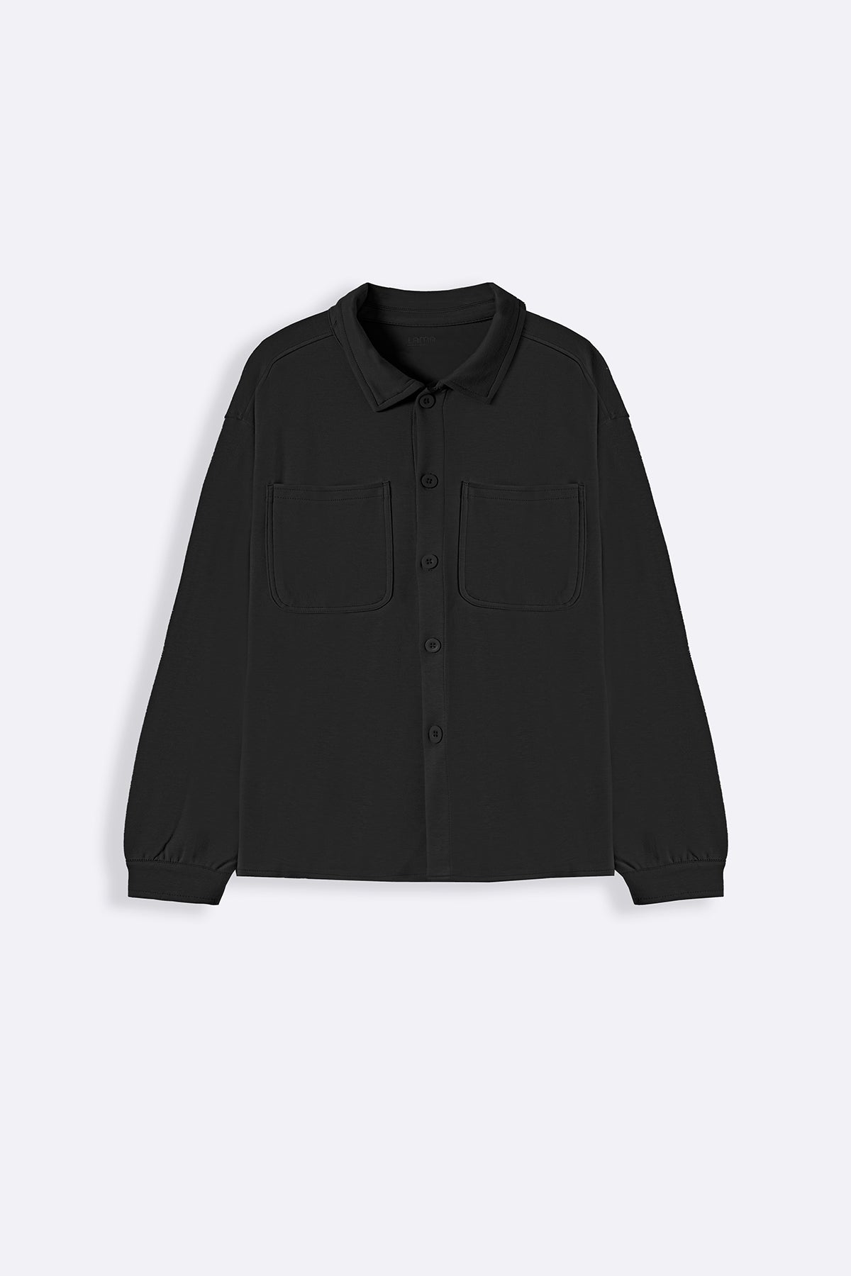 Design details: Neoprene shacket with front patch pockets and front button fastening