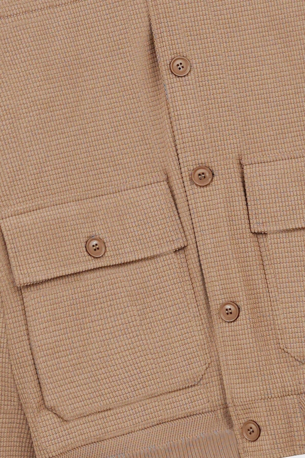 Design details: Non-structured waffle textured jacket, ribbed mock neck, hem, cuffed sleeves, two buttoned patch pockets with flaps and front button closure.