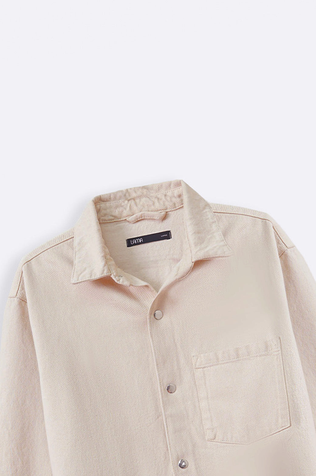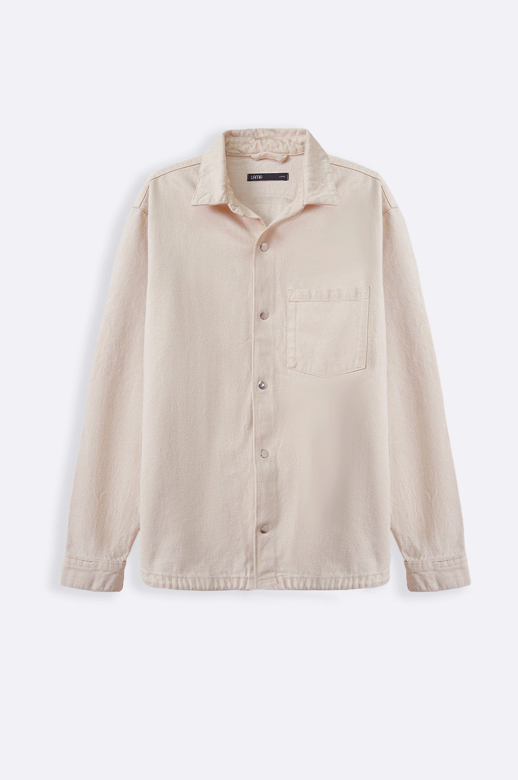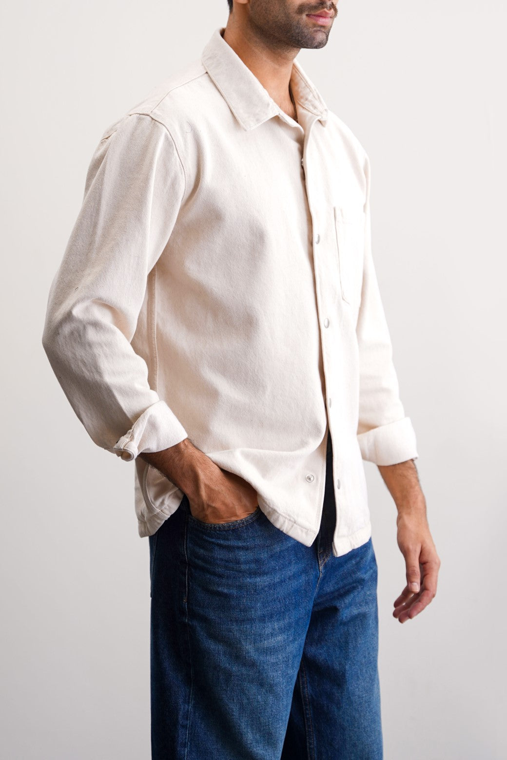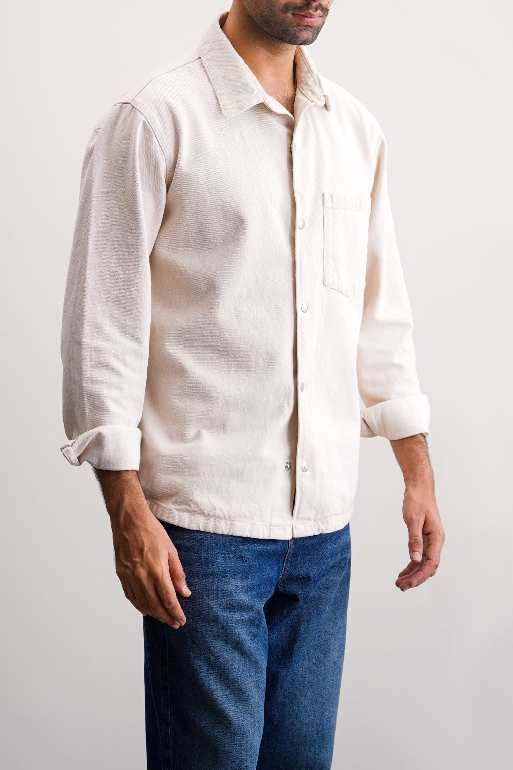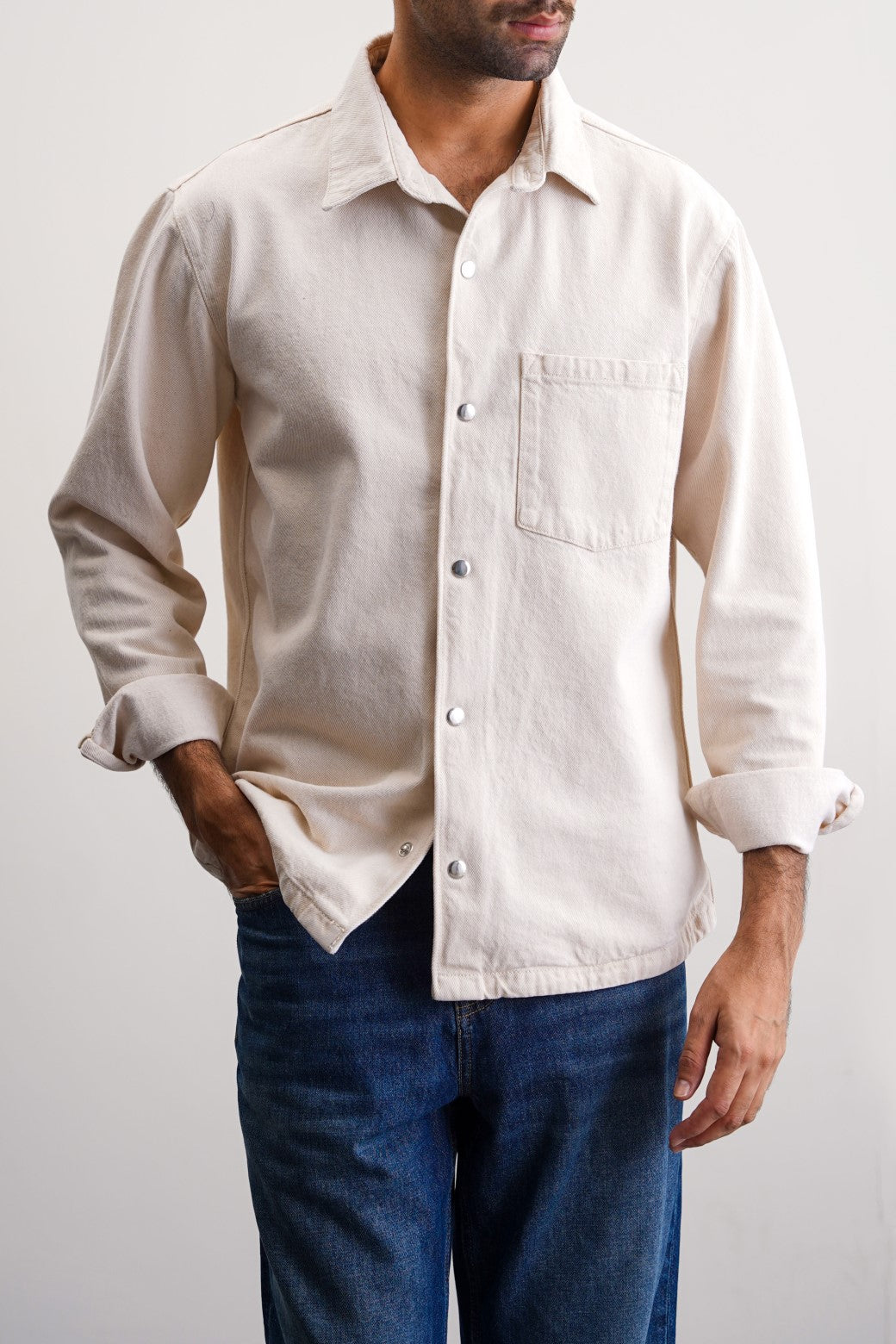 Design detail: Denim shacket with patch pocket, cuffed sleeves and collar. This shacket comes with metallic snap buttons on front and cuffs.