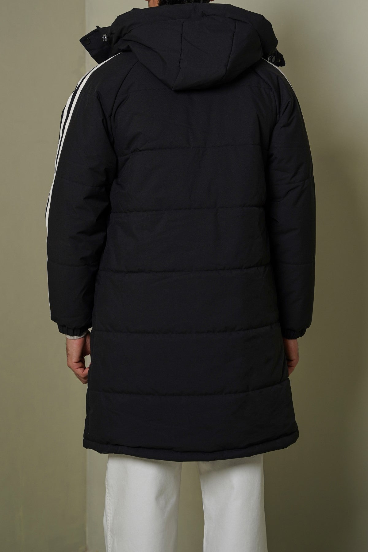 Design details: Long puffer coat with zipper and snap button closure at the front. Adjustable hood, raglan sleeves and front bone pockets.