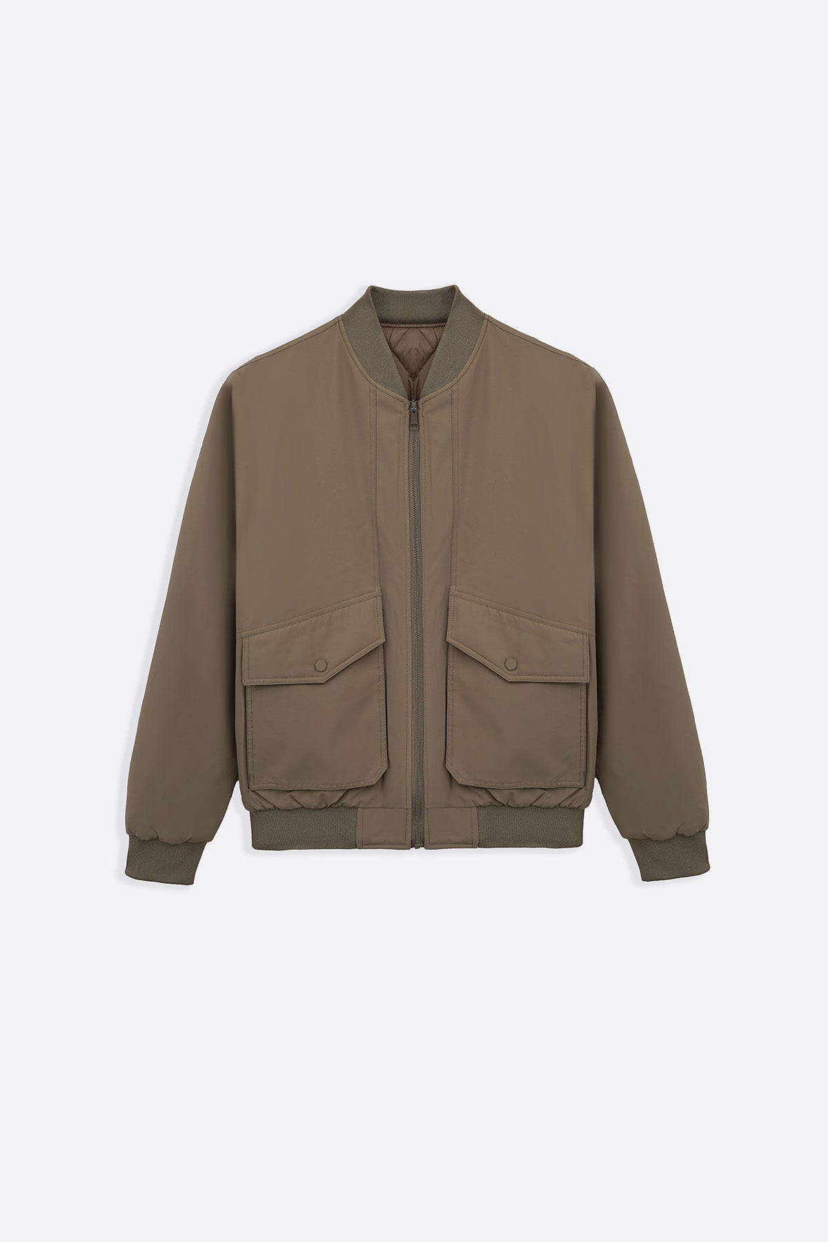 Design details: Reversible bomber jacket with a quilted interior, buttoned pouch pockets with flaps, side pockets and a sleeve pocket. Ribbed cuffs, collar and hem. Front zipper closure.