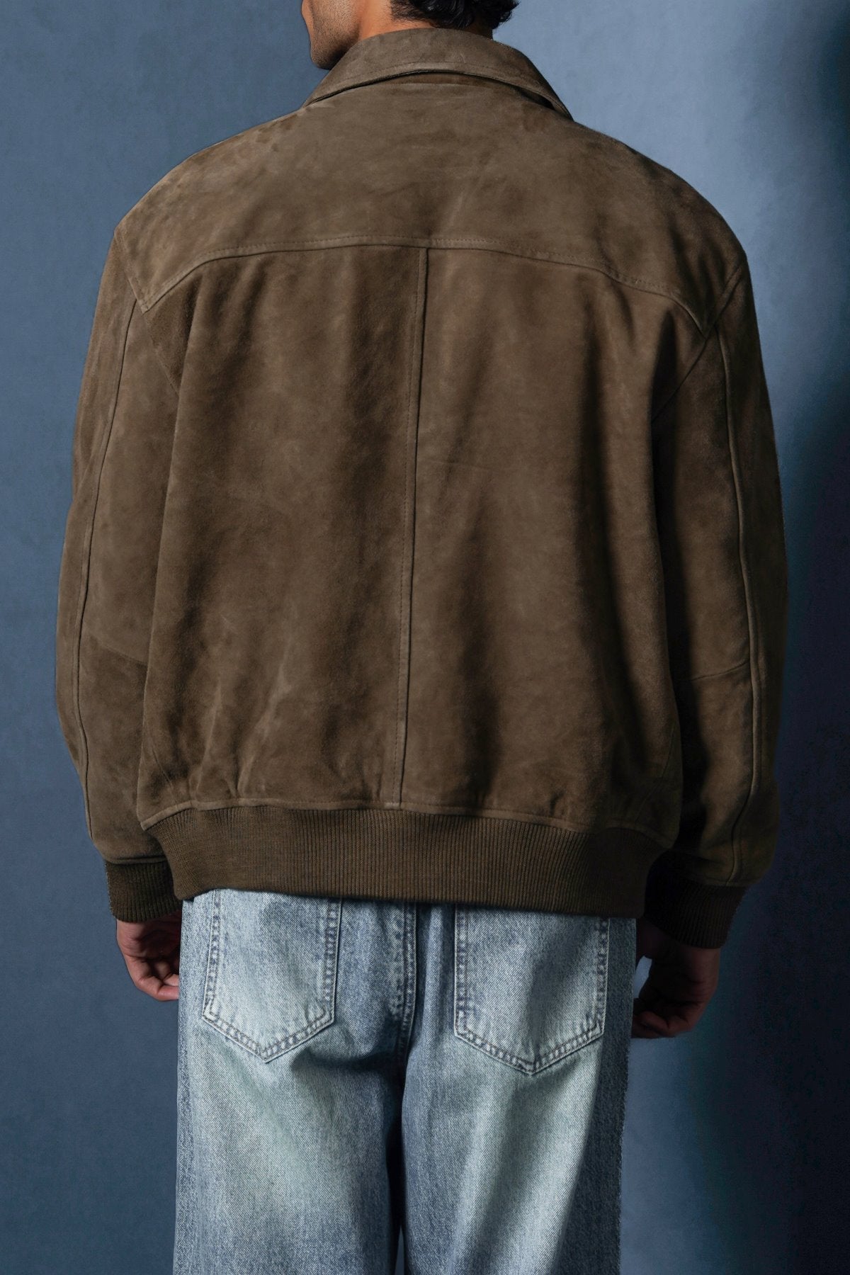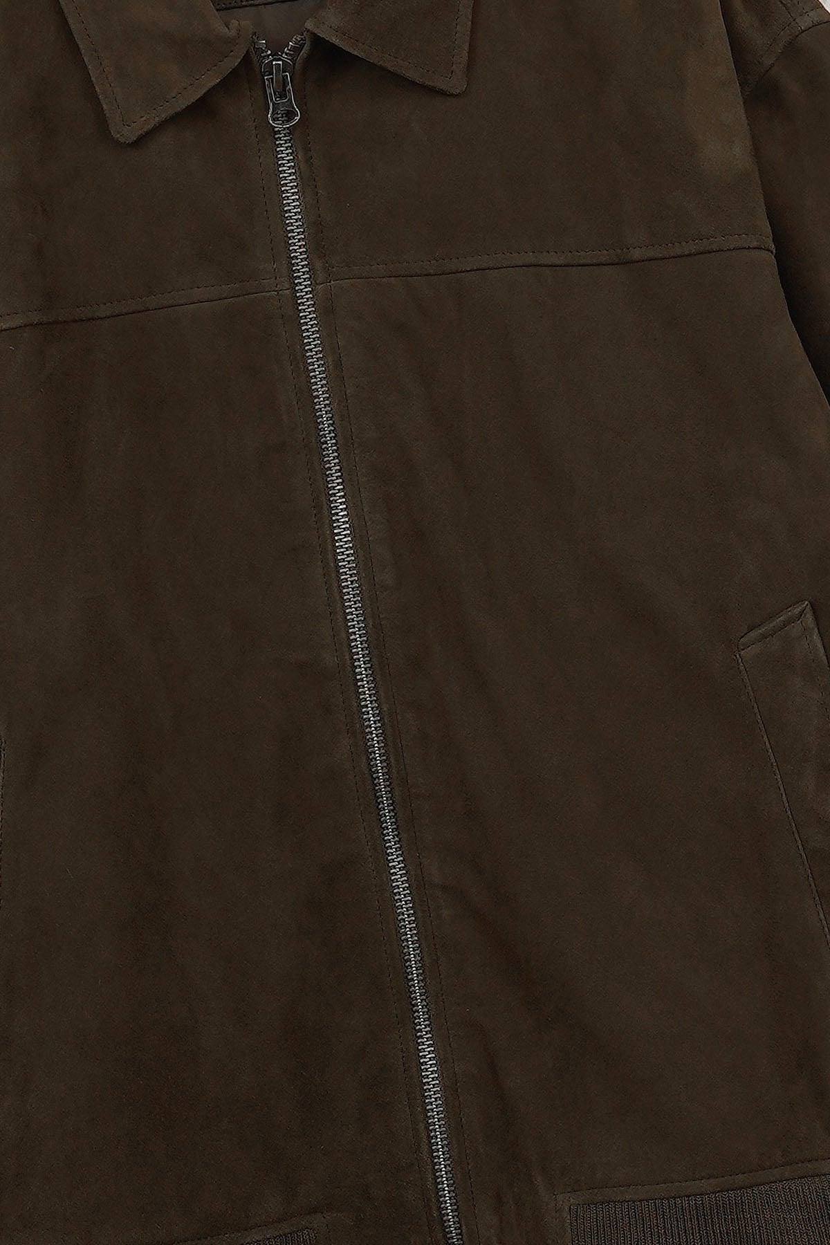 Design details: 100% leather-suede jacket with ribbed cuffs, two bone pockets and a gun metal zipper closure.